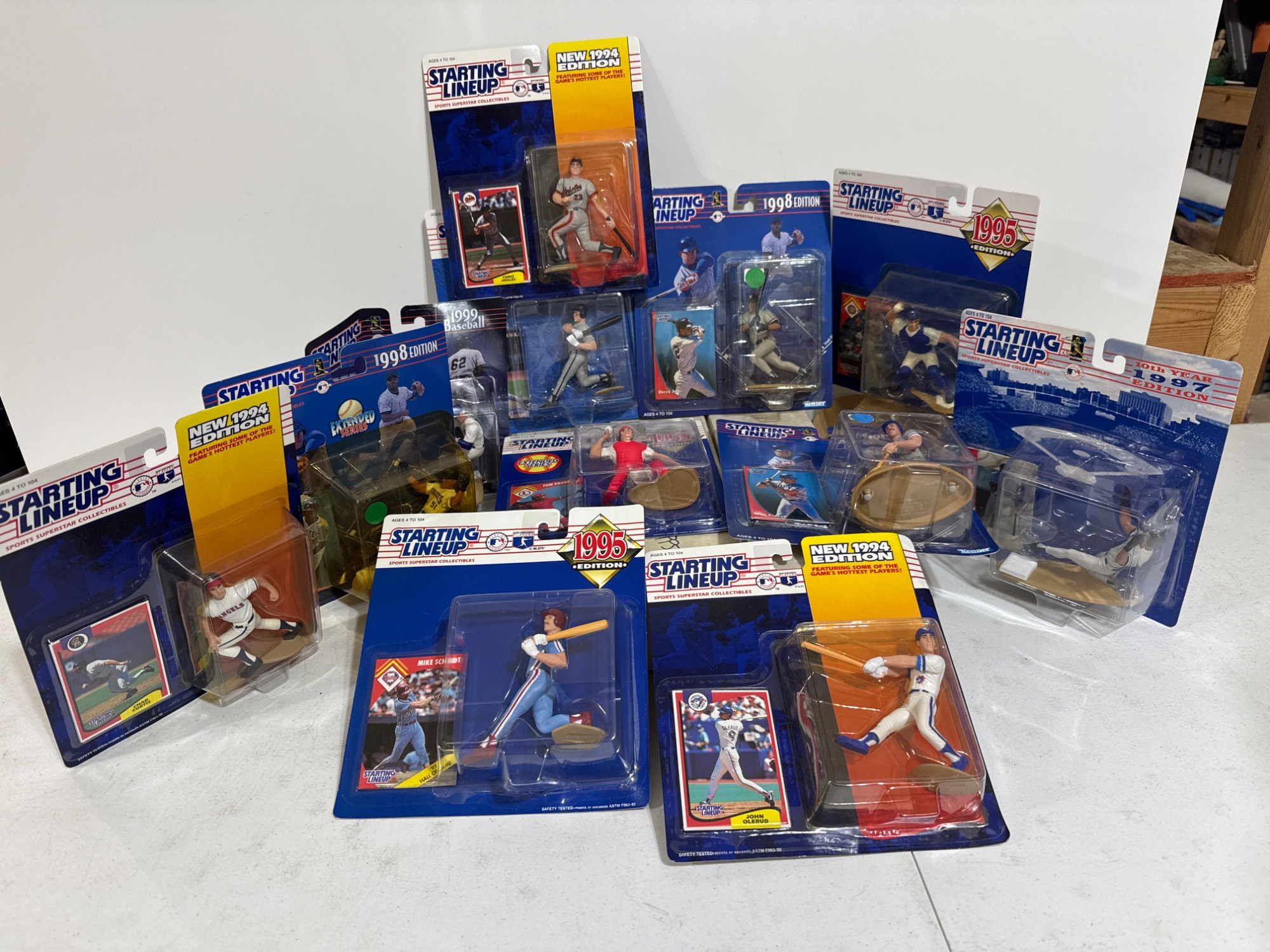 NIB. Starting Lineup Action figures. Action figures include collector cards. Three boxes of trading cards. Completeness not verified. A few mixed sports cards included. Randy Johnson, Jamie Moyer, Andy Gladden, Frank Bush, Mark Portugal, Len Dykstra