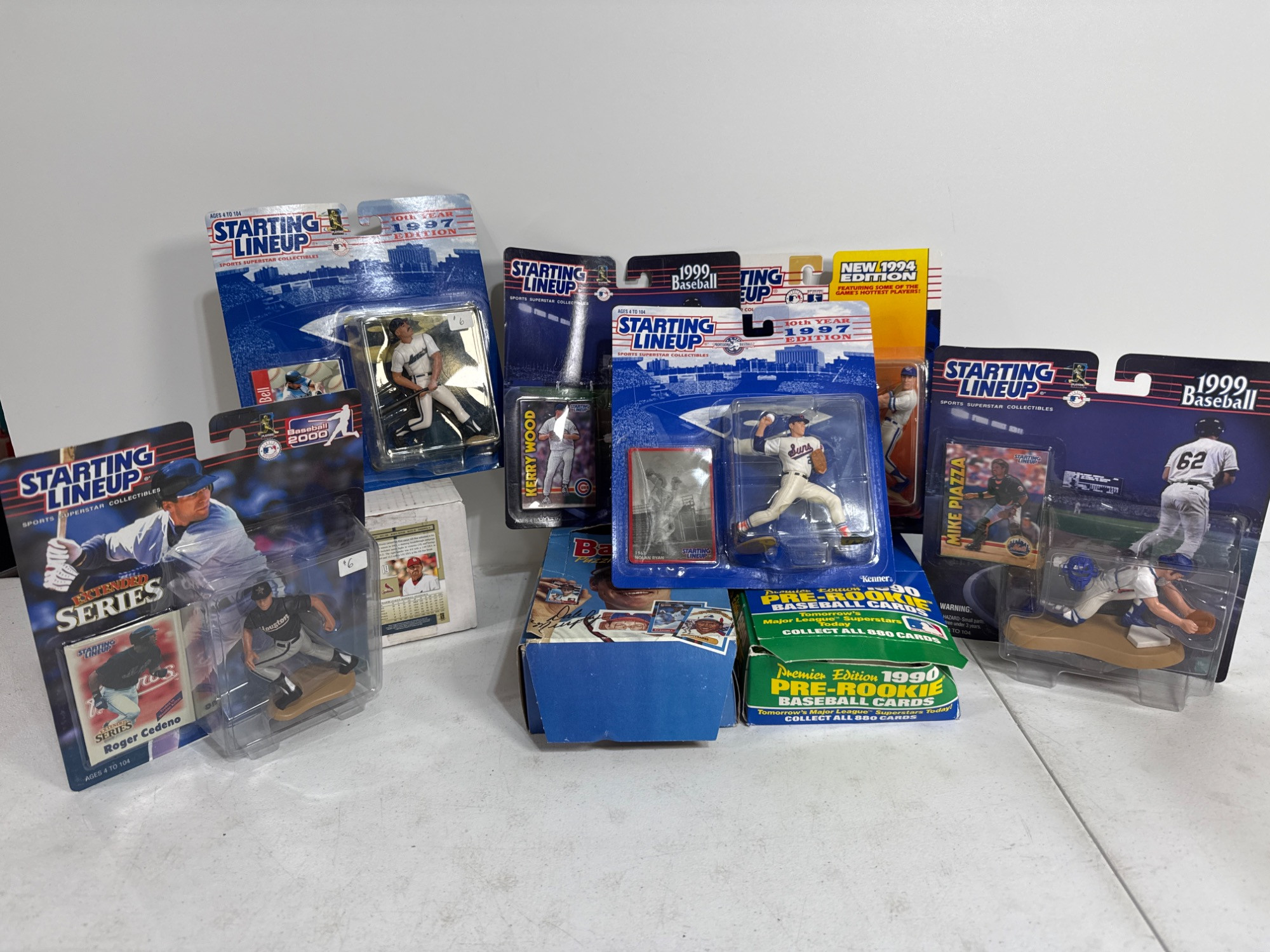 Six Starting Lineup collectible action figures. NIB and includes collector cards. Two cases of individual pack trading cards. Don Ross and Premier edition. Third box of baseball trading cards. Cannot confirm completeness. Juan Nieves, Fernando Valenzuela, Darren Daulton are a few.