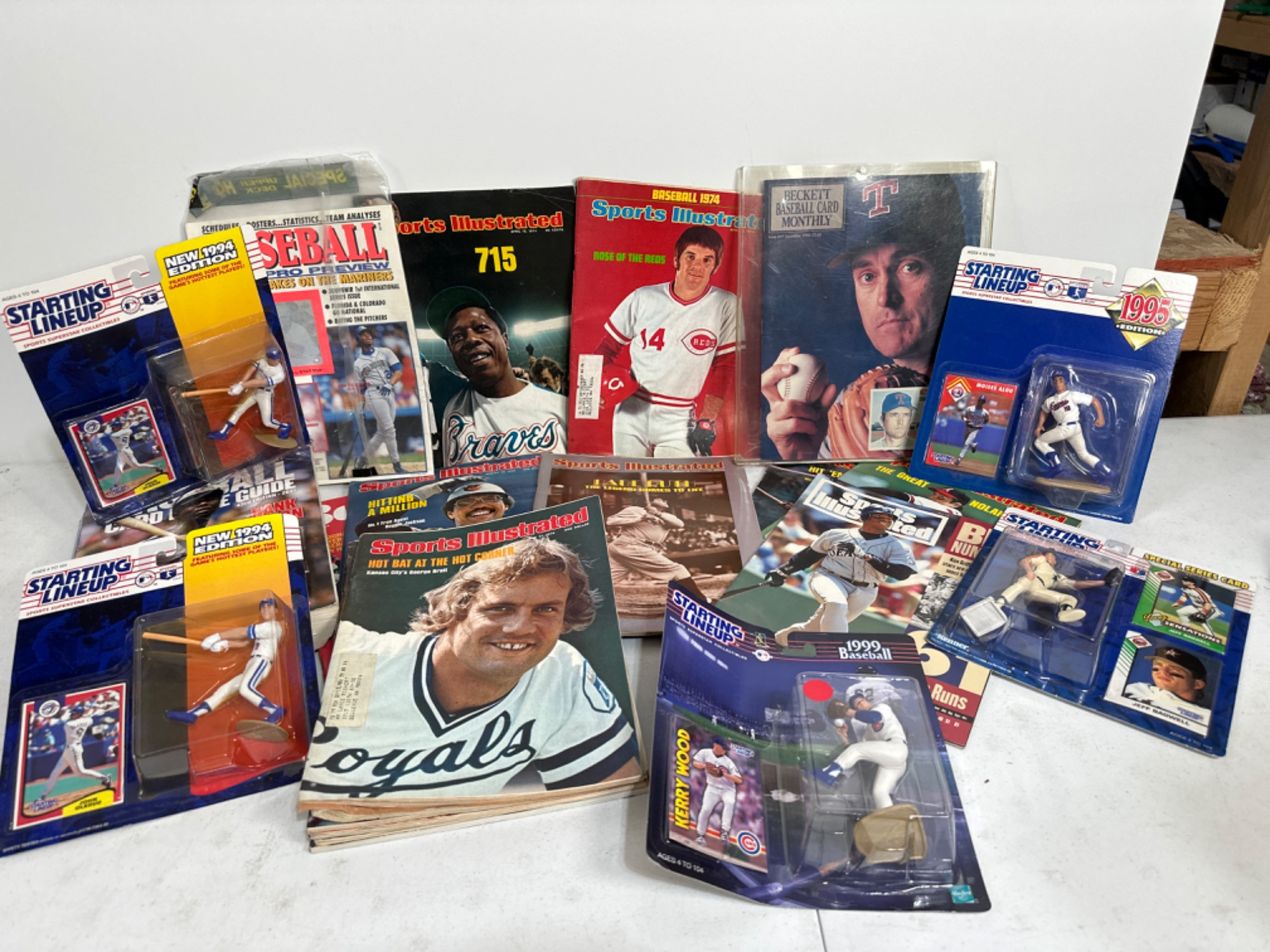 Vintage Sports Illustrated baseball magazines. Huge Baseball card guide. NIB Starting Lineup baseball collectibles. Two are duplicates. Vintage magazines highlight legends of the game: Pete Rose, Hank Aaron, Nolan Ryan, Ken Griffey Junior, Reggie Jackson, Babe Ruth, George Brett, and more. Several are in sleeves.