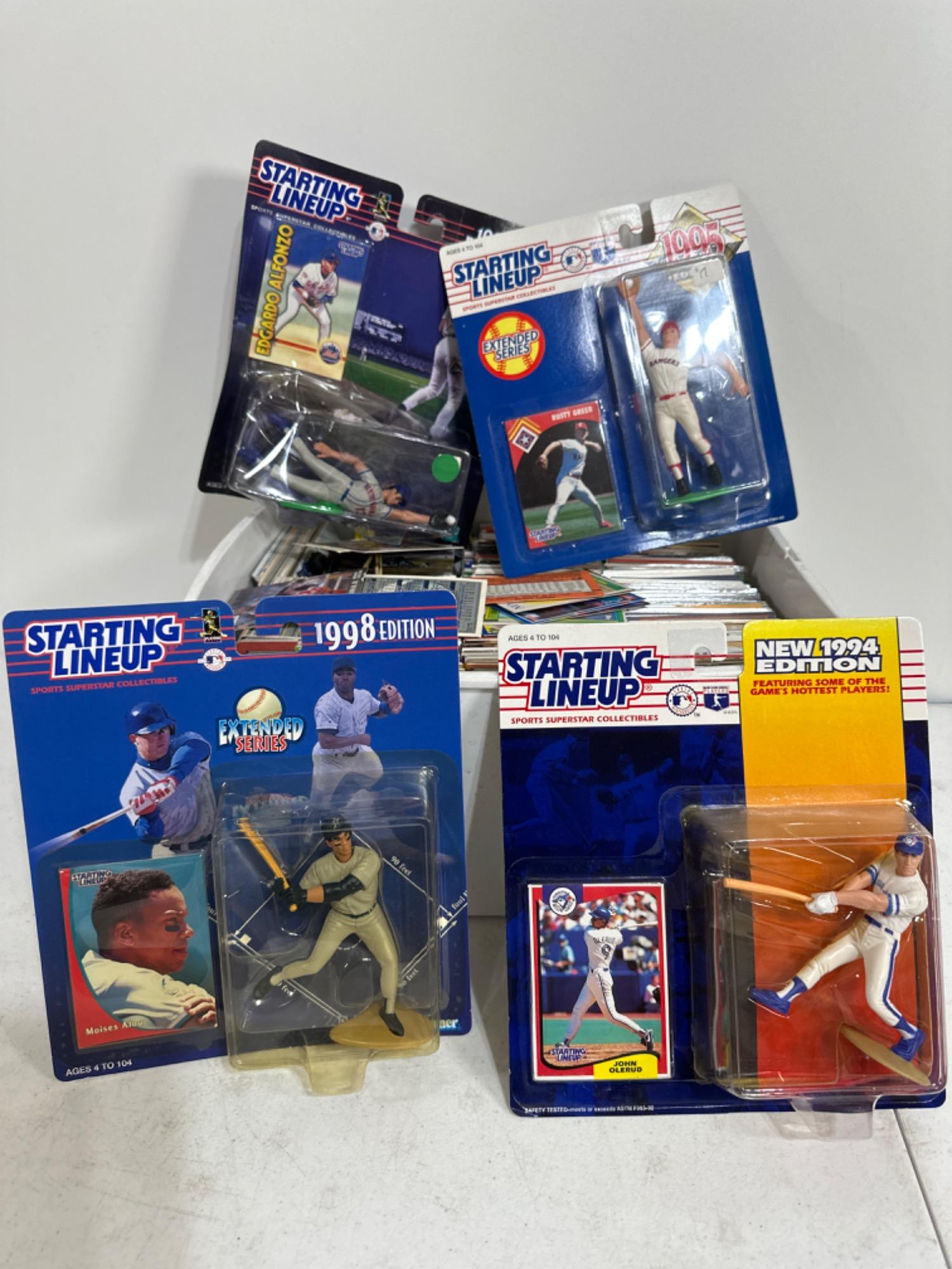 Four Starting Lineup collectible figures. One package has been crushed a little. John Olerud, Moises Alou, Rusty Greer, Edgardo Alfonso. Plastic tote with layers and layers of sports training cards. Variety of brands and series. Basketball, Football and Baseball.