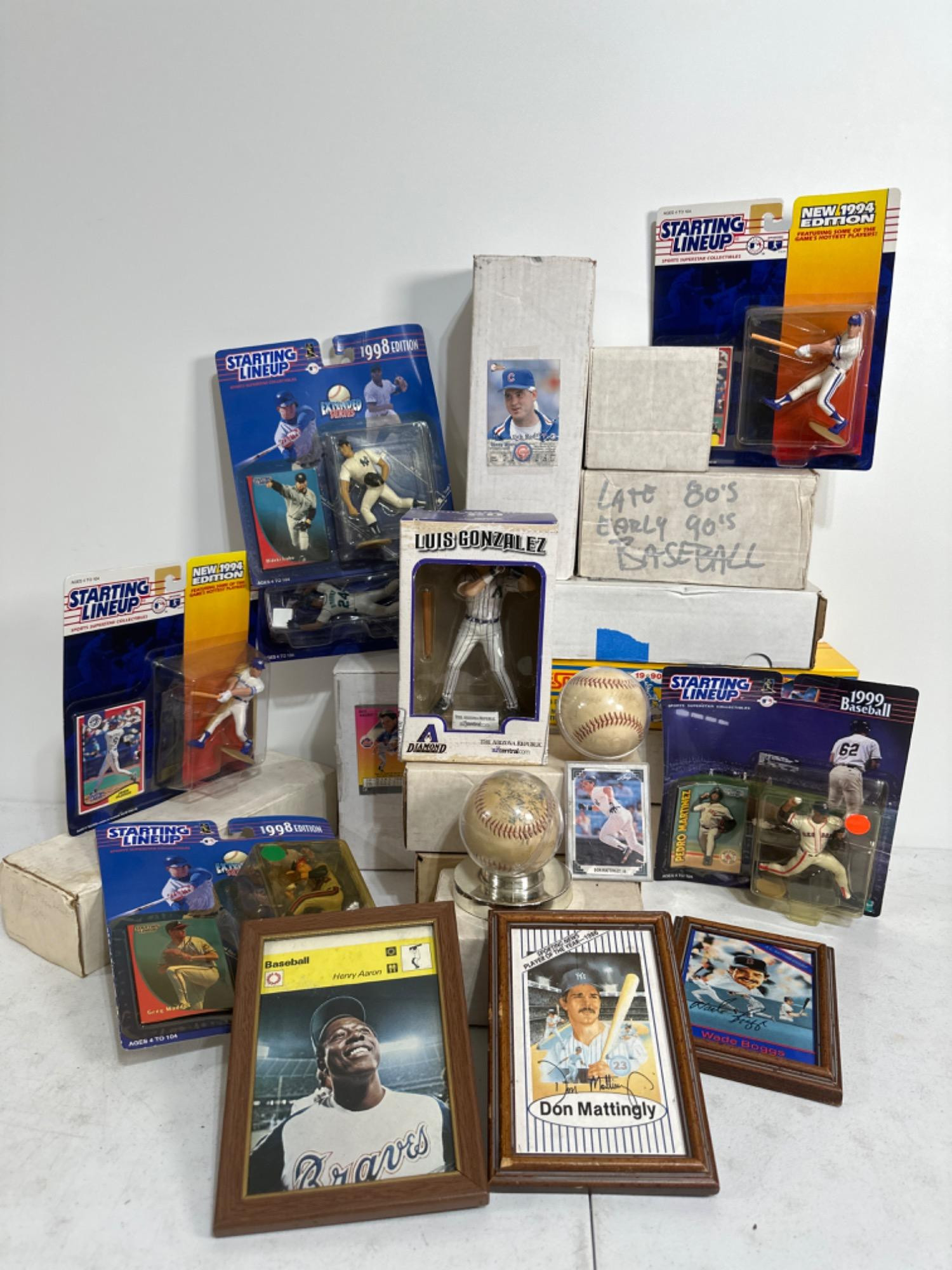 NIB starting lineup baseball collectible figures. Three framed pictures of baseball icons. Two with autographs. Don Mattingly and Wade Boggs. Two signed baseballs. One signed by Dave Winfield and Franco Harris. One with signatures has some damage to signatures. Luis Gonzales action figure. Multiple boxes of Baseball Cards. Cannot confirm completeness.