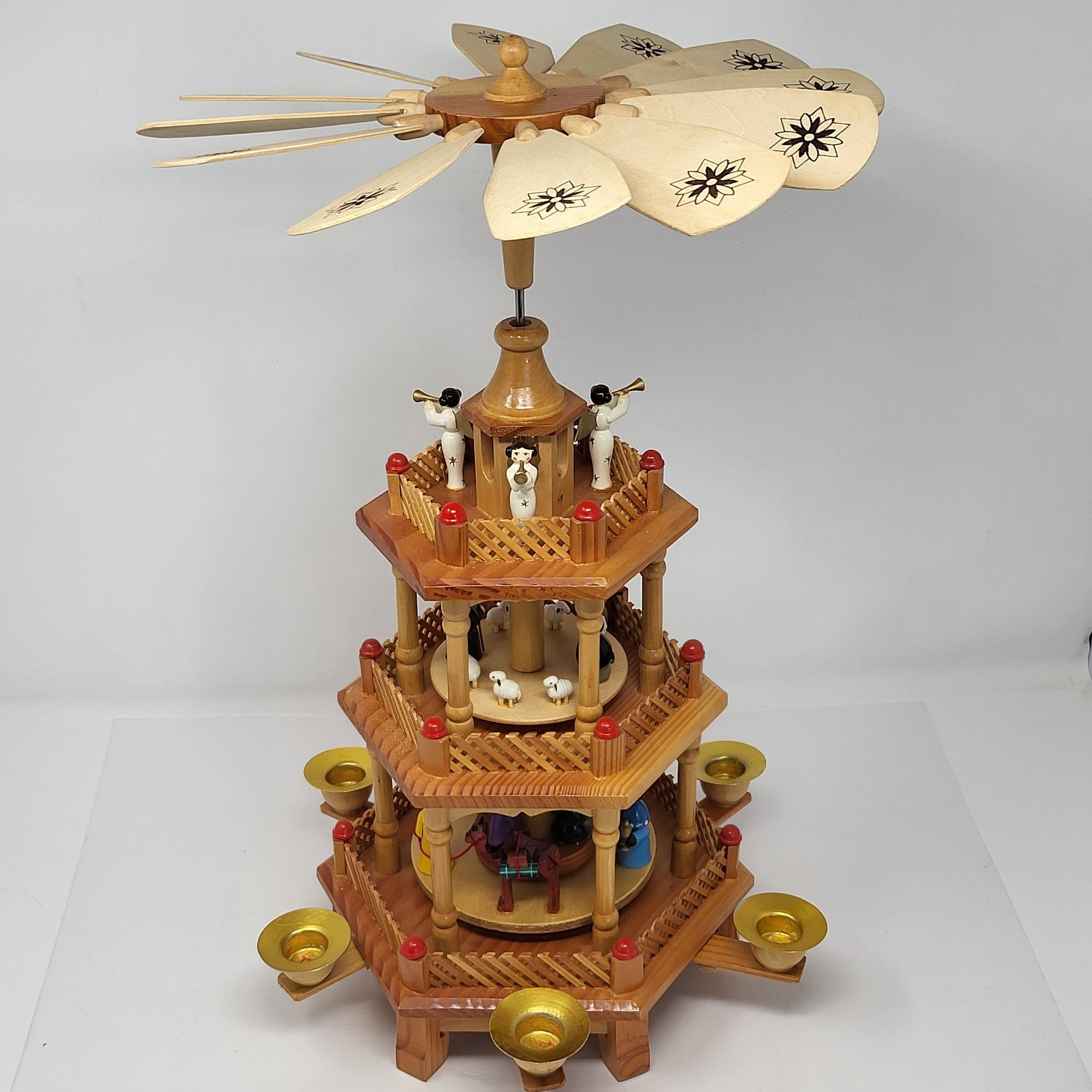 Lillian Vernon three tier Christmas carousel that turns as candles are lit and burn down. Three boxes of 6 candles in each box.