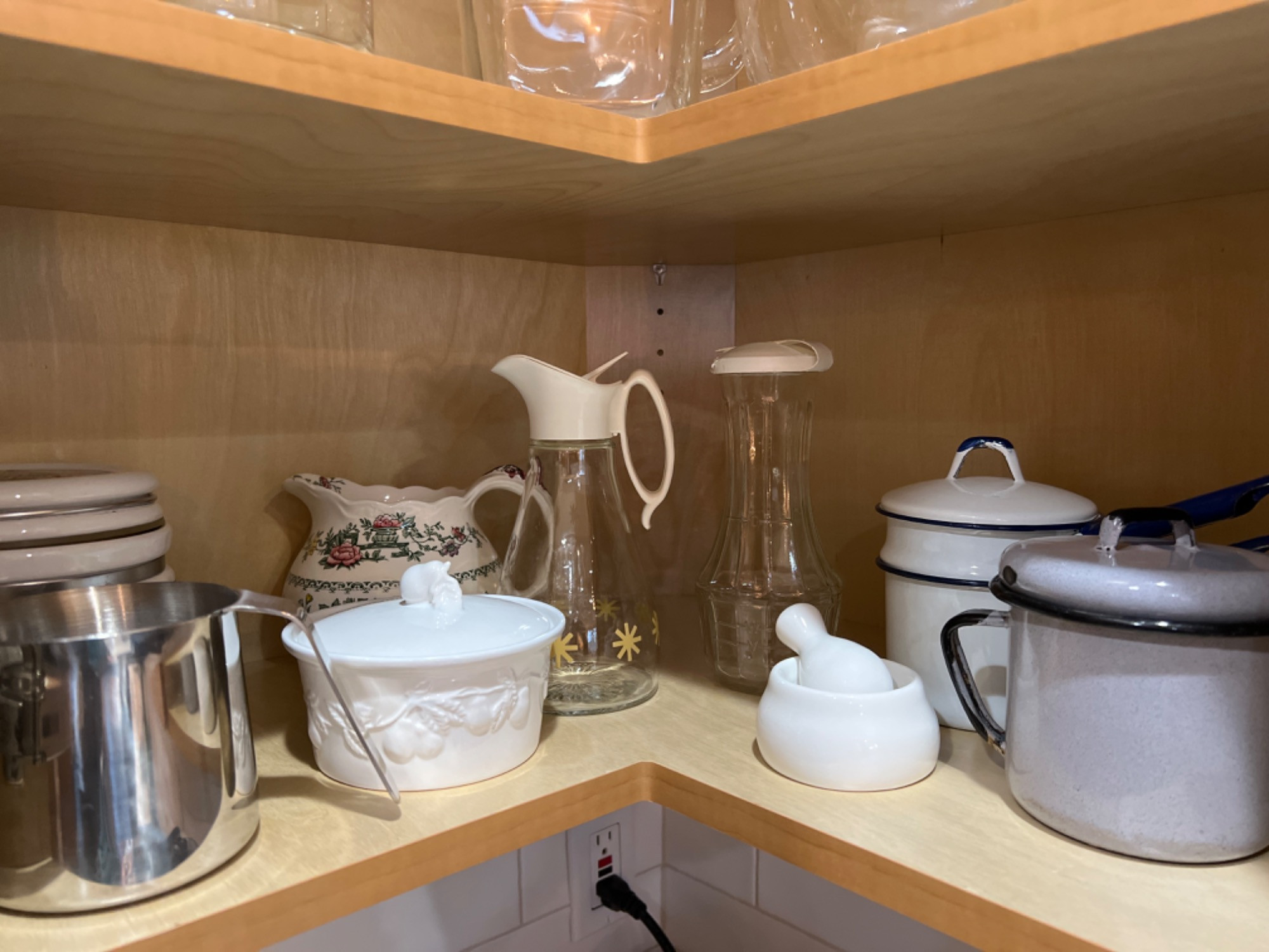 Everything you see in this cupboard is included. Vintage Log Cabin syrup pitcher; Good Seasons glass dressing carafe; and many more vintage items. Sizes range from 2” to 11” tall.