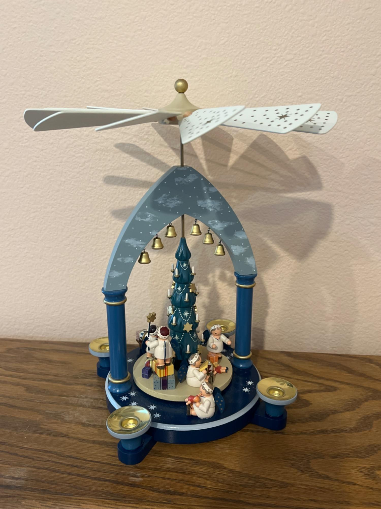 Hand painted blue, Erzgebirgische Volkskunst, Germany Christmas pyramid carousel that turns when candles are lit.