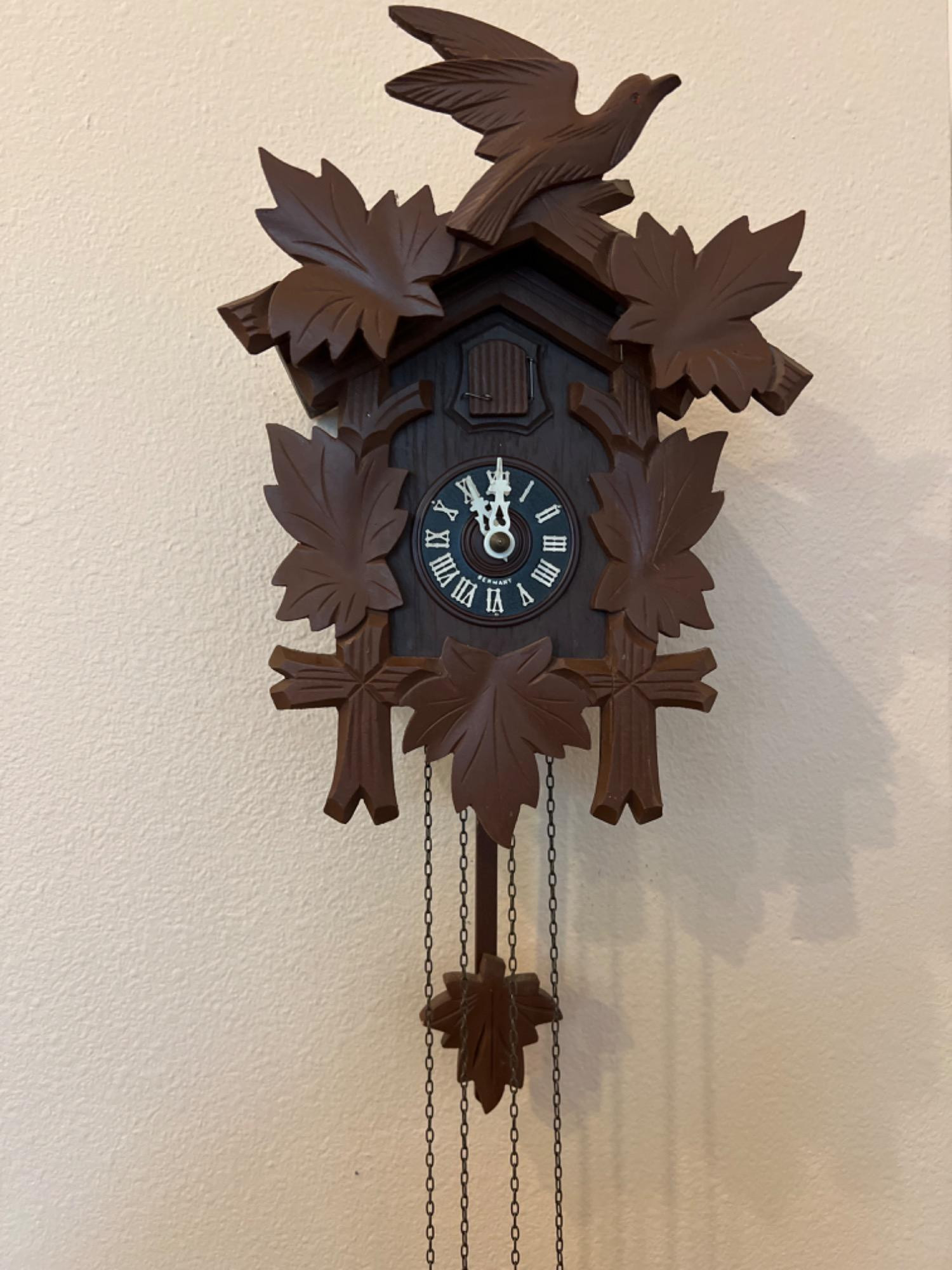 Hubert-Herr movement in this vintage cuckoo clock. All parts present. The clock is currently not running and will need to be serviced. The chains loose and off the gear to wind the clock. Otherwise, this clock is in like new condition.