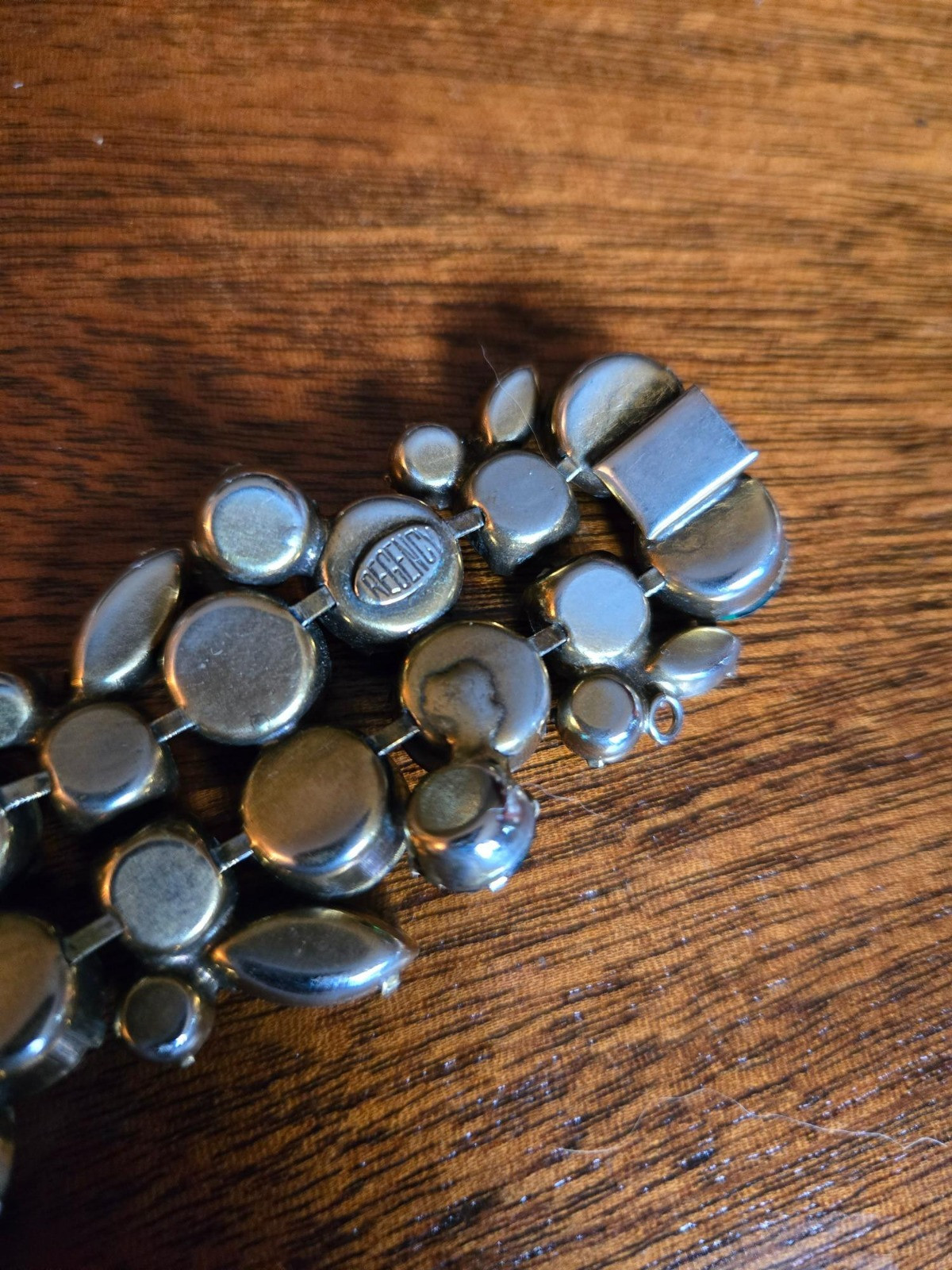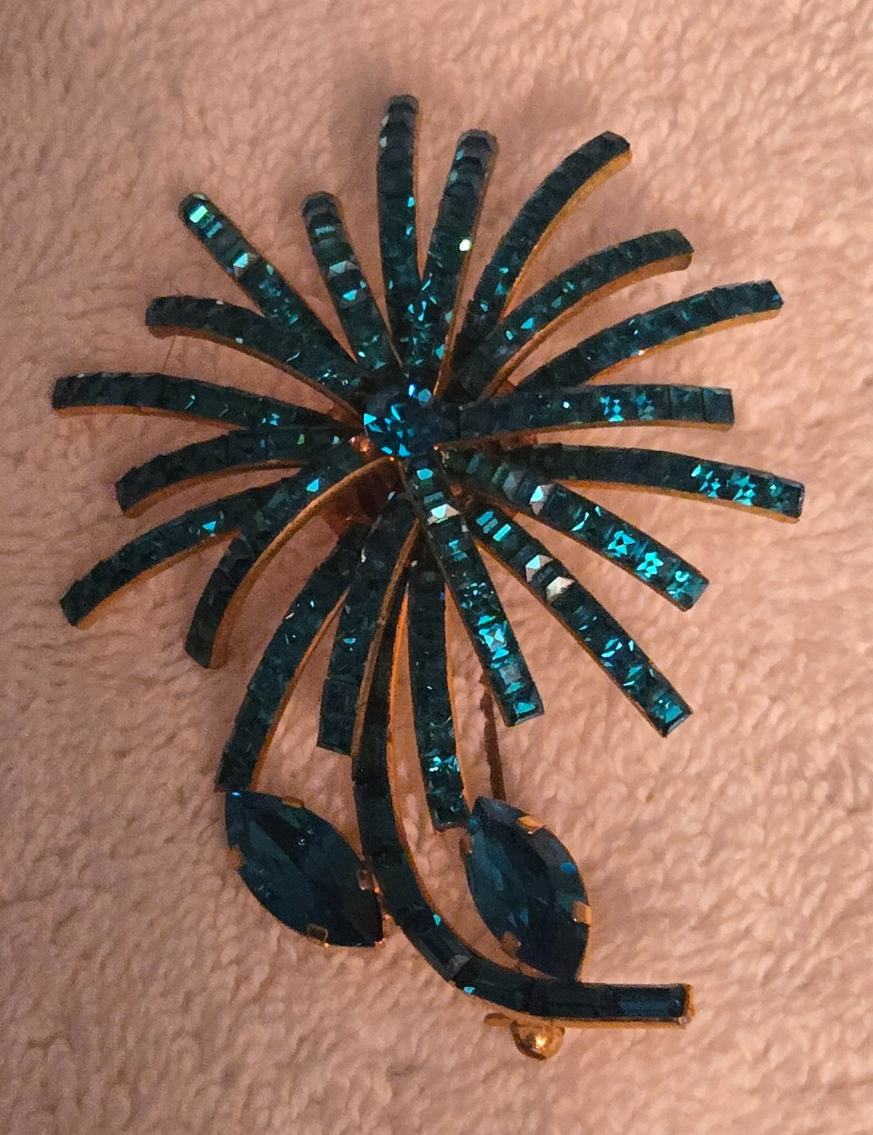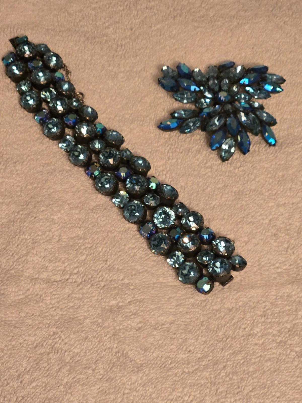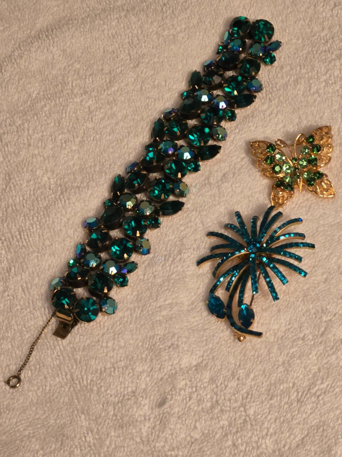 This stunning vintage jewelry collection features dazzling pieces from Regency and Weiss, including a Blue Regency Rhinestone Brooch, a Large 6-point Weiss brooch, and a Green Regency brooch. Also included is a Blue Rhinestone Bracelet with no visible markings, adding to the timeless elegance of this lot. Each piece showcases intricate craftsmanship and vibrant rhinestones, making this collection perfect for vintage jewelry collectors, costume jewelry lovers, or those seeking unique statement pieces.