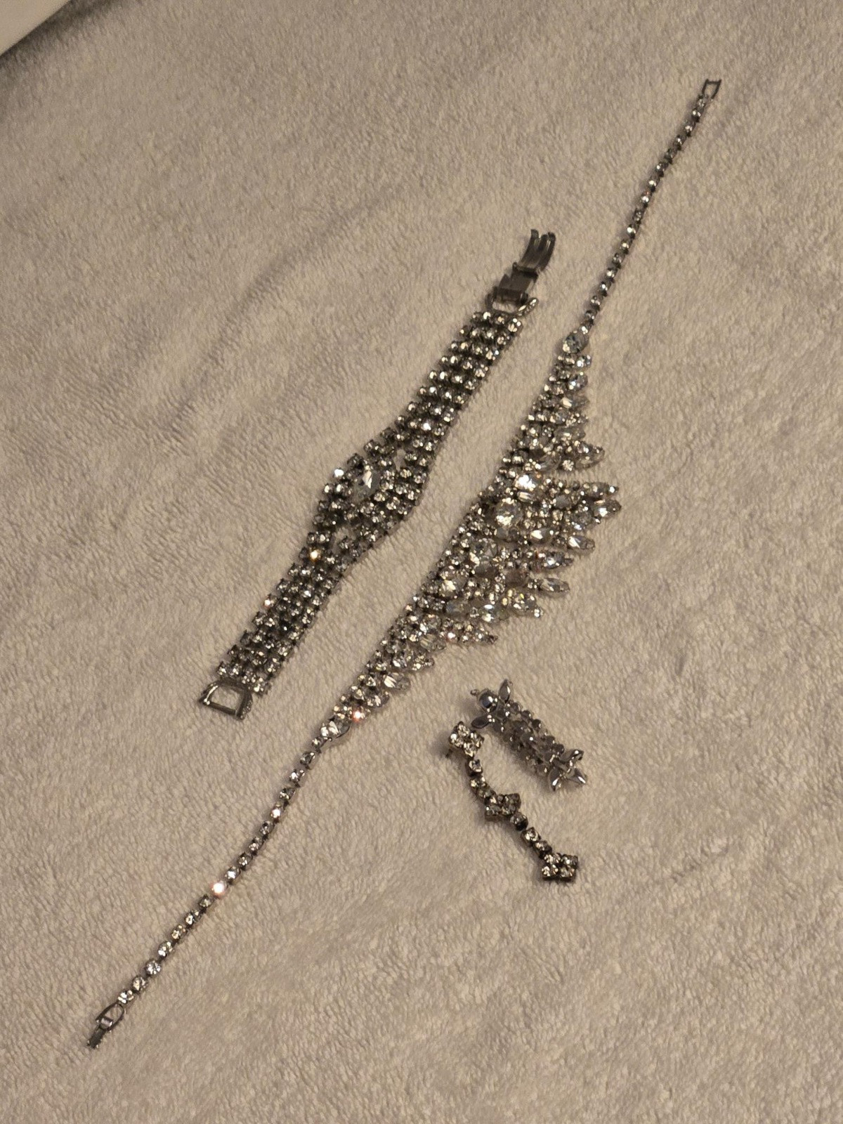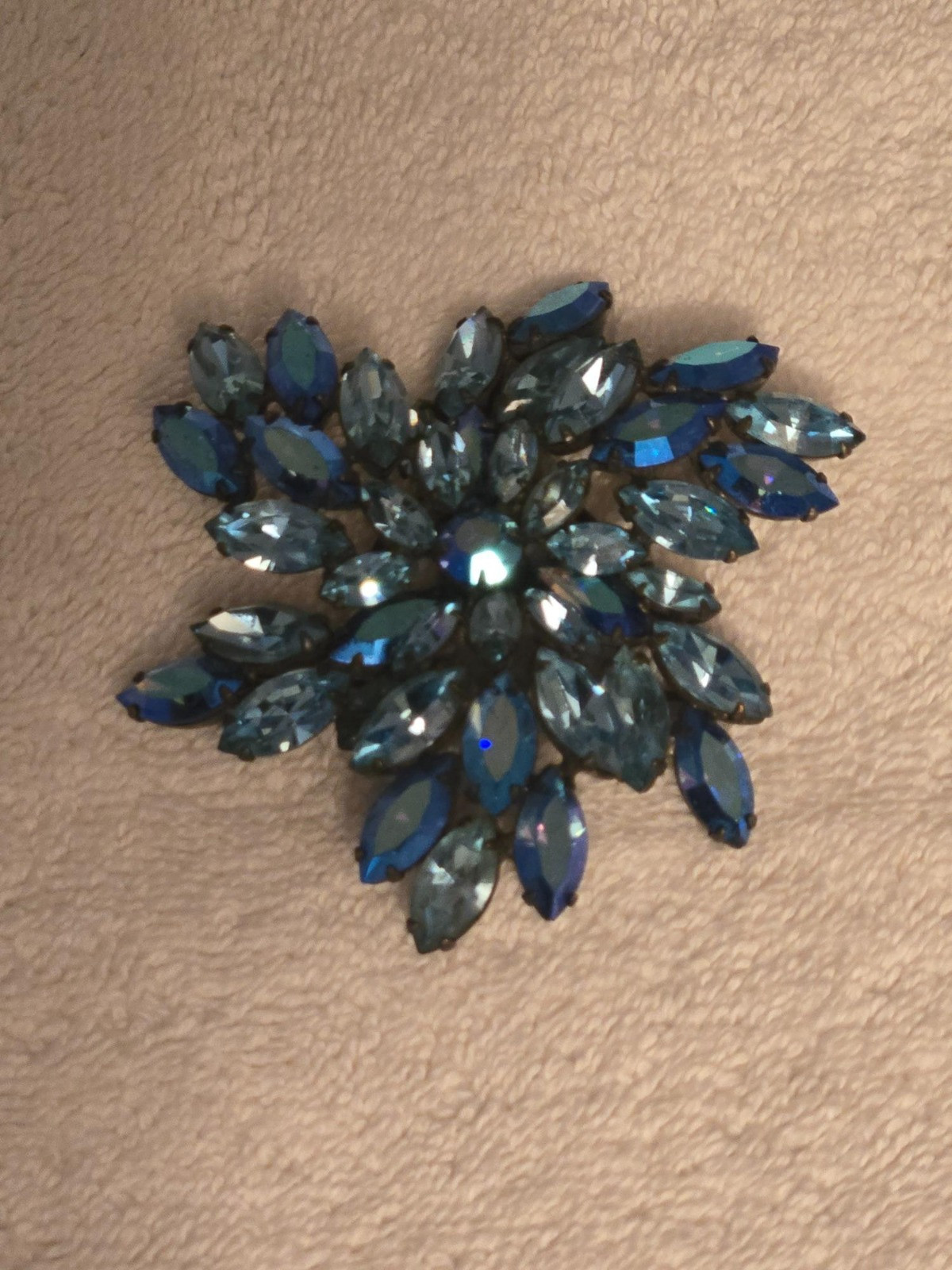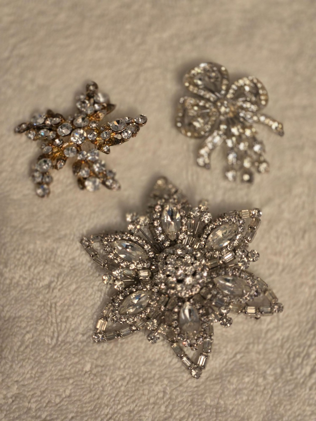 This stunning vintage jewelry collection features dazzling pieces from Regency and Weiss, including a Blue Regency Rhinestone Brooch, a Large 6-point Weiss brooch, and a Green Regency brooch. Also included is a Blue Rhinestone Bracelet with no visible markings, adding to the timeless elegance of this lot. Each piece showcases intricate craftsmanship and vibrant rhinestones, making this collection perfect for vintage jewelry collectors, costume jewelry lovers, or those seeking unique statement pieces.