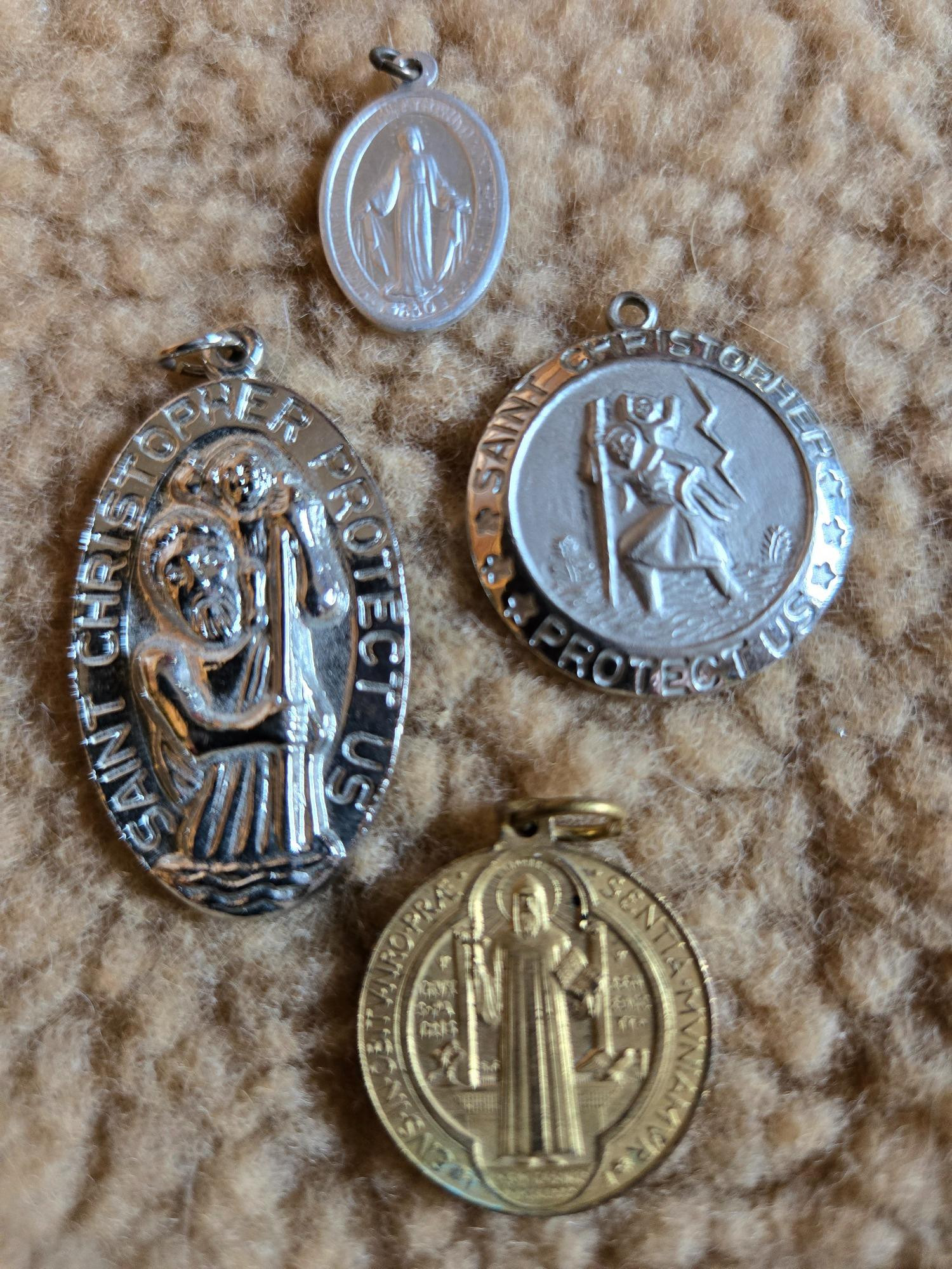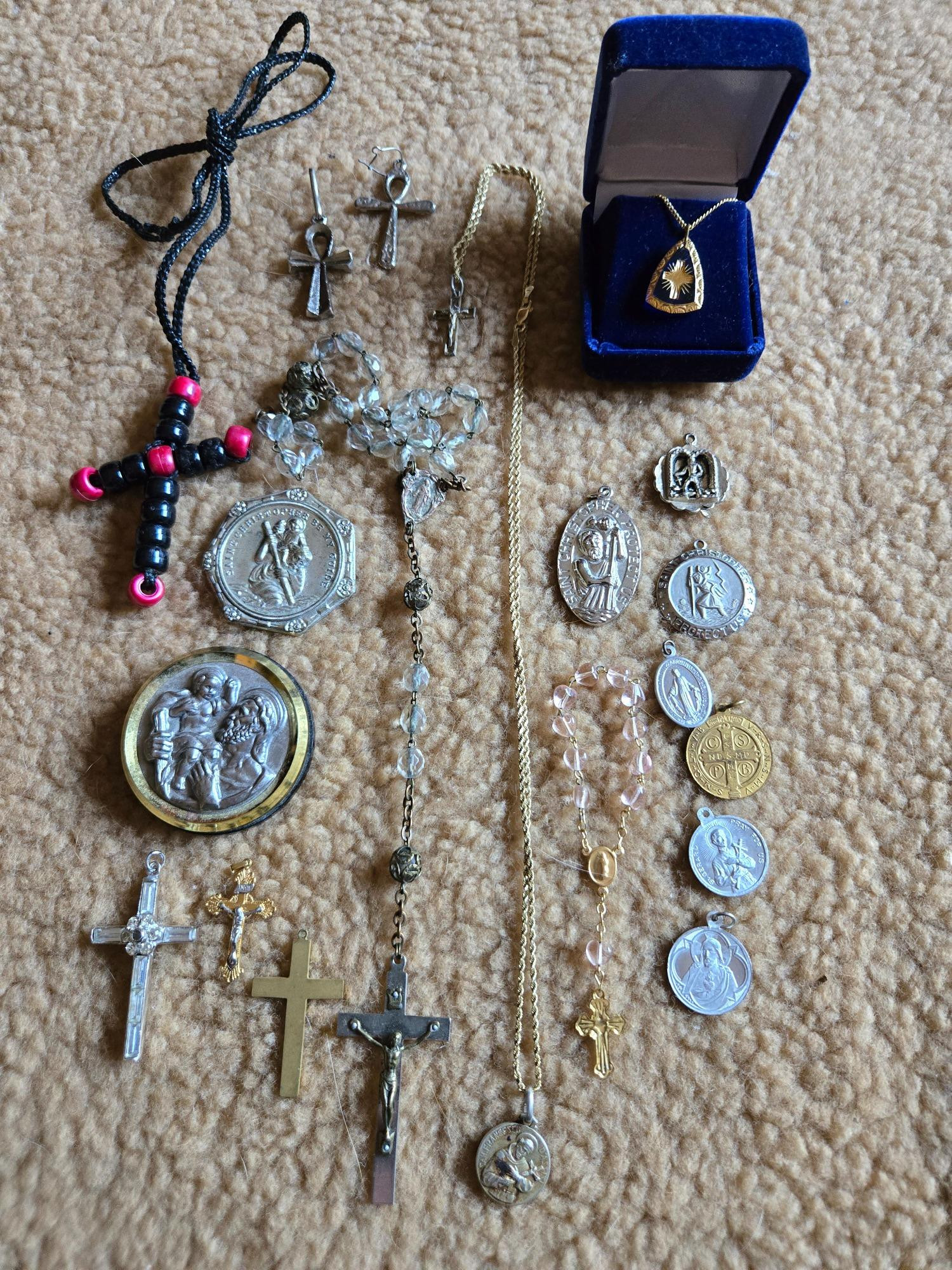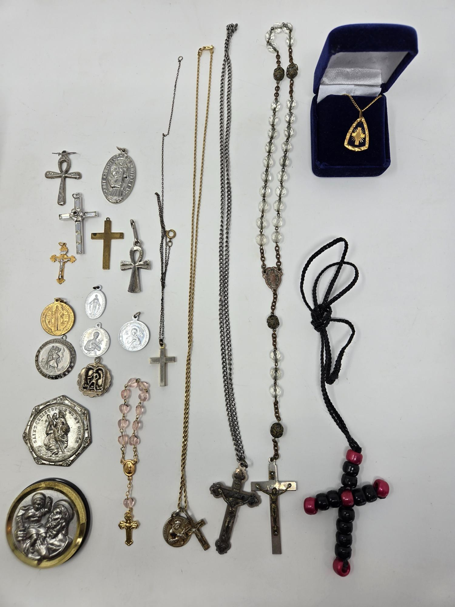 This inspiring collection of religious jewelry includes a variety of St. Christopher medals, cross necklaces, pendants, and rosary. Featuring intricate designs and timeless craftsmanship, these pieces carry deep spiritual significance. Whether you're a collector, a person of faith, or looking for meaningful gifts, this lot offers a beautiful selection of devotional jewelry. A wonderful set for prayer, protection, and display.