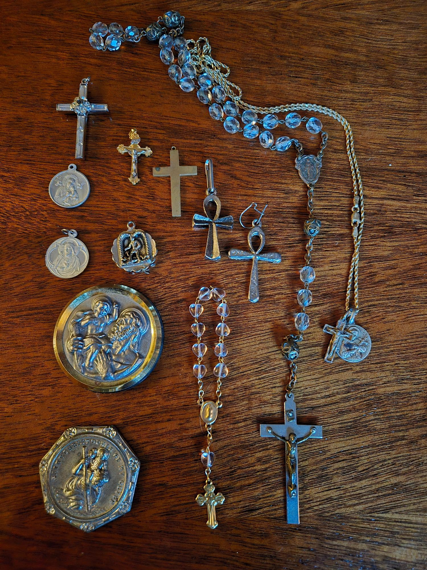 Lot # 97 - Religious Jewelry Lot – St. Christopher, Cross Necklaces & Rosary