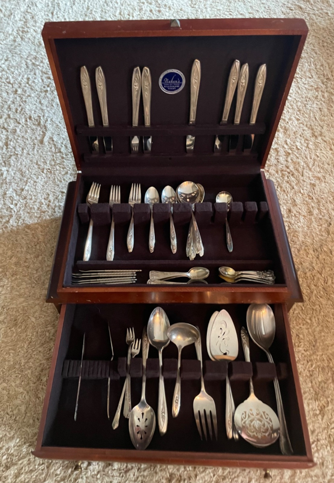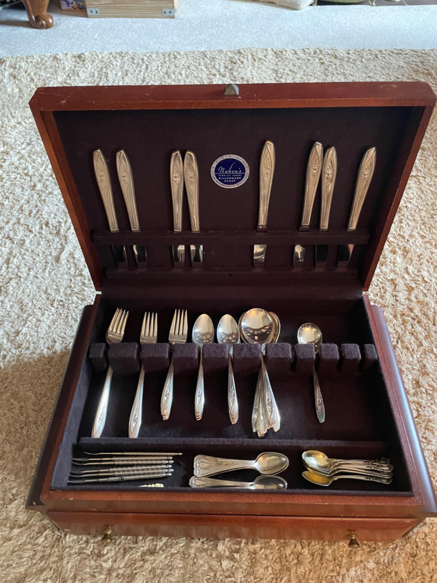 Elegant and timeless, this 70-piece Naken’s Tulip Pattern silver-plated flatware set is perfect for collectors or those looking to add vintage charm to their dining experience. The set includes a variety of utensils, from everyday essentials to specialty serving pieces, all housed in a classic wooden storage case. Includes: A well-preserved set with intricate detailing, making it a fantastic addition to any vintage silverware collection. Ideal for special occasions, display, or everyday use!