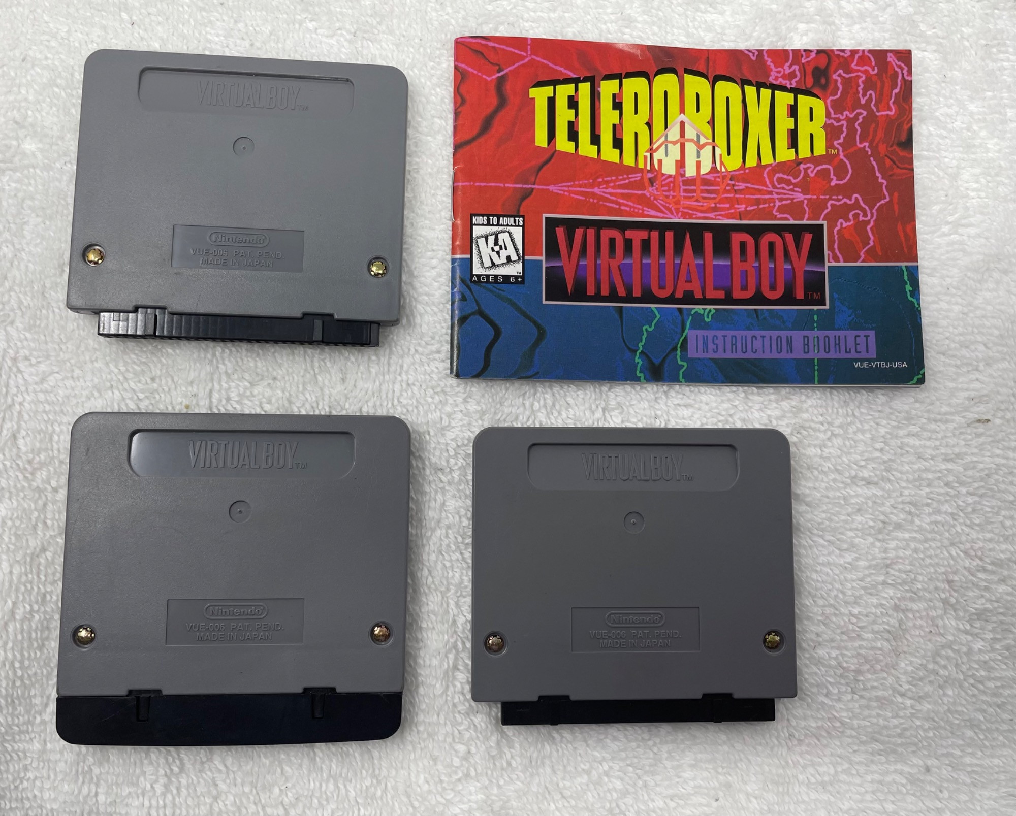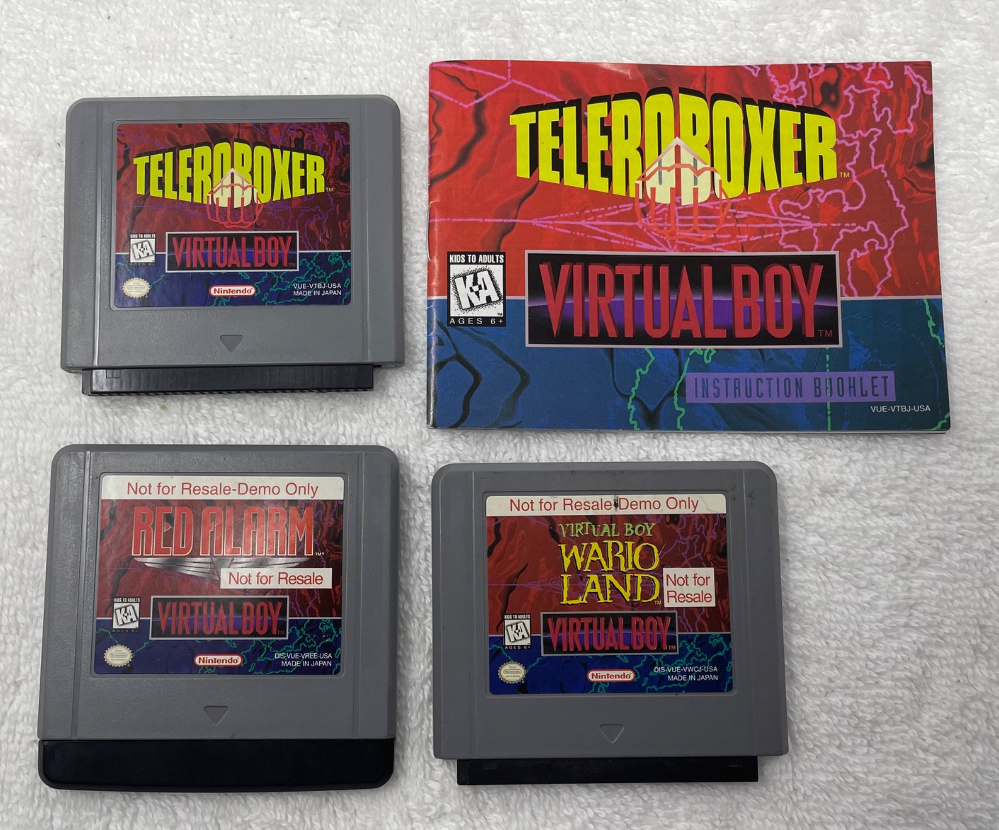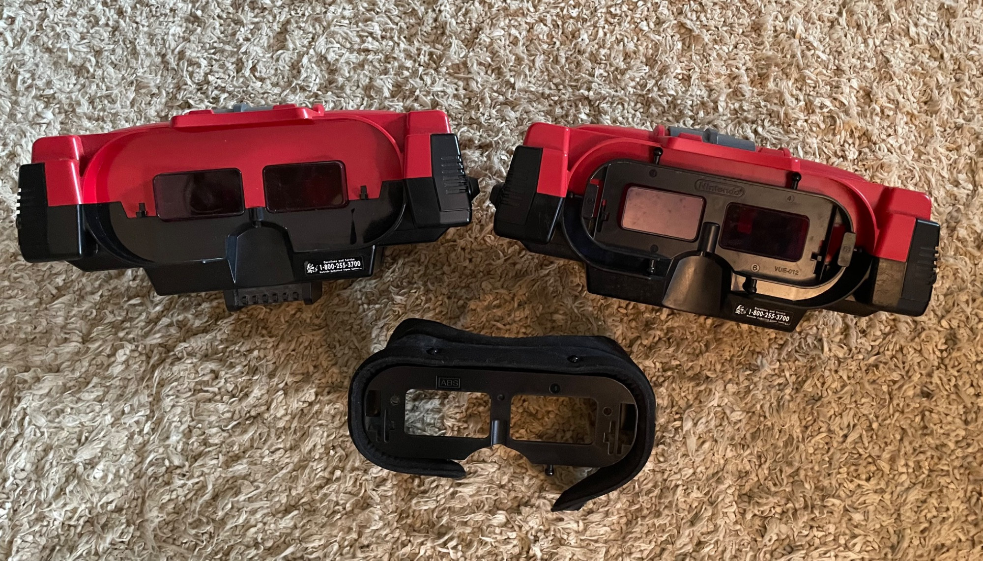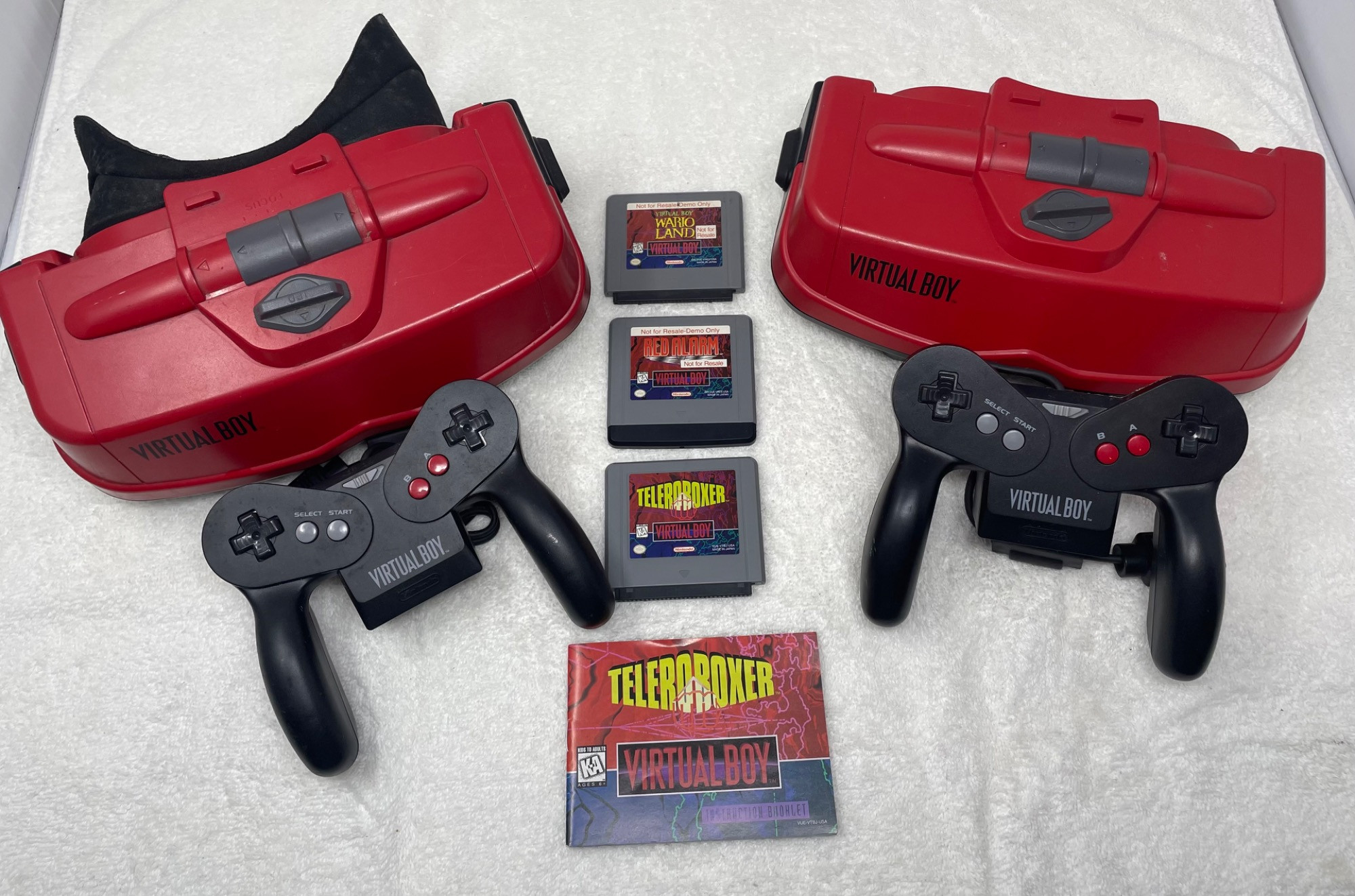 This Nintendo Virtual Boy bundle includes two Virtual Boy systems, two controllers, and three games, along with a stand. A unique piece of gaming history, the Virtual Boy was Nintendo's first attempt at a 3D gaming console, known for its distinctive red monochrome display and immersive gameplay. Included in this bundle: 🎮 2 Virtual Boy Consoles 🎮 2 Controllers 🎮 3 Games: Wario Land, Red Alarm, Teleroboxer (with manual) 🎮 1 Stand Condition: Sold as-is. Please refer to photos for details on physical condition. A great find for Nintendo collectors, retro gaming enthusiasts, or those looking for a unique piece of video game history!