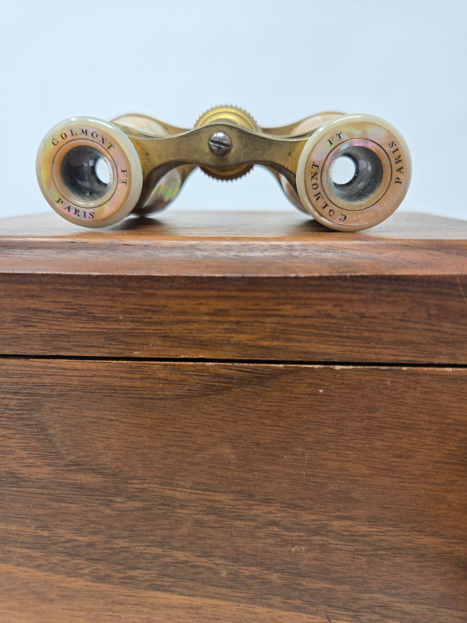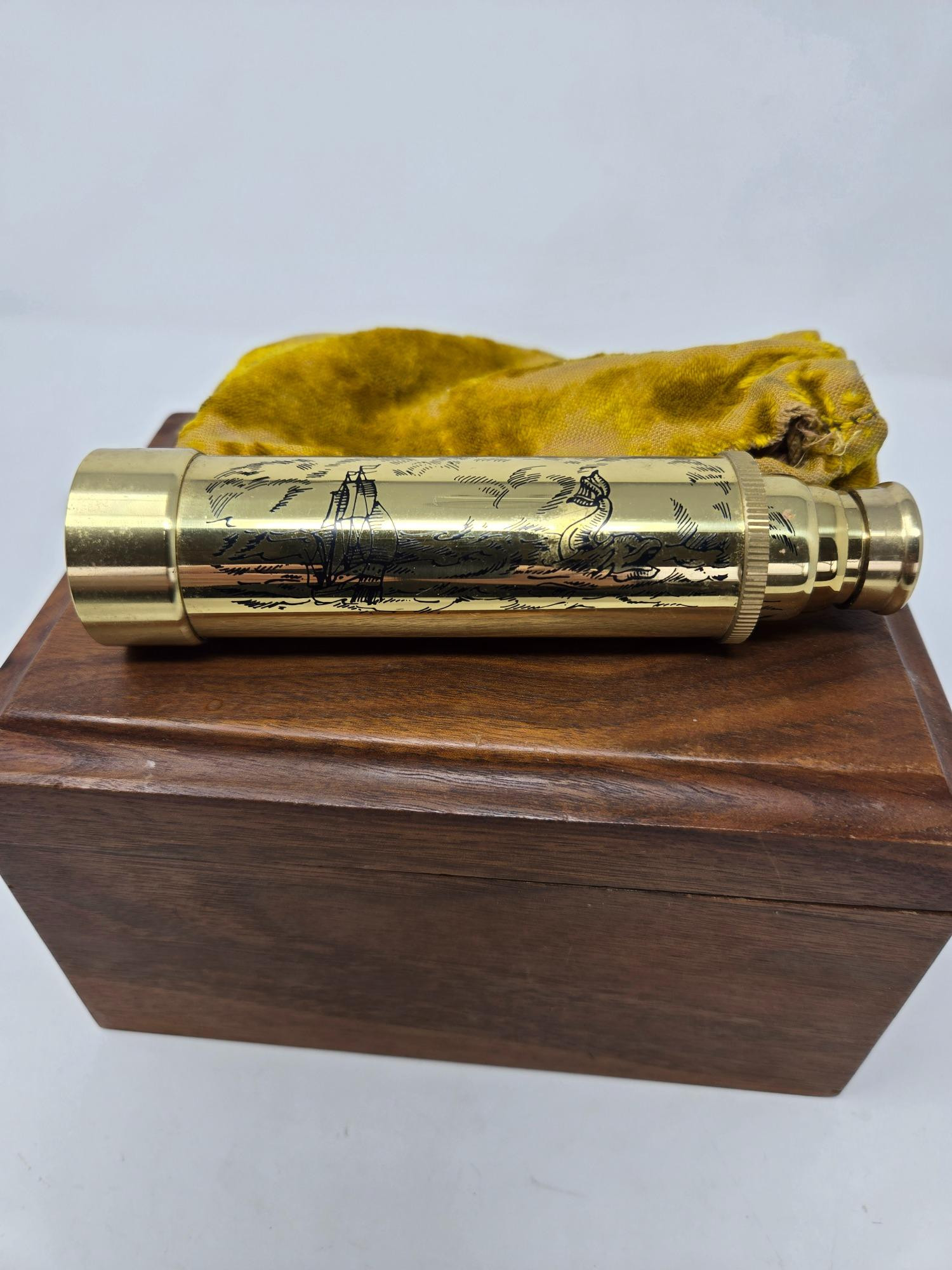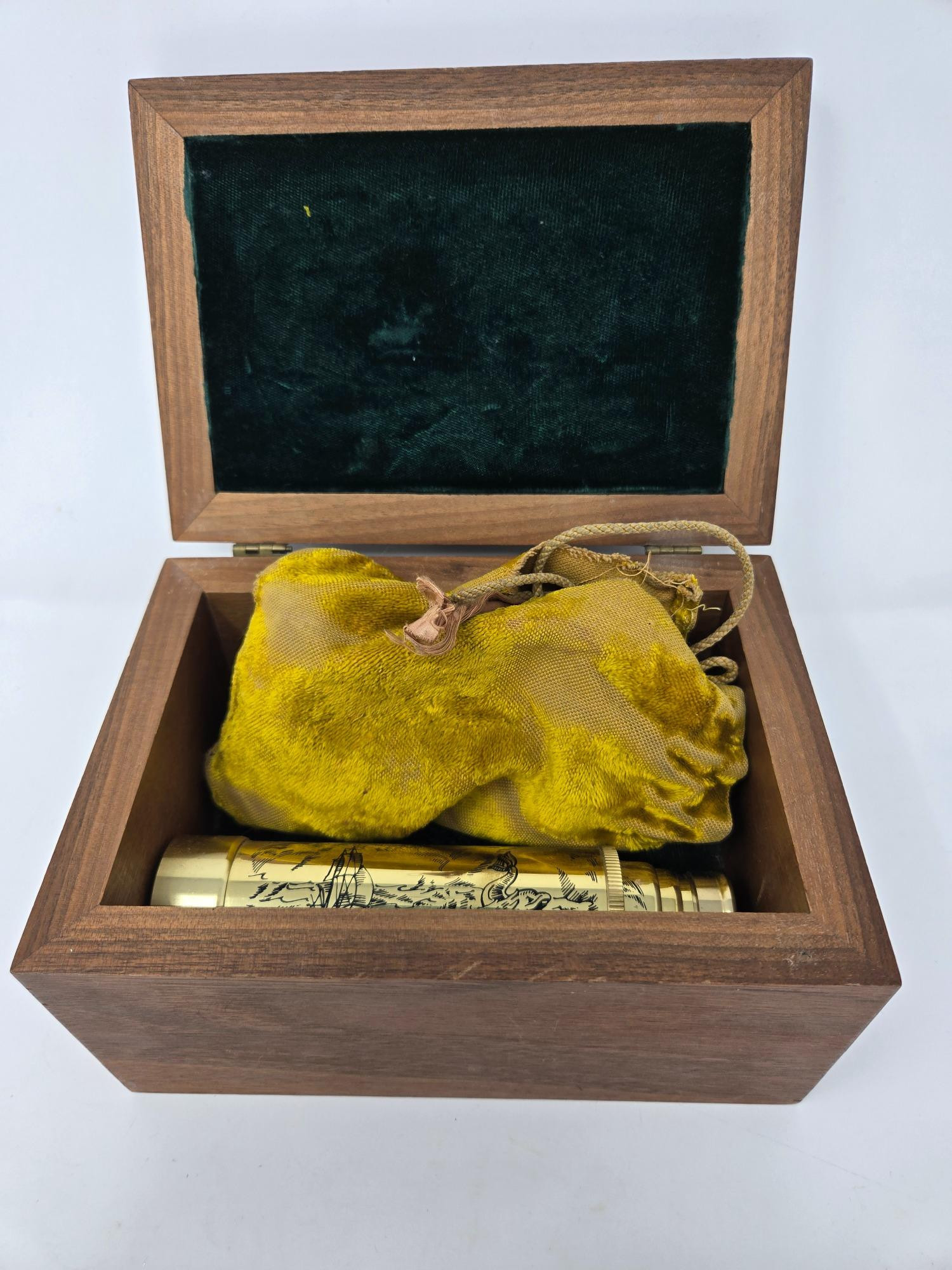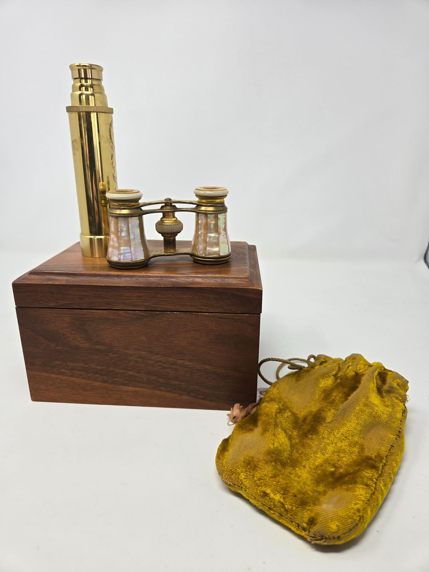 This vintage optical set includes a pair of "Made in Paris" opera glasses and a beautifully detailed telescope, both housed in a soft velveteen pouch. The opera glasses feature classic brass construction, showcasing timeless elegance and craftsmanship. The telescope, adorned with intricate engravings, is a fantastic collector's item or display piece. Both pieces come in a wooden storage box lined with plush fabric, adding to their charm. A wonderful find for collectors, theater lovers, or those who appreciate vintage optics!