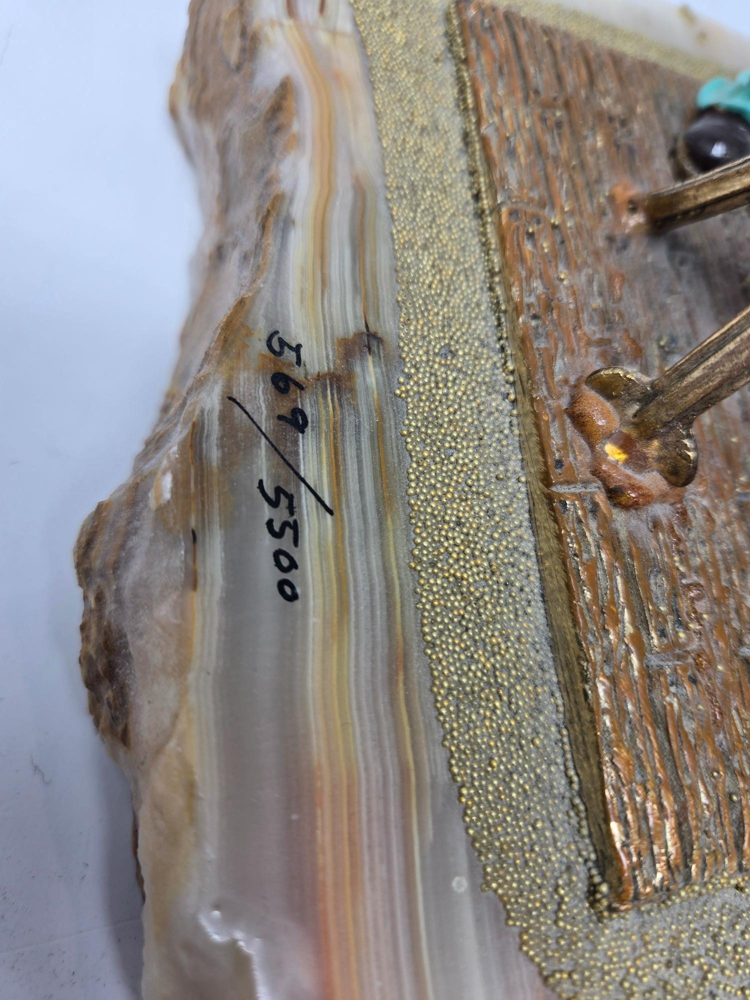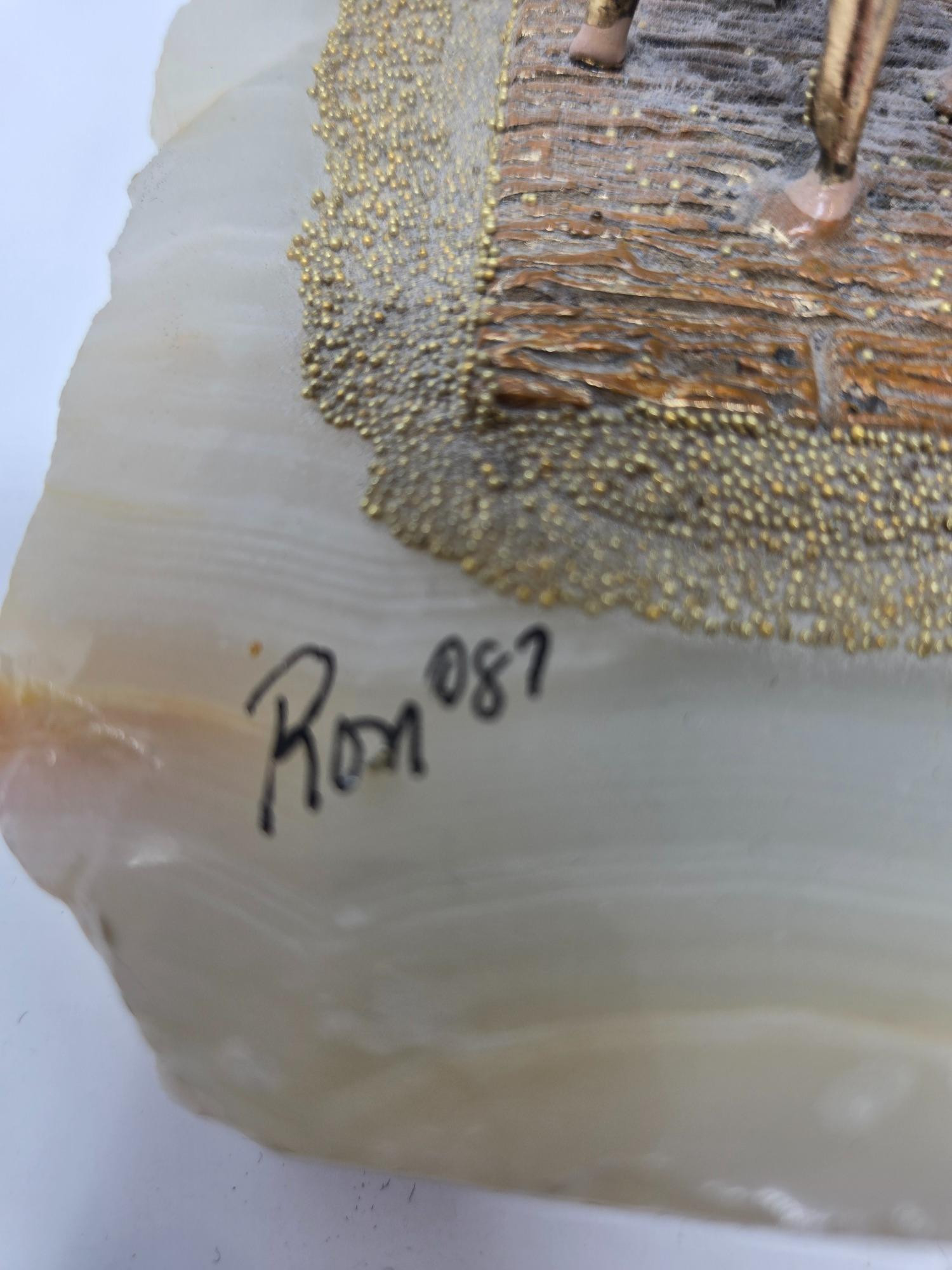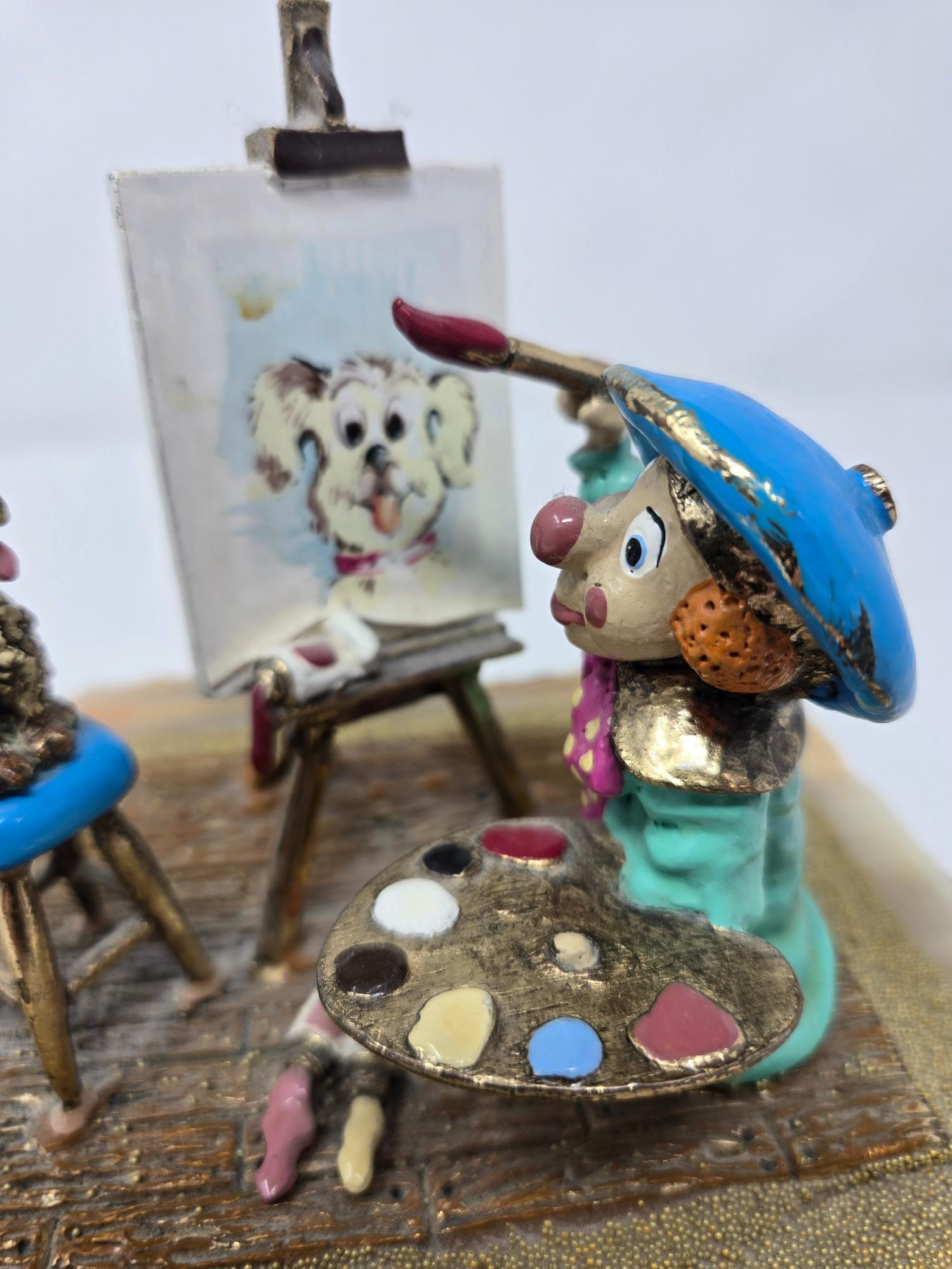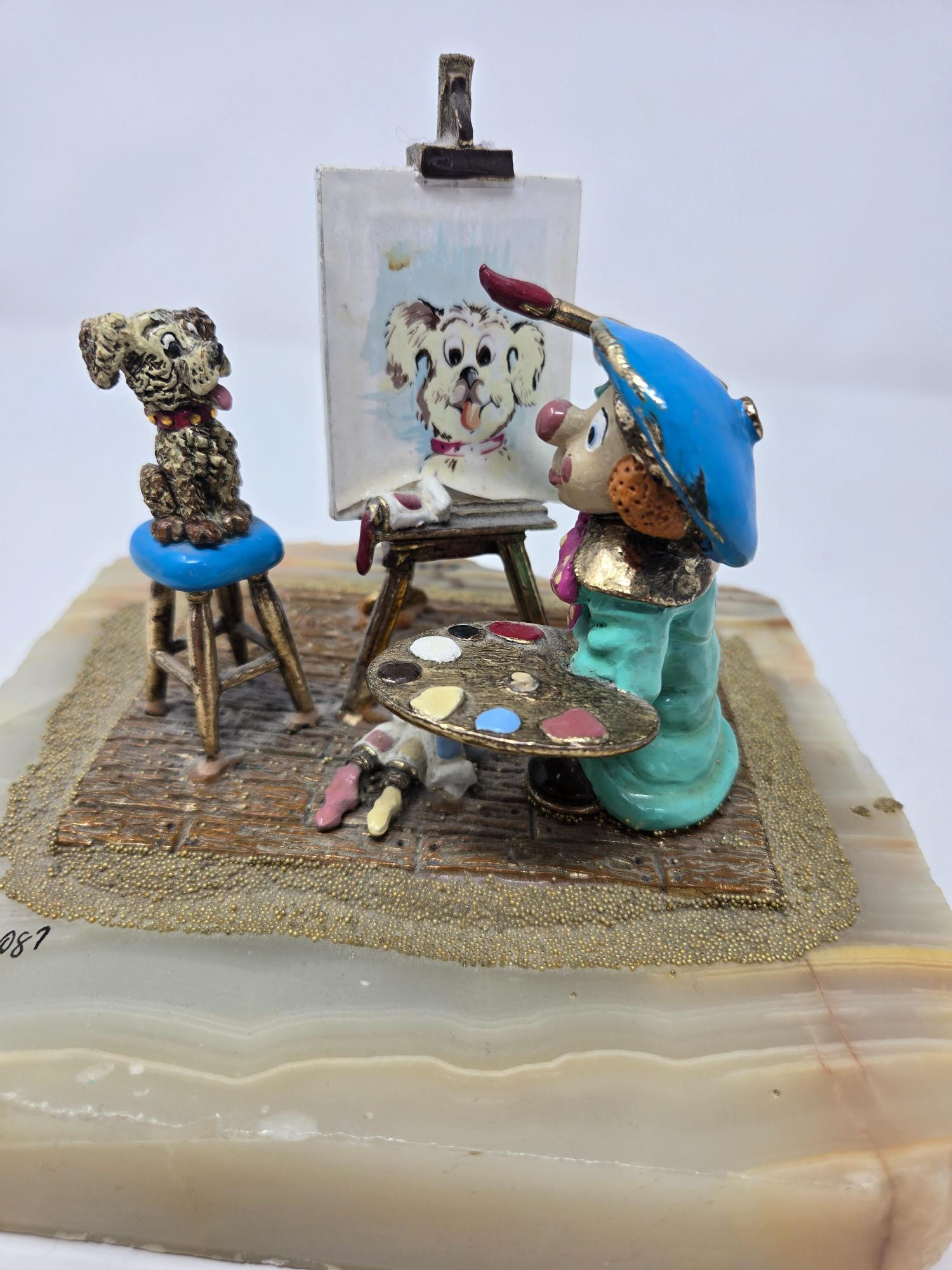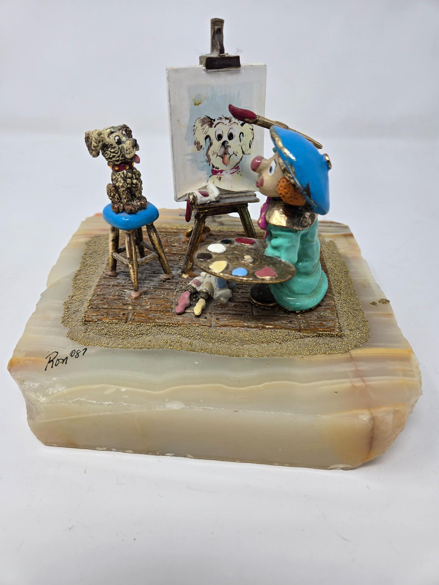 This rare 1987 Ron Lee "Puppy Love's Portrait" sculpture is a charming and whimsical collectible from the World of Clowns series. Featuring a joyful pup having its portrait painted by a clown artist, this beautifully detailed piece is mounted on an onyx base with gold bead accents, signed "Ron c.87" and numbered 200 out of 5500. The sculpture measures approximately 7" x 5.5" x 6", with the onyx base being 1 3/8" thick, making it a substantial and heavy piece. The colors are bright and vivid, with an artistic finish on the clown’s coat designed to give it a vintage, well-loved look. There are no chips on the figures or the onyx/marble base. A must-have for Ron Lee collectors, clown enthusiasts, or lovers of unique, high-quality figurines, this piece captures the playful and heartwarming connection between the artist and his adorable subject.