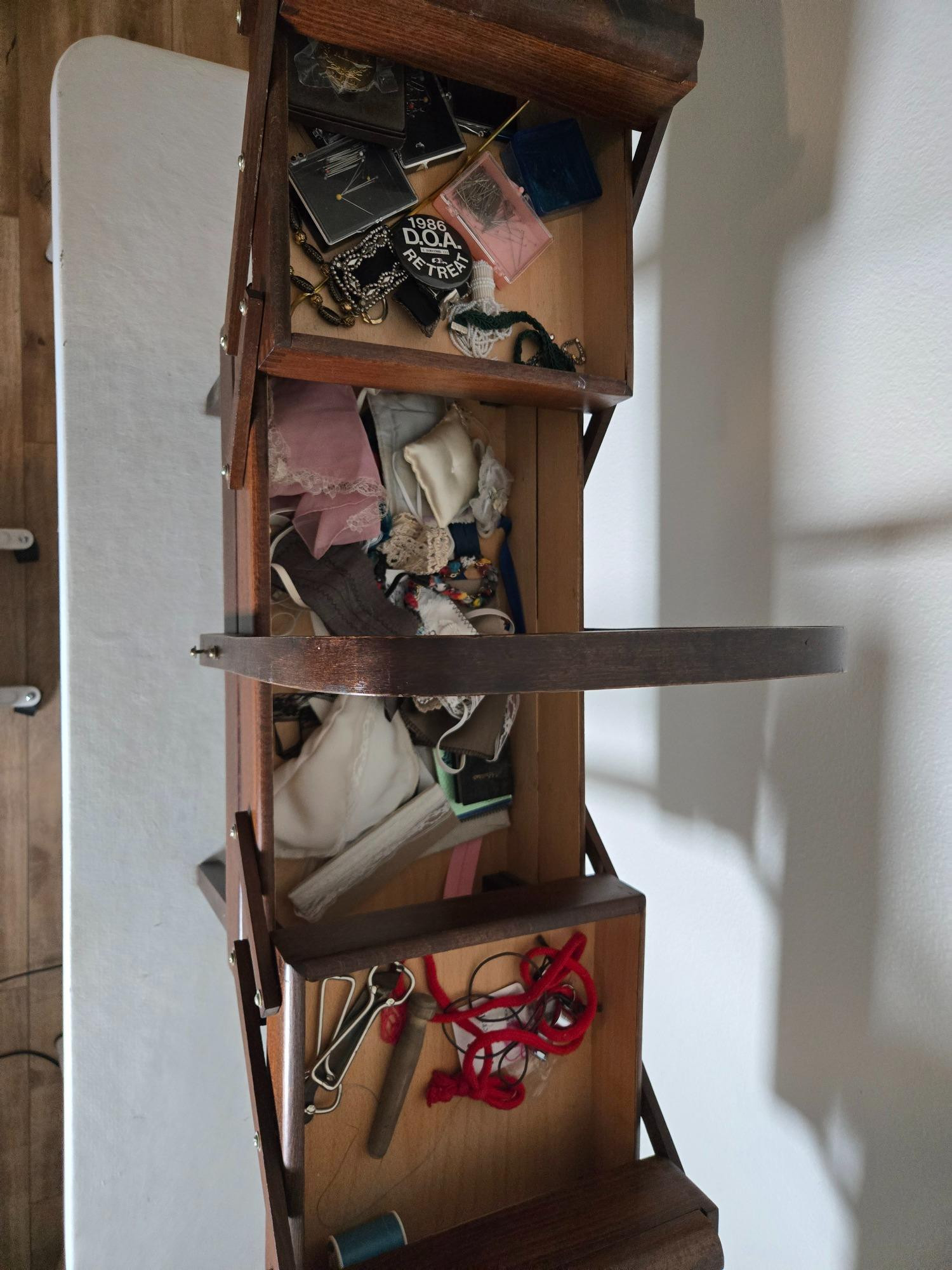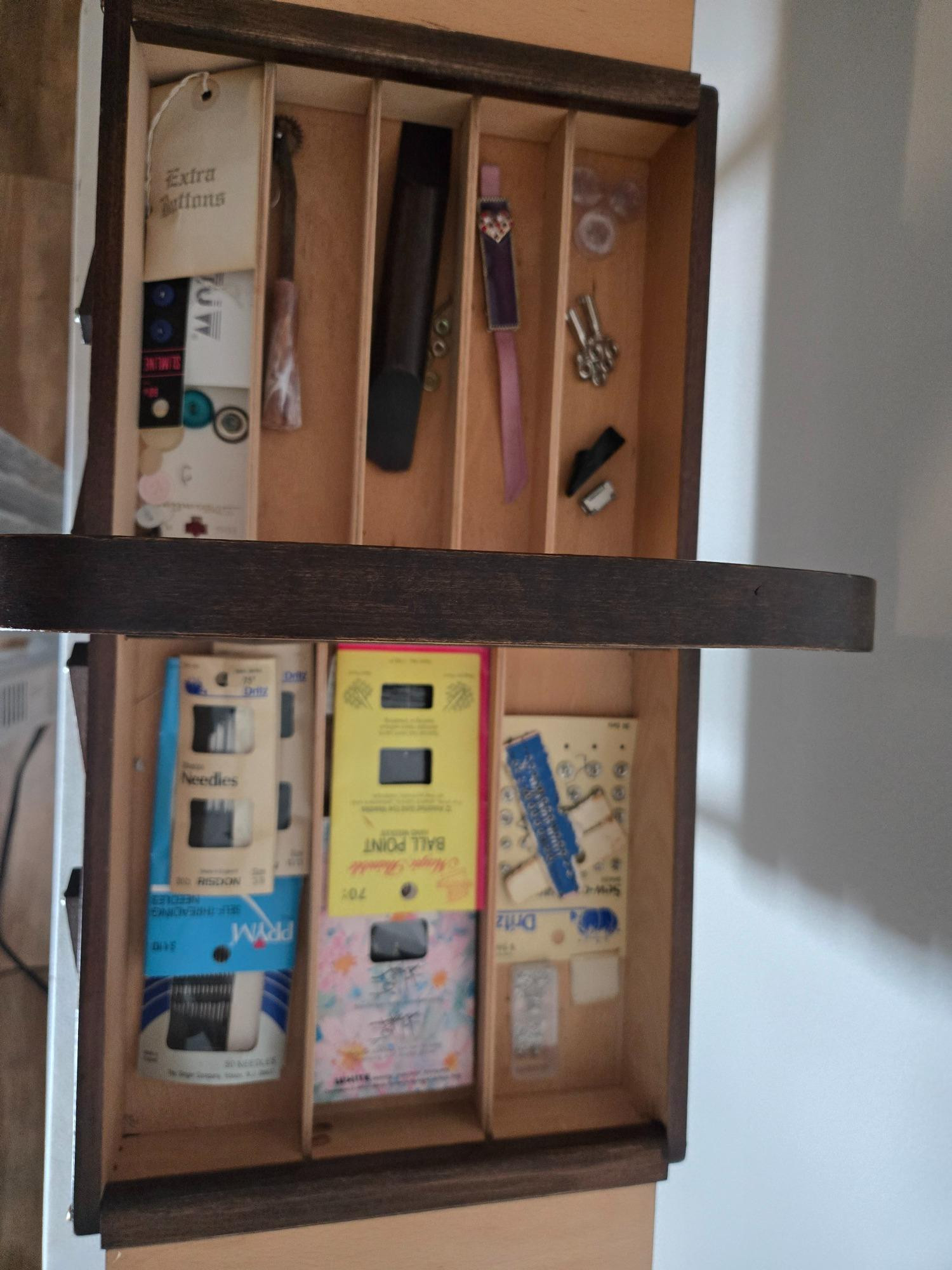 This vintage accordion-style sewing box is a beautifully crafted storage organizer, perfect for sewing enthusiasts, crafters, or collectors. Featuring a fold-out design with multiple compartments, it provides ample space to store sewing essentials, crafting tools, or accessories. The box is in great condition and comes with a few sewing supplies, making it a functional and stylish addition to any sewing space. A perfect blend of vintage charm and practicality, ideal for both use and display!