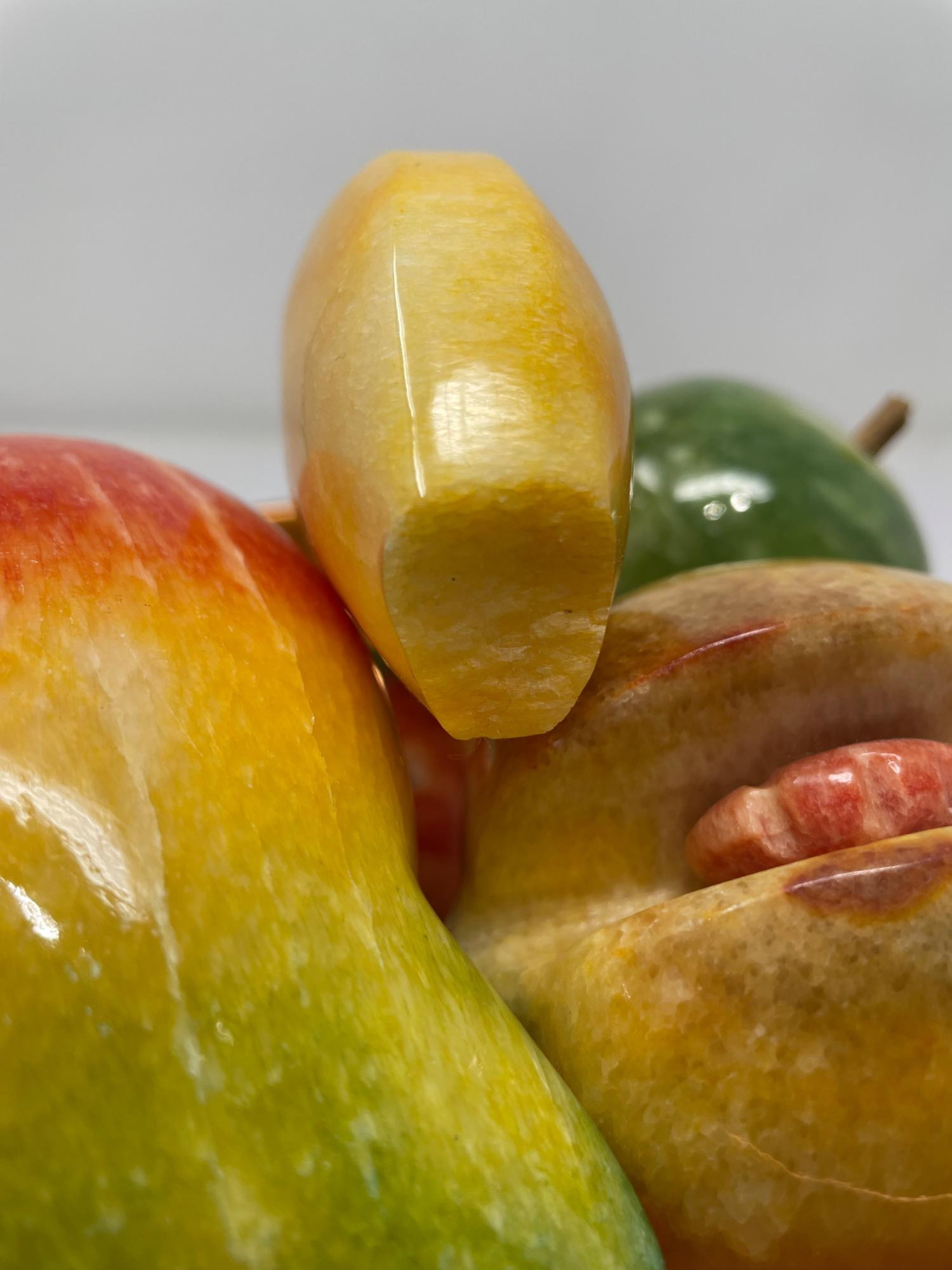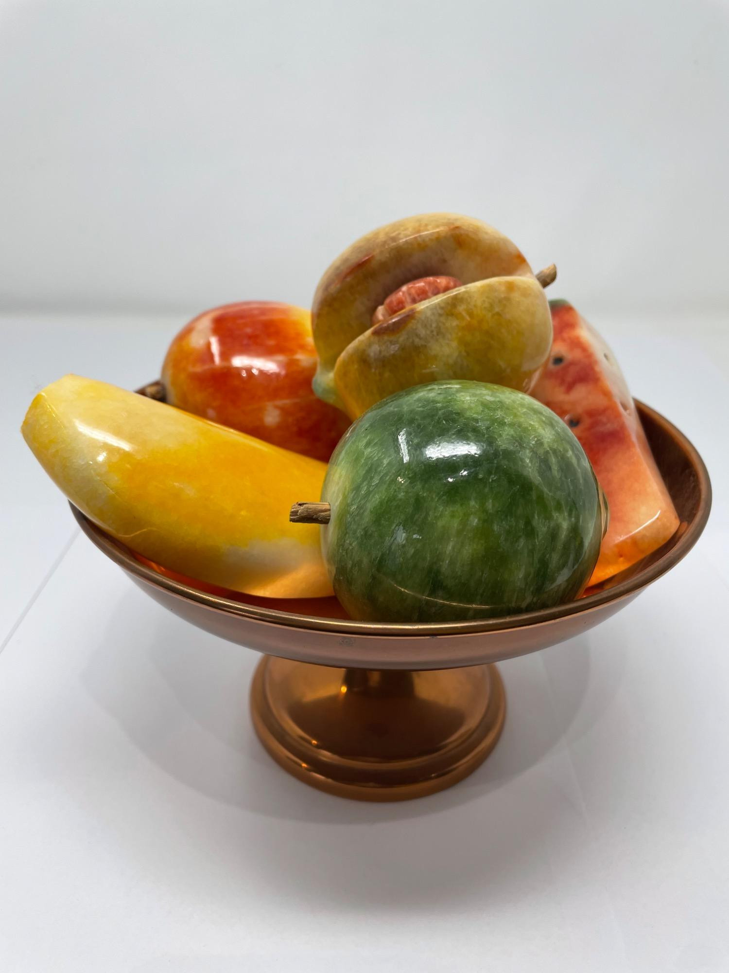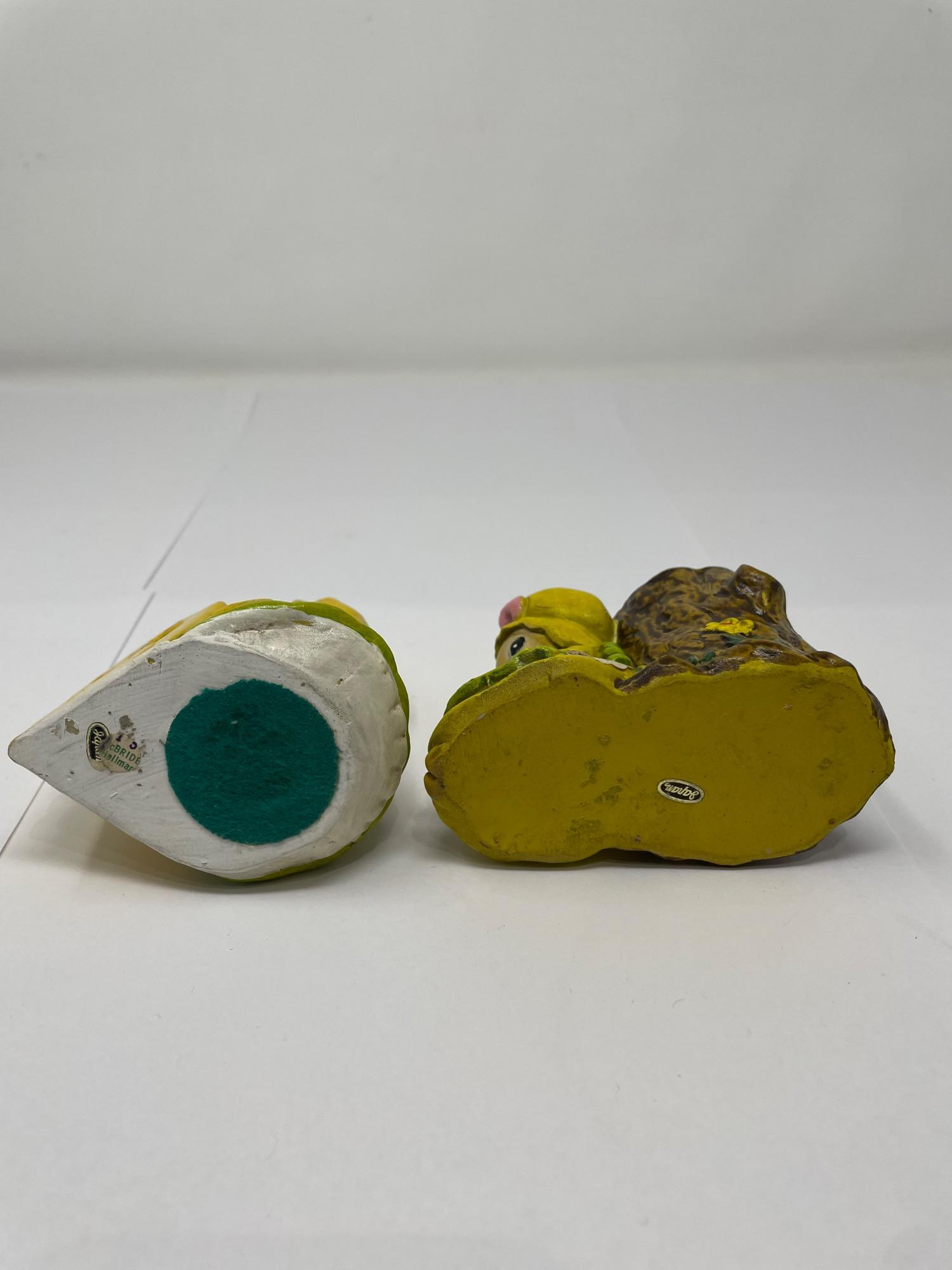 This delightful collection of vintage kitchen knick-knacks features an assortment of ceramic figurines, a decorative copper bowl, and colorful ceramic fruit. The whimsical ceramic mice, an adorable owl, and other playful figurines bring a nostalgic charm to any kitchen or display shelf. The figurines range in size from 2" to 4" tall, while the copper bowl measures 6" high by 7" wide and includes a selection of ceramic fruit. None of the pieces have visible markings, adding to their unique character. This collection is perfect for collectors, vintage décor lovers, or anyone looking to add a touch of charm and personality to their home.