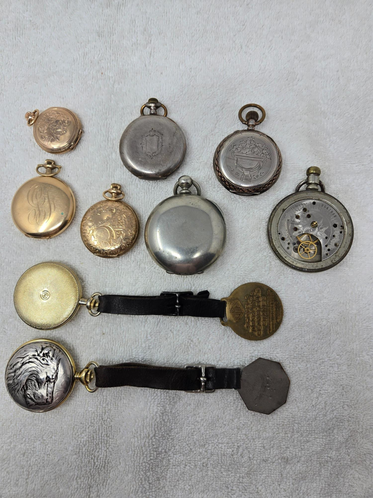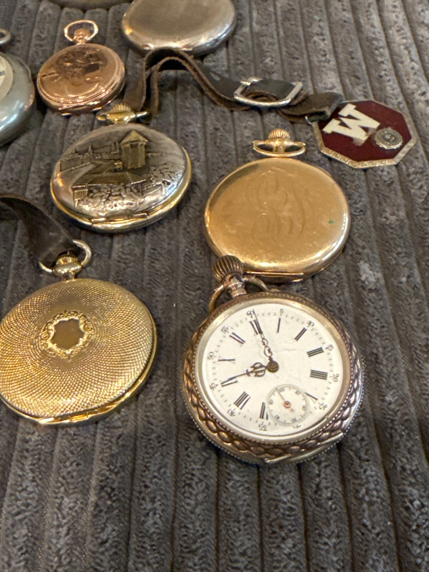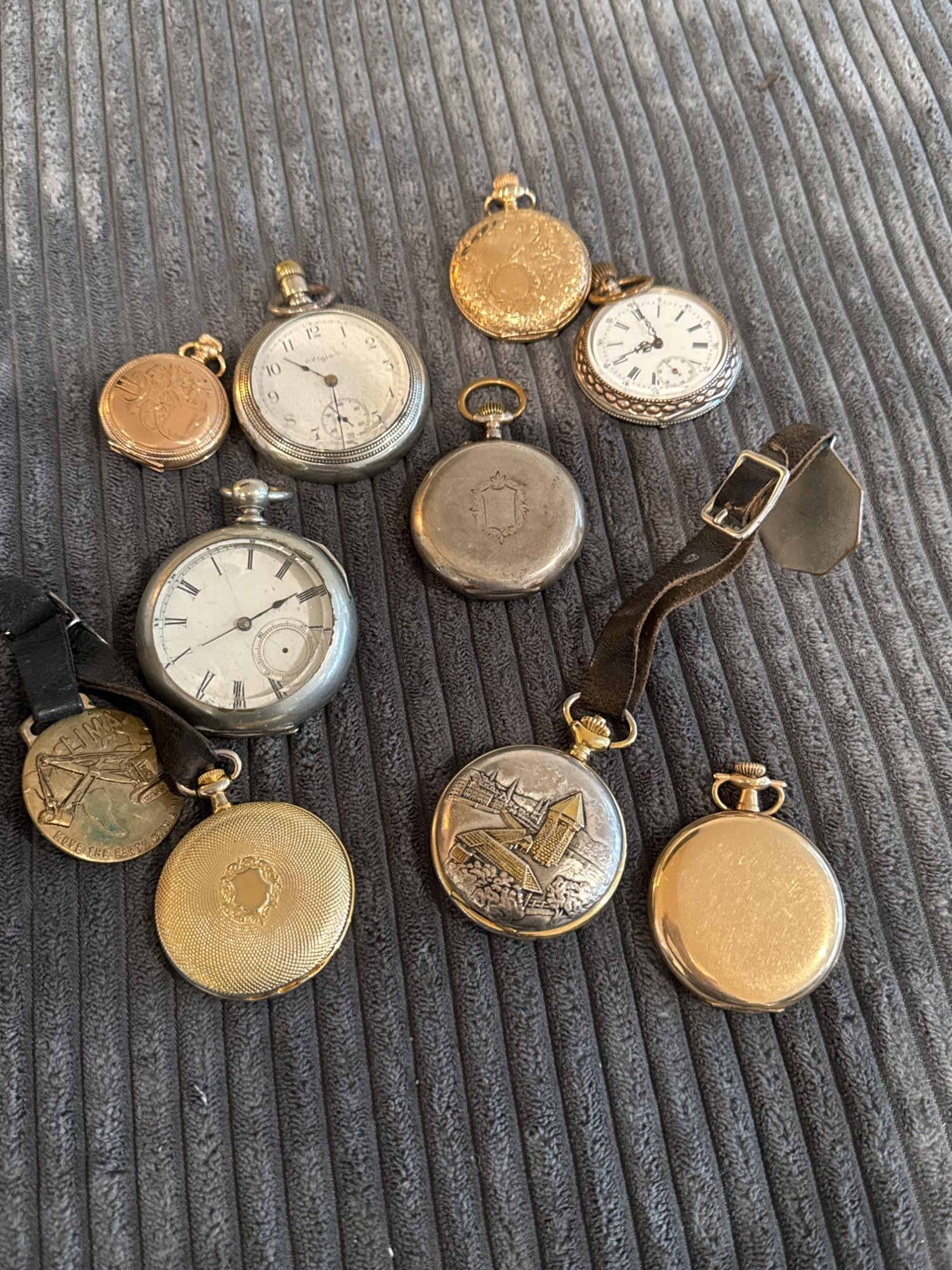 This collection includes a variety of vintage pocket watches, each with its own unique charm. Among them is a special piece inspired by the artwork of Norman Rockwell, adding historical and artistic value. Some watches show signs of age and wear, making them perfect for collectors, restoration projects, or display.