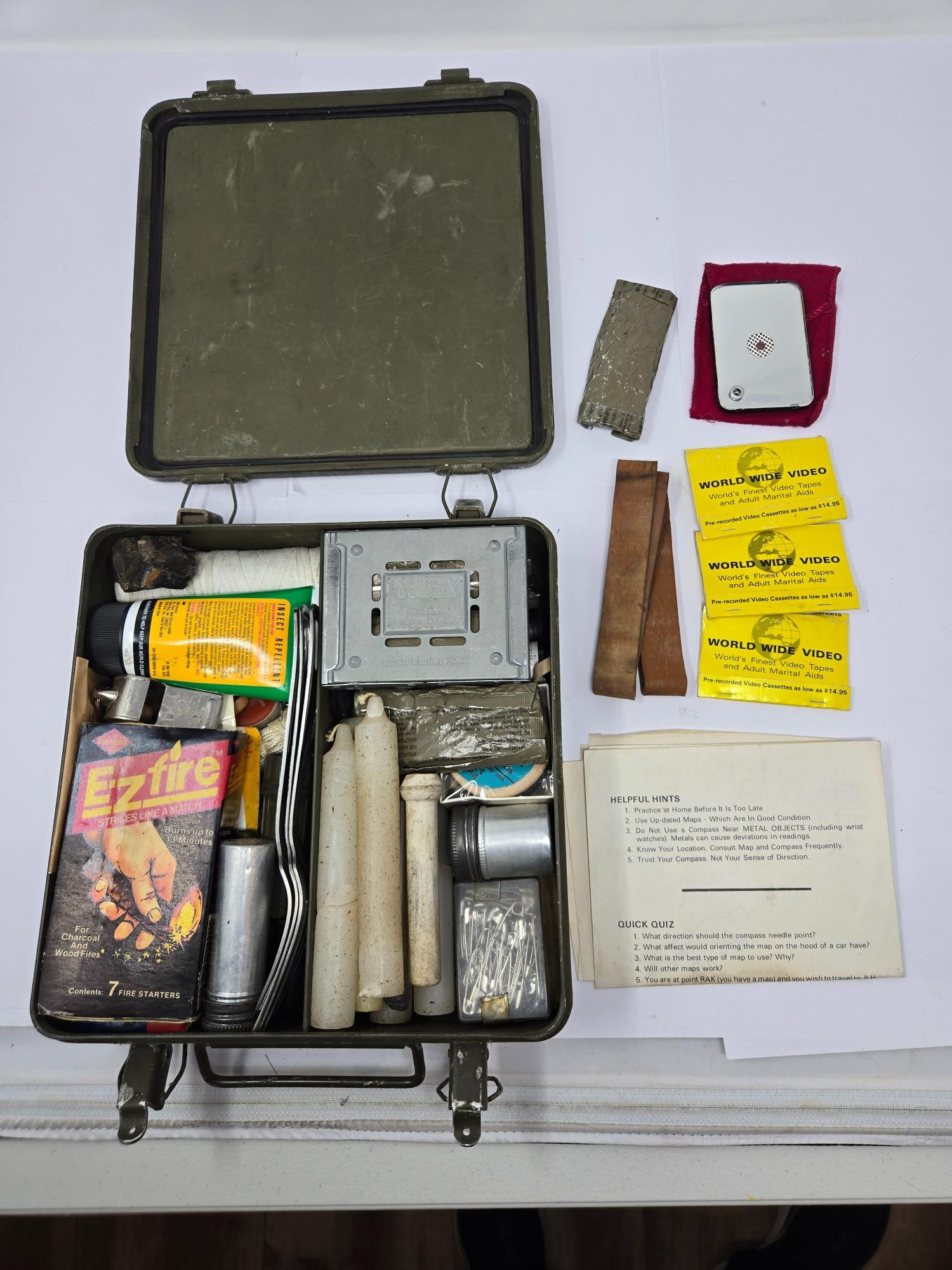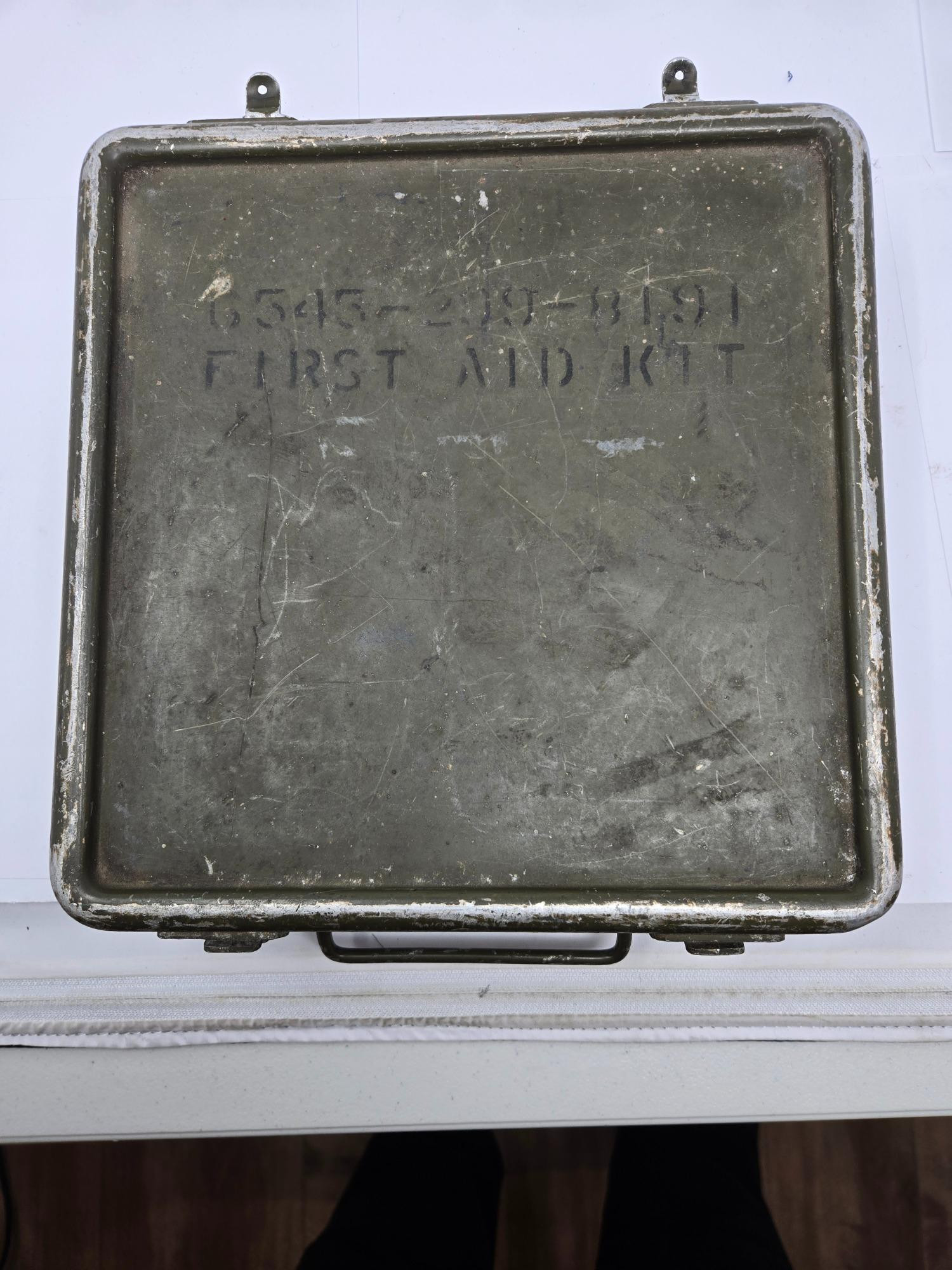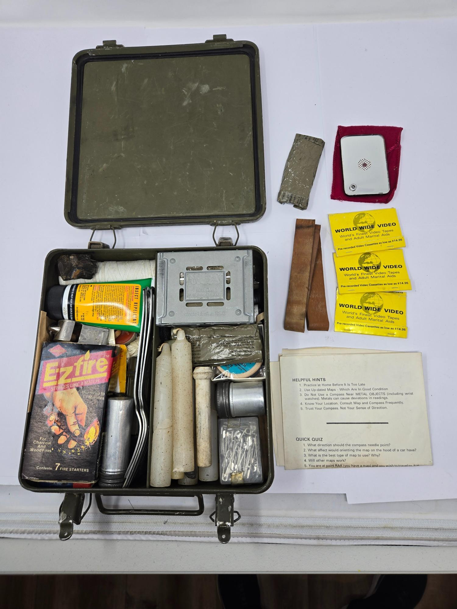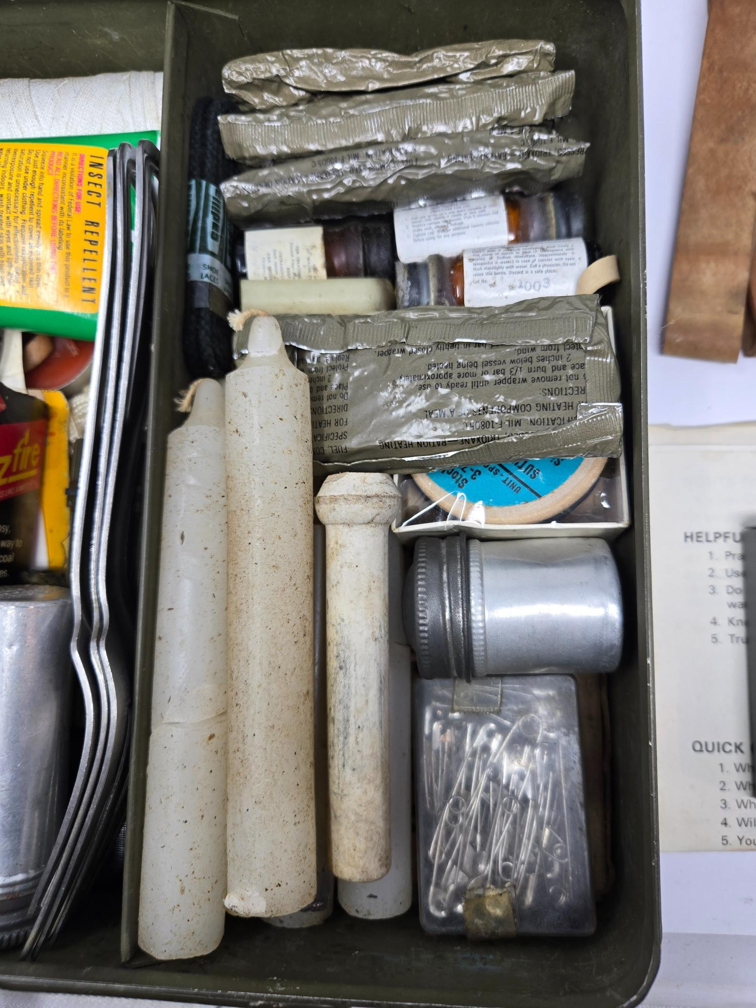 This vintage military first aid kit is a well-stocked survival essential, containing a variety of emergency supplies. Inside the durable metal case, you'll find candles, safety pins, utensils, medical items, and even travel propane, making it a unique and functional collector’s piece. Ideal for military memorabilia collectors, survival enthusiasts, or those looking for an authentic piece of history. A rare find with practical and historical value!