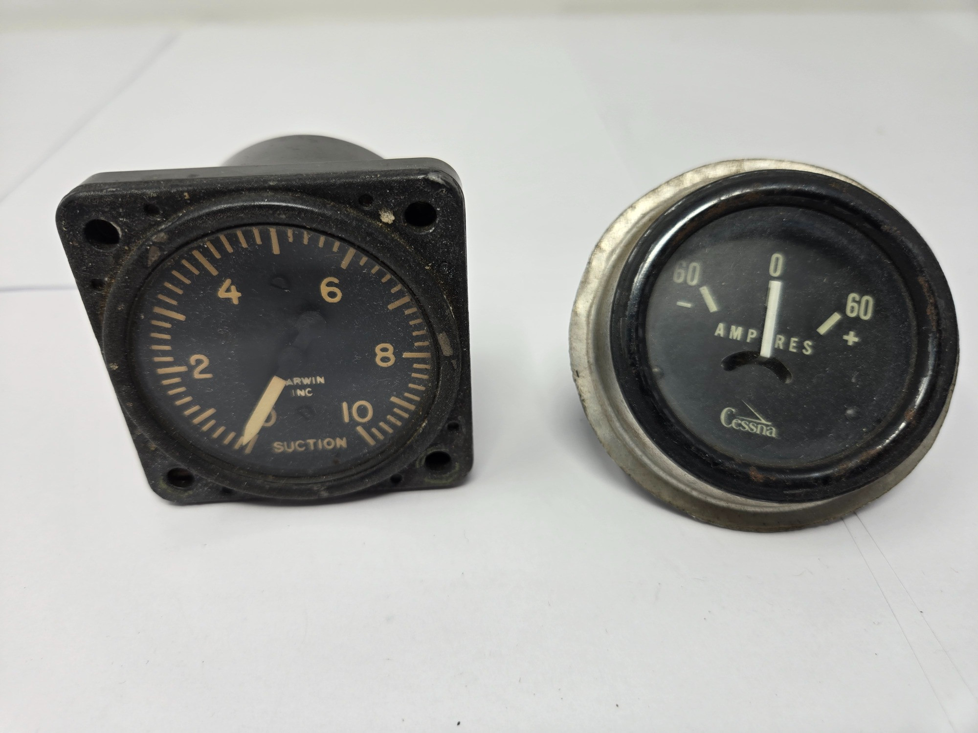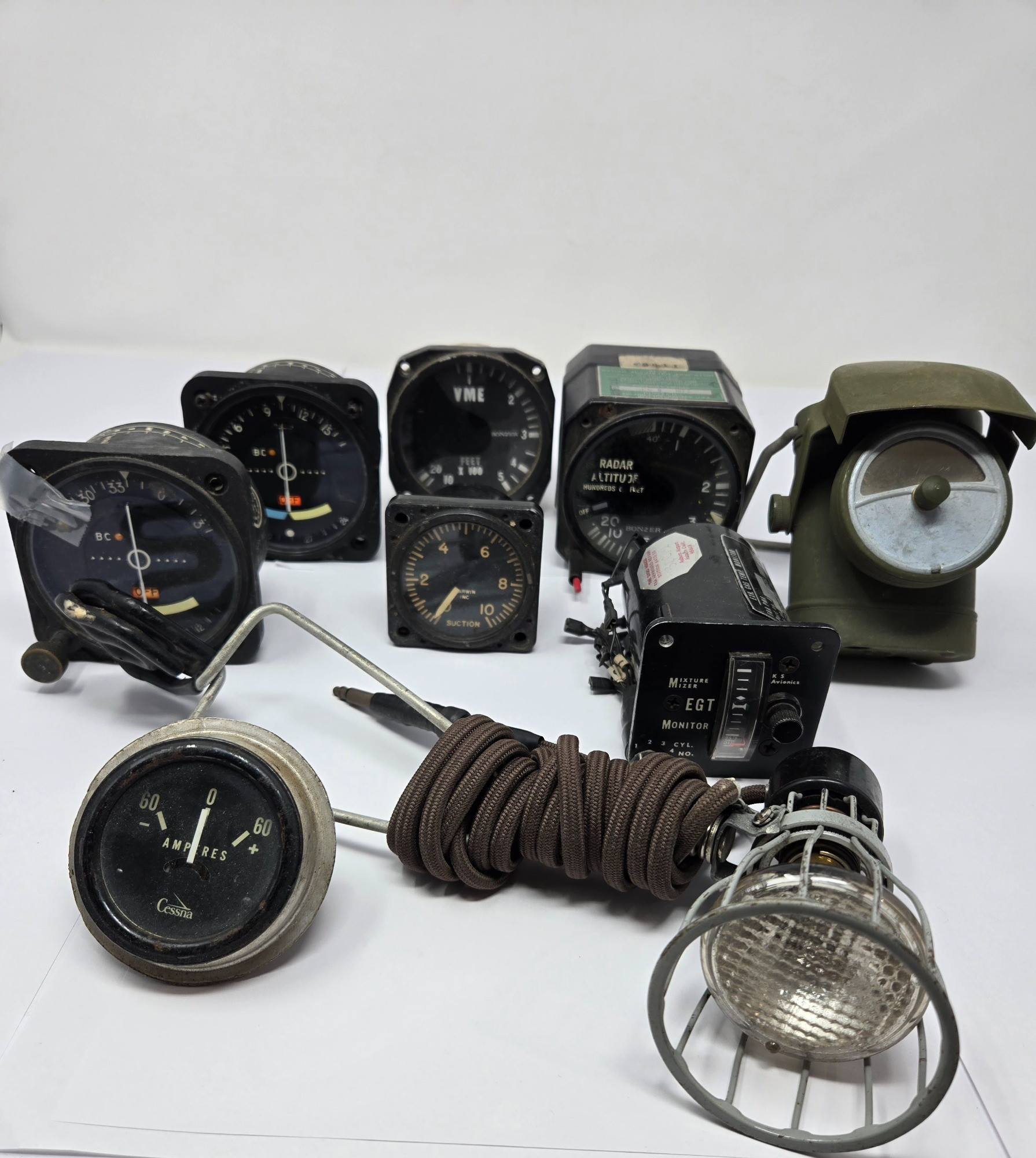 This vintage military equipment lot features an assortment of gauges, dials, and a rugged industrial-style hanging spotlight, all exuding authentic military craftsmanship. The gauges, possibly from aviation or military vehicles, are perfect for collectors, restorers, or creative steampunk projects. The metal-caged spotlight adds a functional and industrial edge, making this a unique find for vintage hardware enthusiasts. Whether you're into military history, repurposed design, or one-of-a-kind décor, this collection is full of cool possibilities!
