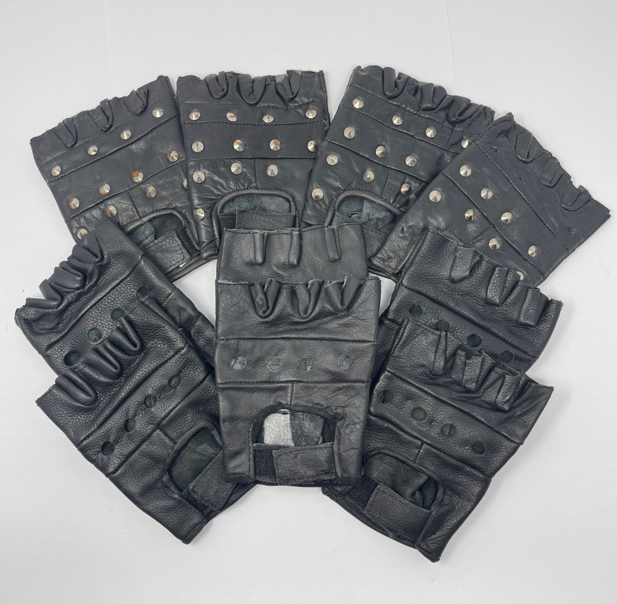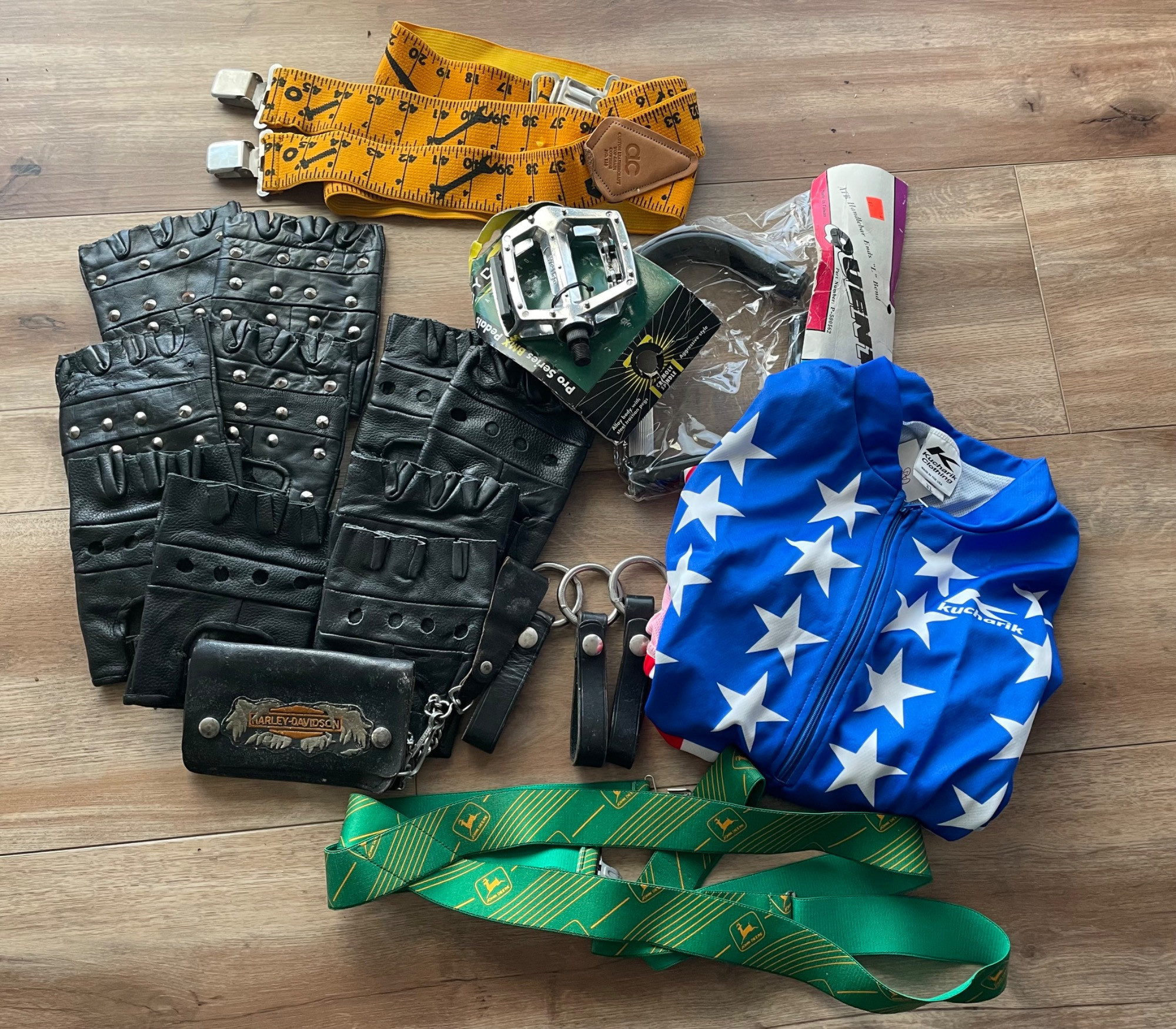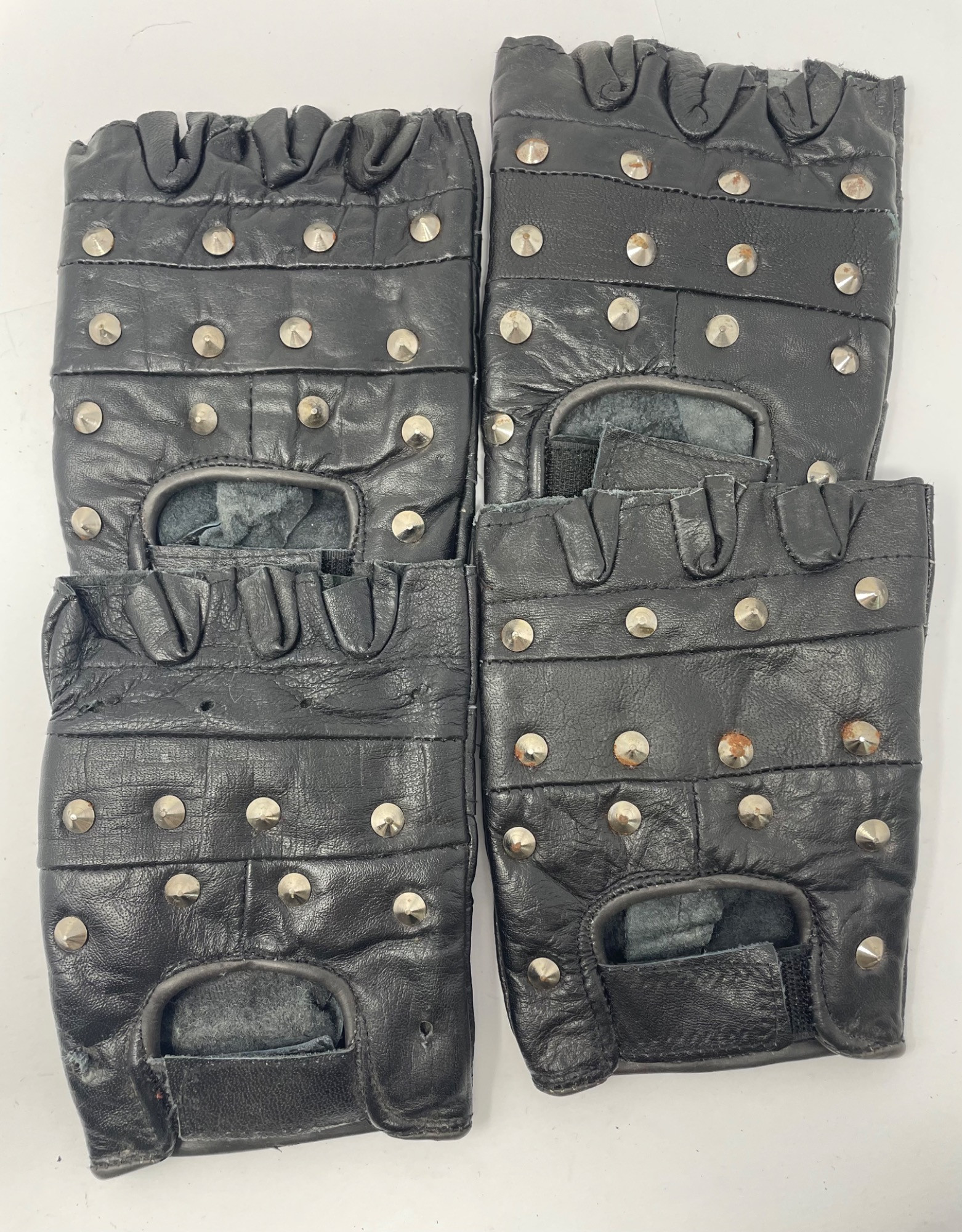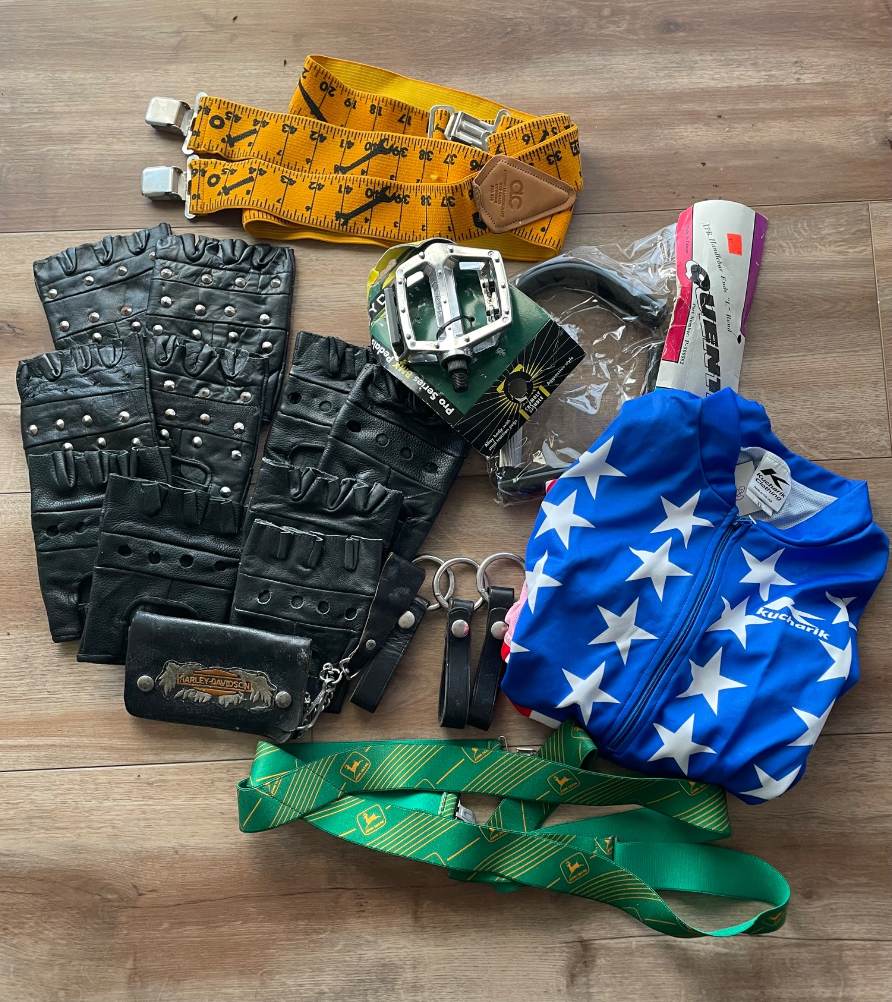 This motorcycle gear lot includes a mix of leather biking gloves, a men's XL patriotic bike jersey, and various accessories. The leather gloves are well-worn, with some featuring metal studs (some missing), adding to their rugged charm. The XL patriotic bike jersey showcases a bold stars-and-stripes design, perfect for riders who love to stand out. Also included are miscellaneous biker accessories, making this a great set for collectors, riders, or those looking to add some vintage gear to their collection.