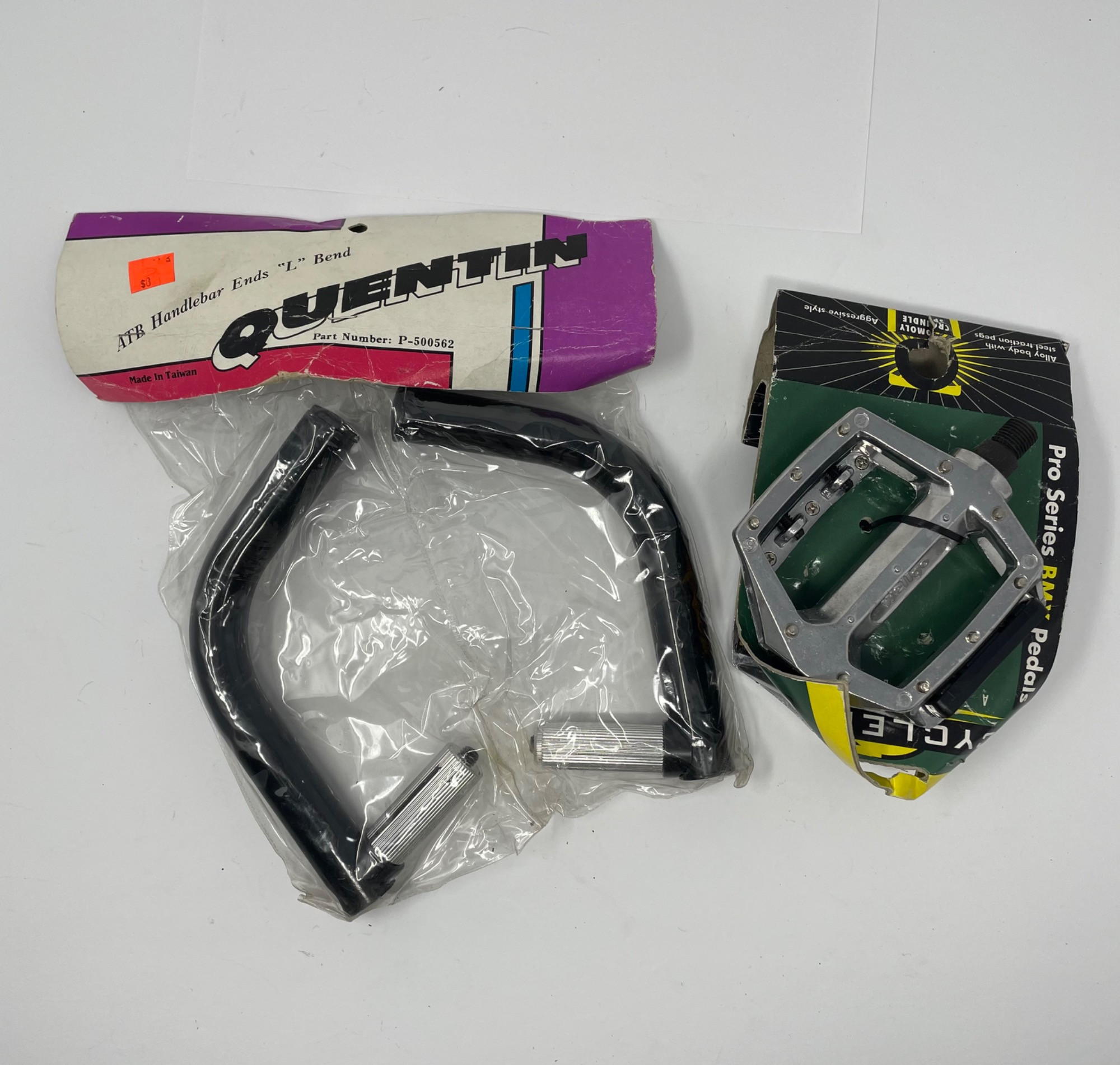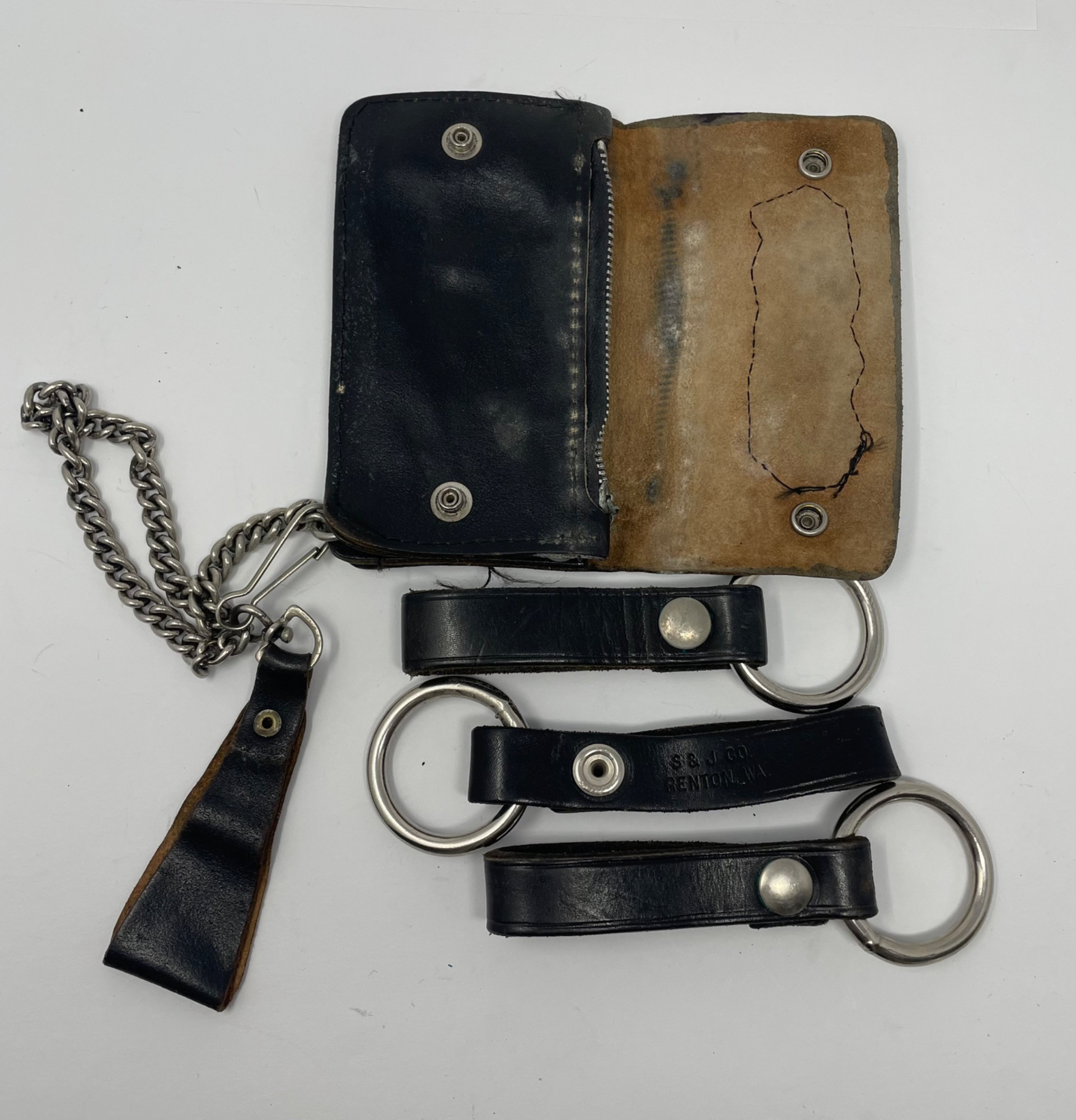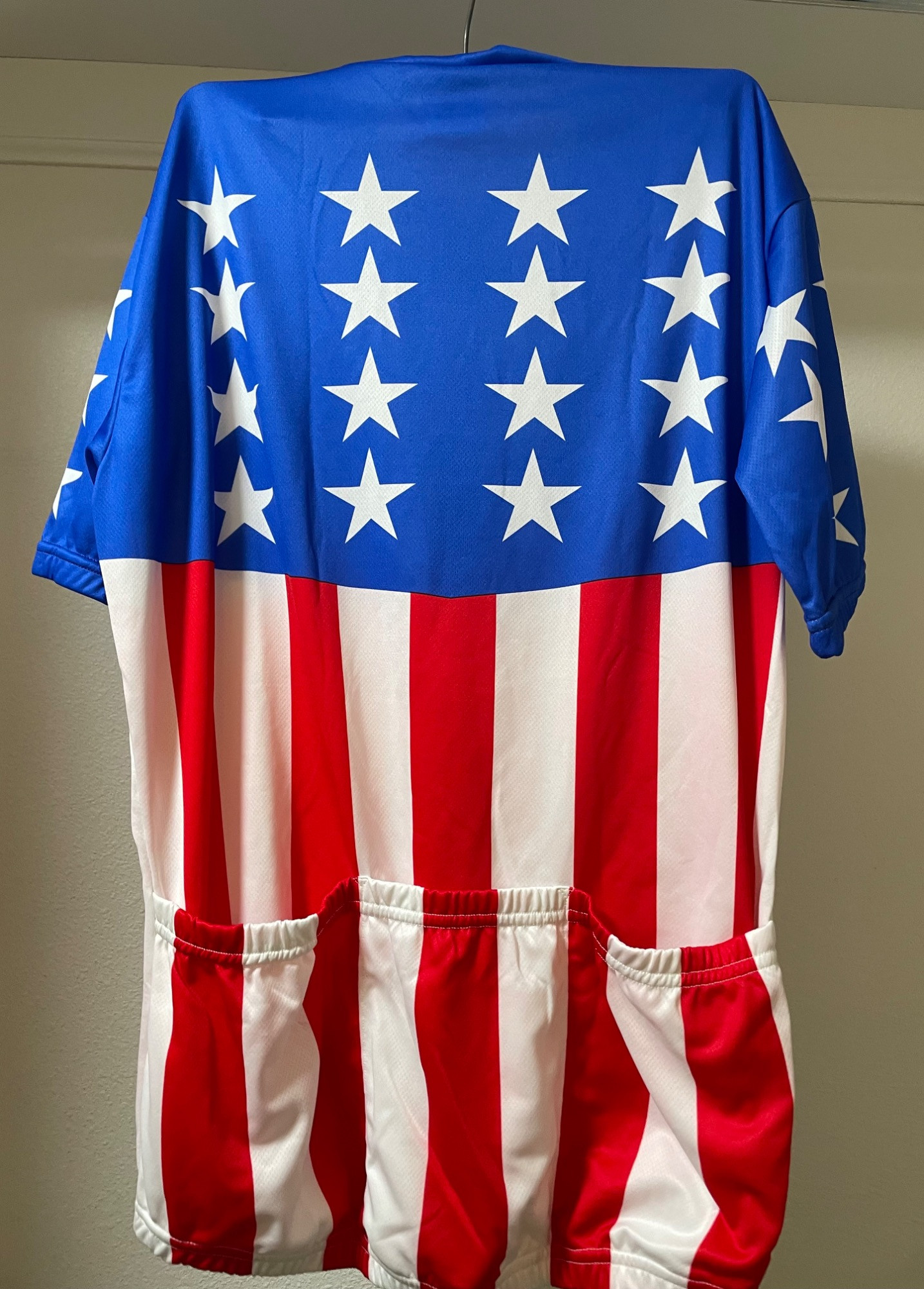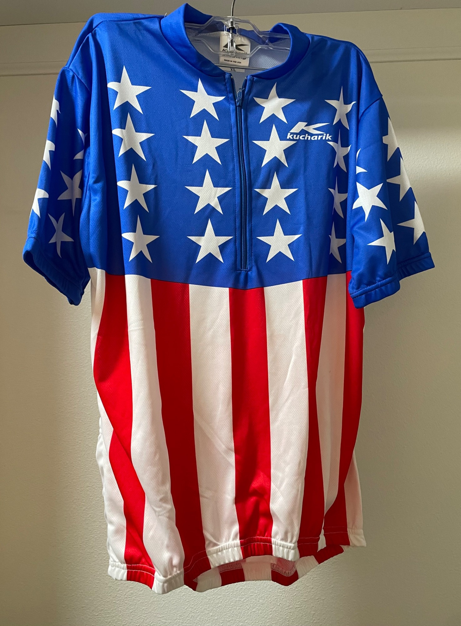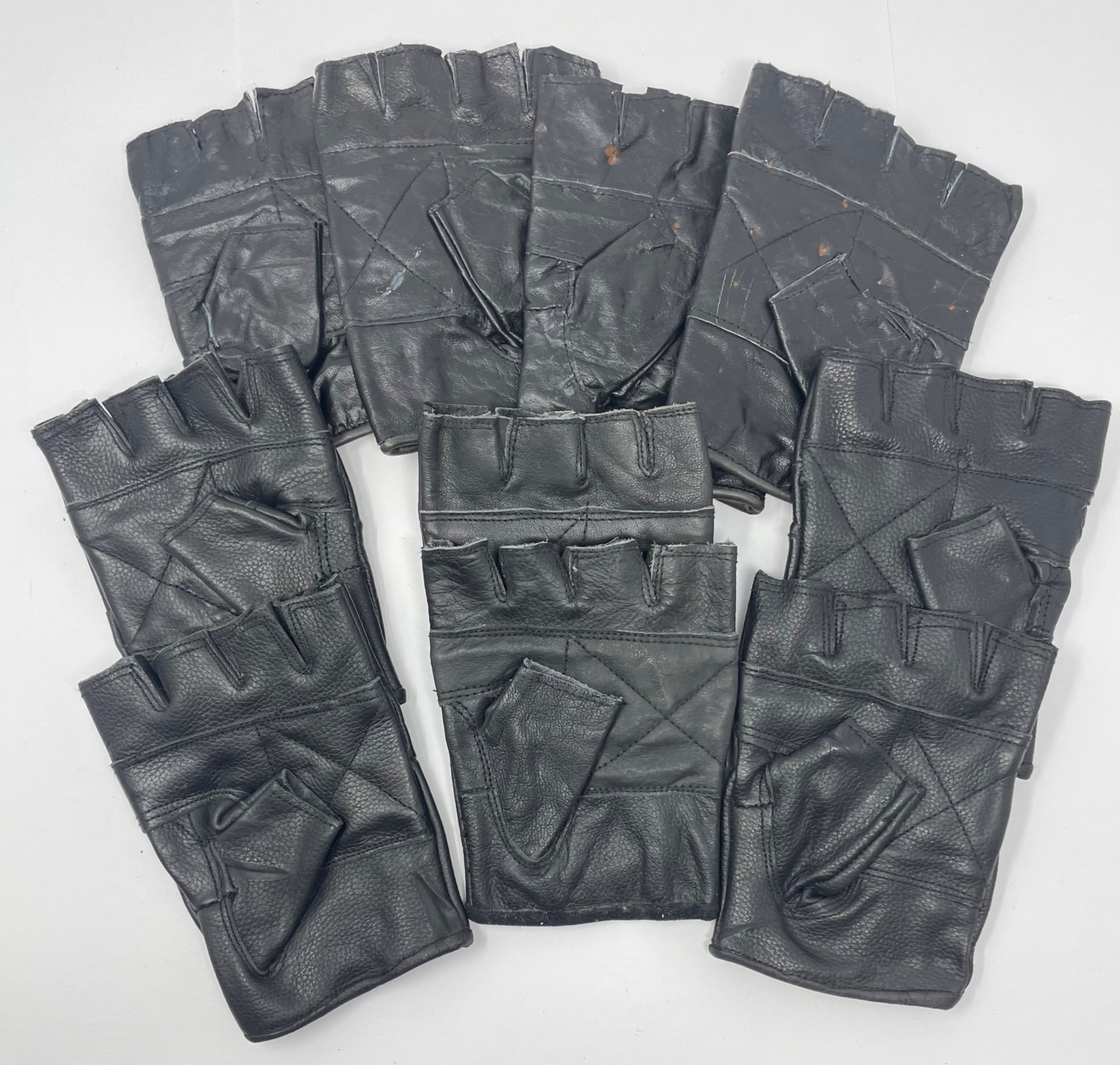 This motorcycle gear lot includes a mix of leather biking gloves, a men's XL patriotic bike jersey, and various accessories. The leather gloves are well-worn, with some featuring metal studs (some missing), adding to their rugged charm. The XL patriotic bike jersey showcases a bold stars-and-stripes design, perfect for riders who love to stand out. Also included are miscellaneous biker accessories, making this a great set for collectors, riders, or those looking to add some vintage gear to their collection.