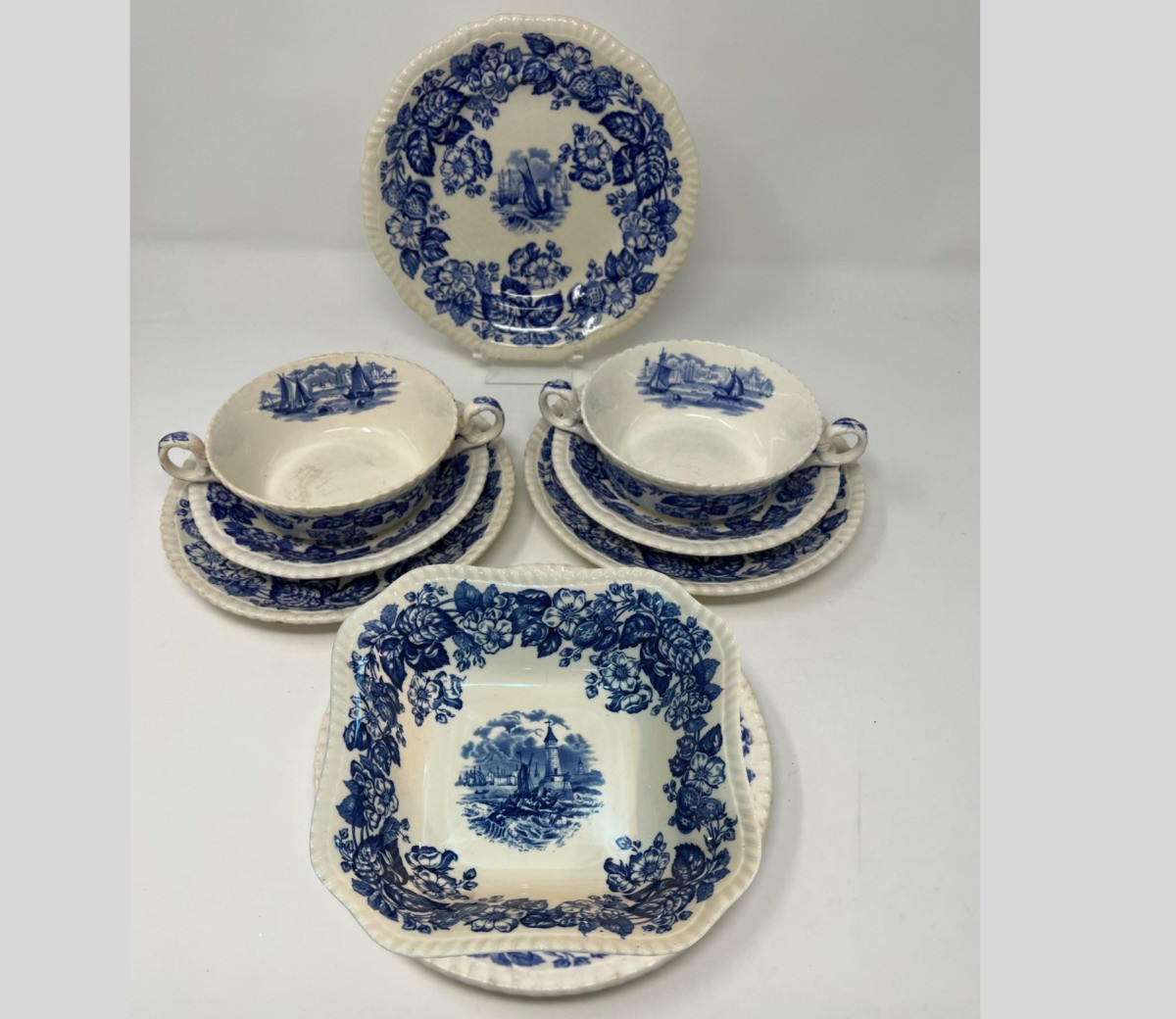Rare blue and white Old Salem pattern by Copeland Spode soup set of two double handled cups and saucers. Included are three snack plates, and soup/salad bowl (squared bottom) and larger 8.75" snack plate that could be used as an underplate for soup bowl or it is a serving plate that has a ring in center where a cup or bowl could set. The edges are scalloped in a pie crust style. Old Salem transfer pattern is dated early 1900's. (note that a few plates have chips - see pictures). Underplate or Snack Plate? - 8.75” diameter Saucer - 6” diameter Salad/Soup Plate - 7” diameter Double handed soup bowls - 5” diameter x 2” height Large Soup/Salad Bowl - 10" hexagon shape.