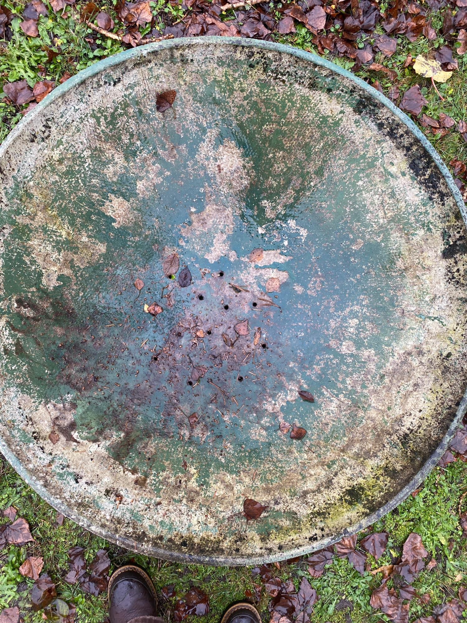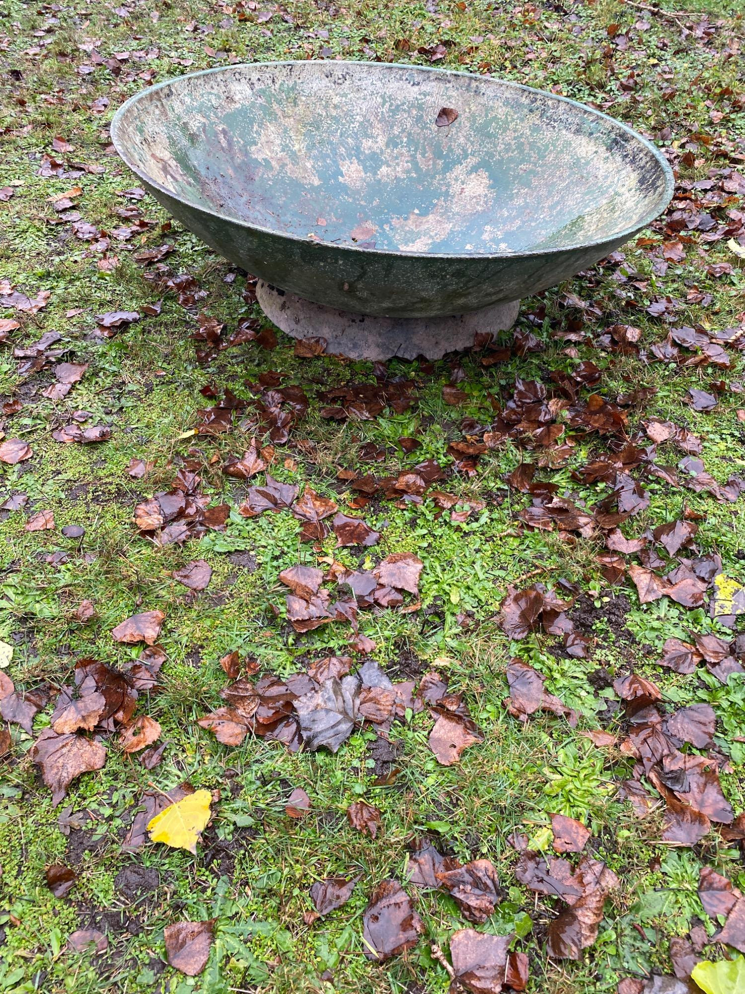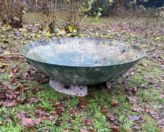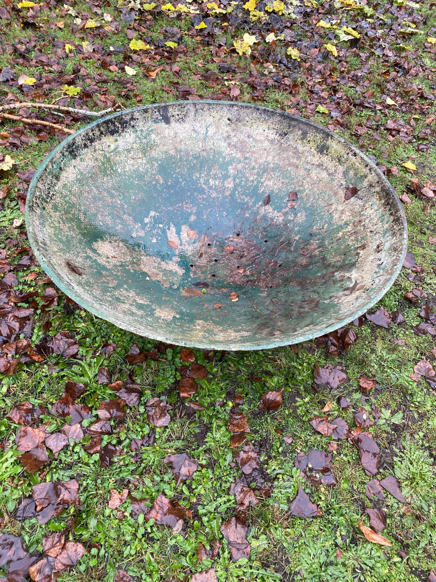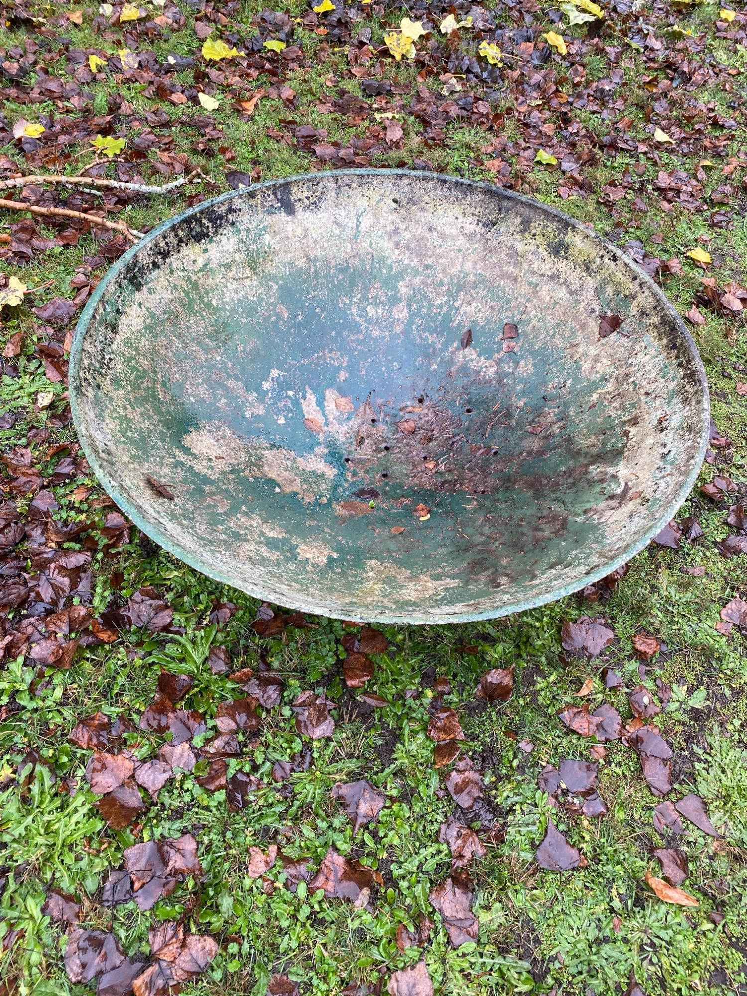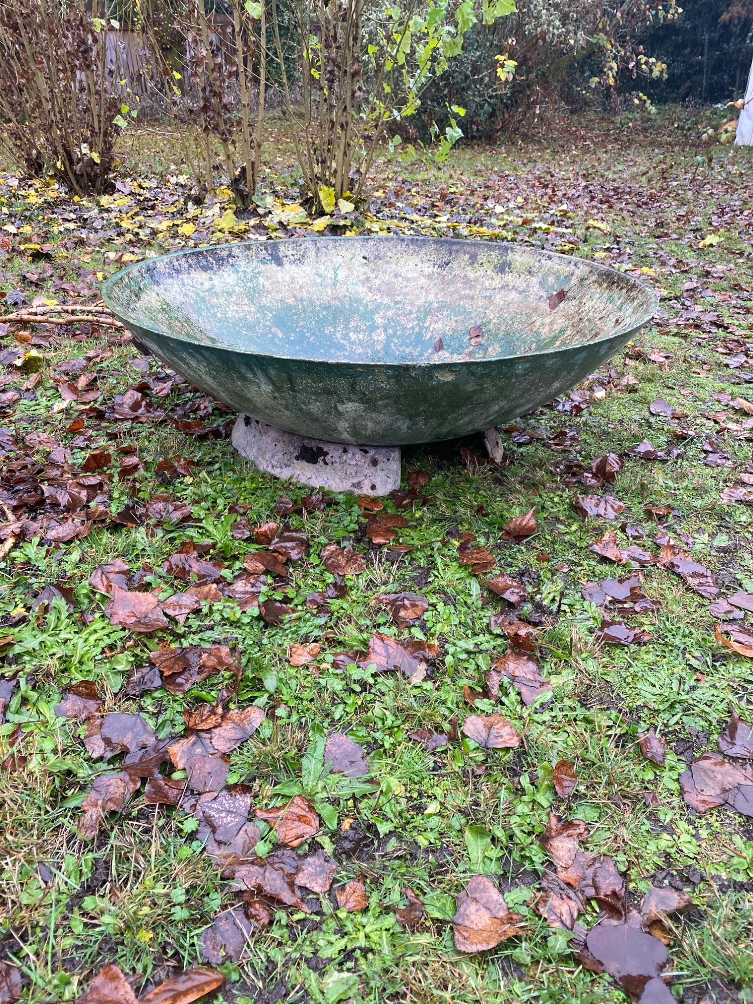 Vintage very large outdoor planter, likely resin or fiberglass. Lightweight and durable, measuring 48 inches across and 12 inches tall. A versatile piece perfect for enhancing any outdoor space.