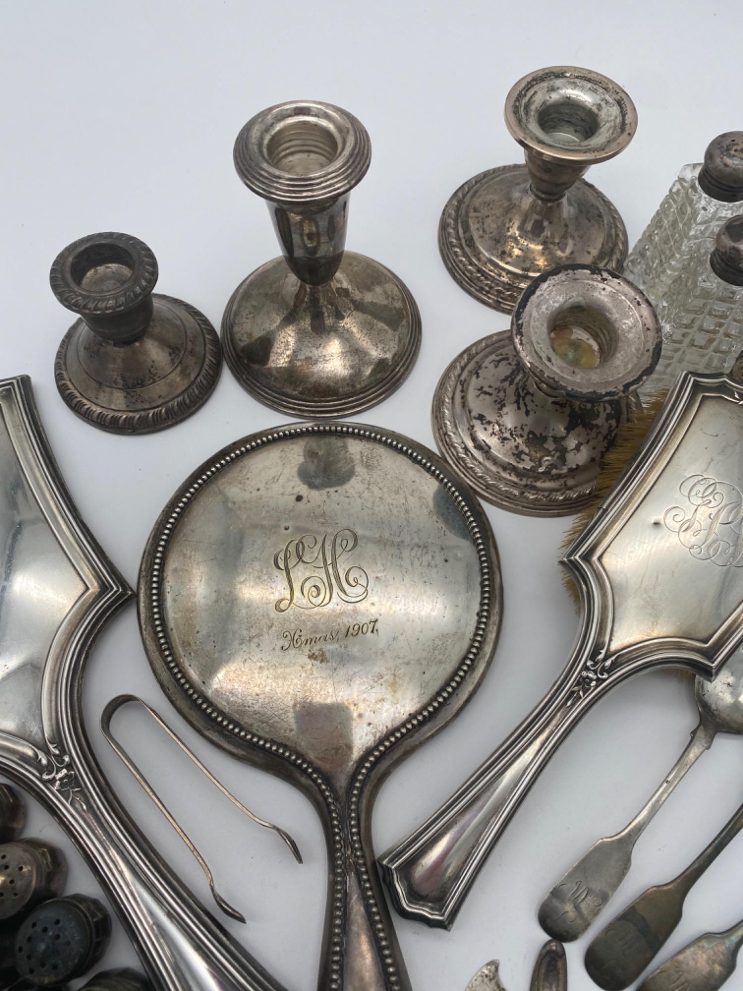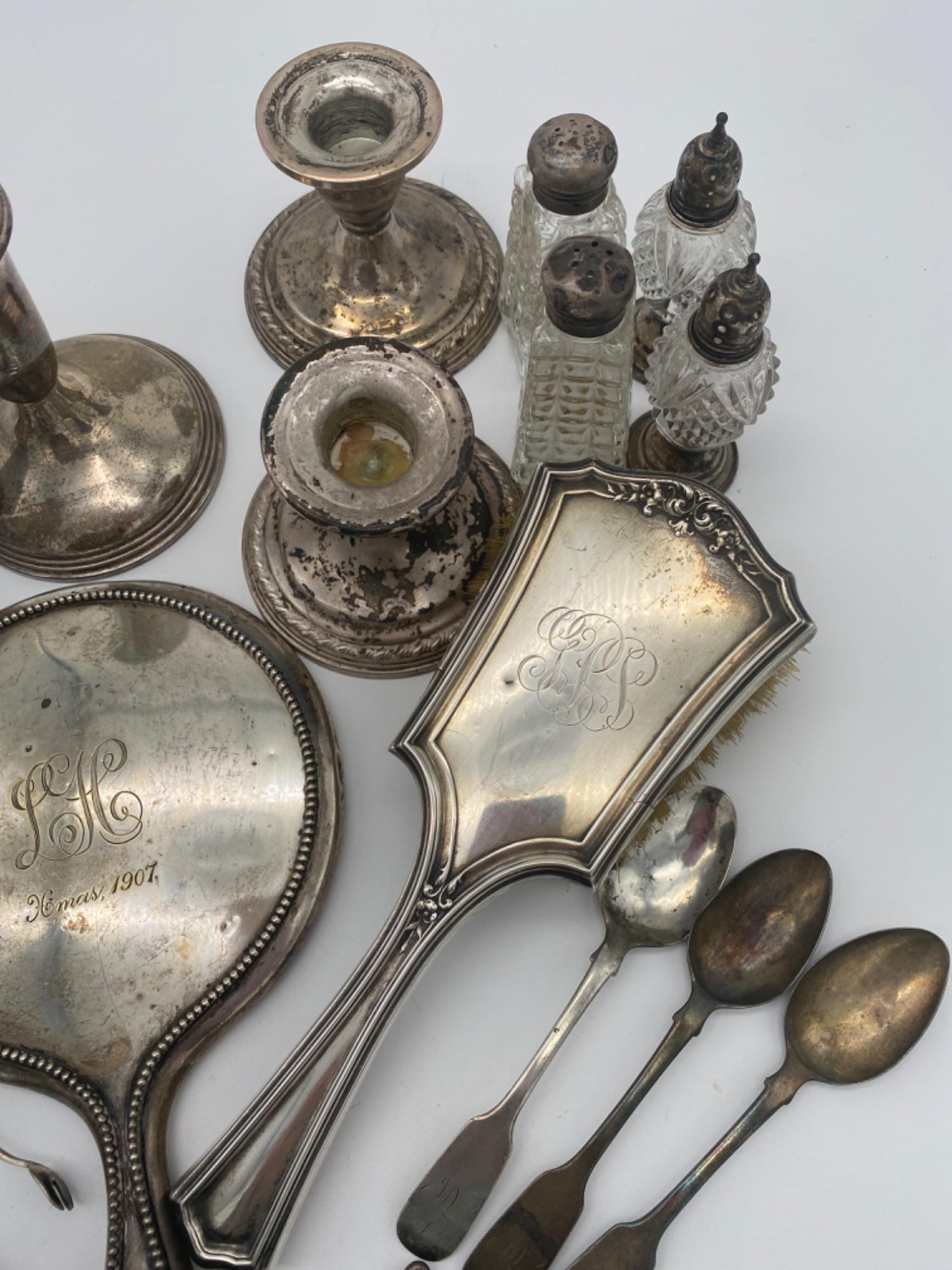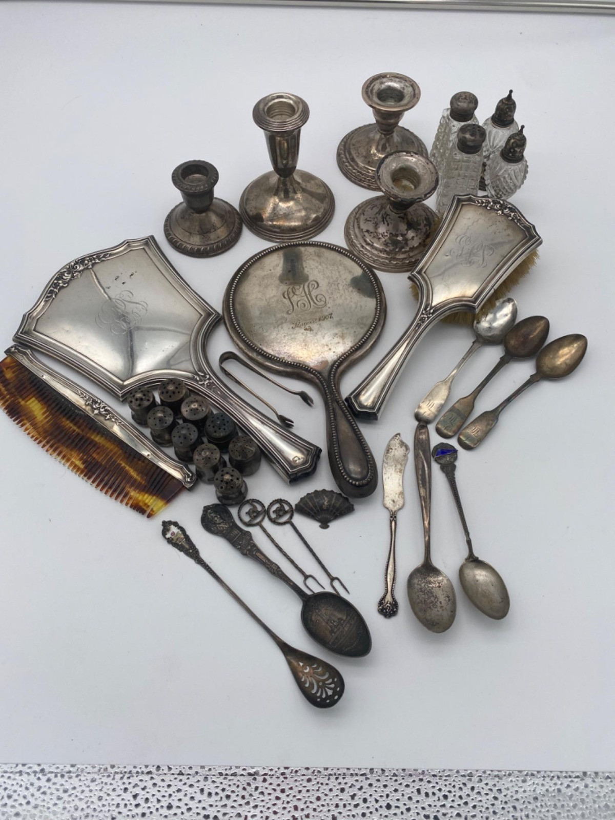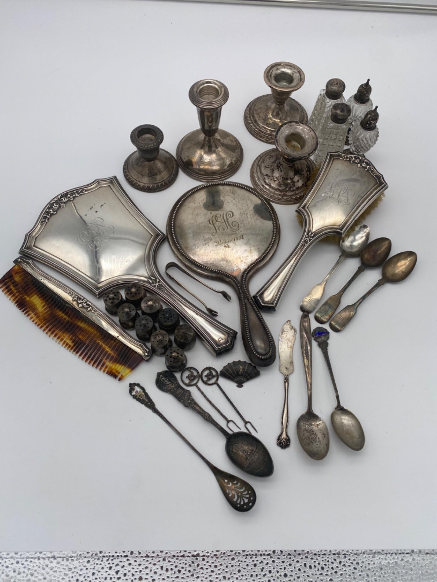 Collection of Sterling Silver Mirror & Brush Set, Spoons, & More. Collection of sterling silver items, including a mirror & brush set, candle holders, spoons, and more. Please note: most pieces show signs of damage and dents, and the comb is not original. See pictures for gram weights and further details on condition. A great lot for collectors or those looking to repurpose sterling silver.