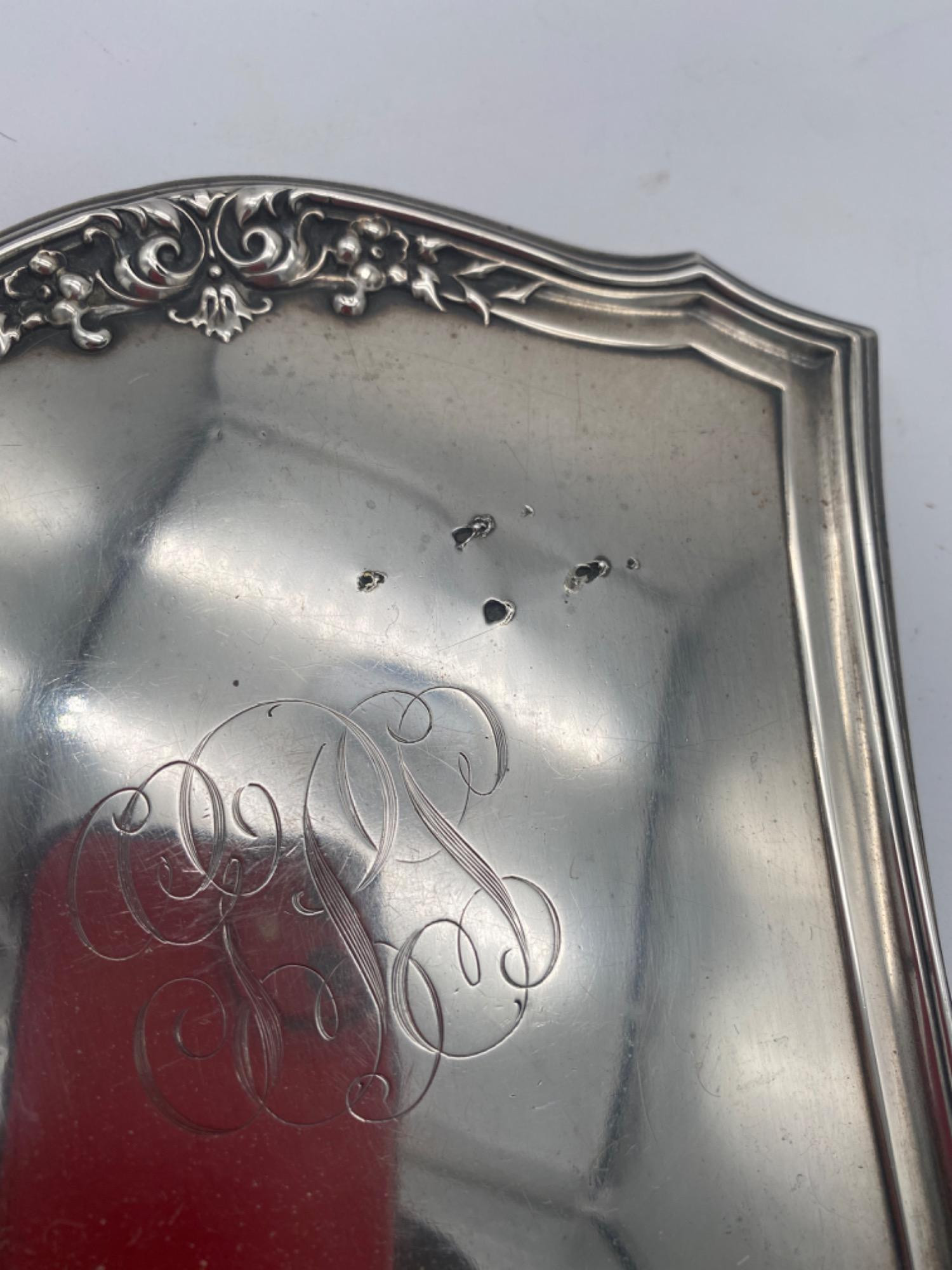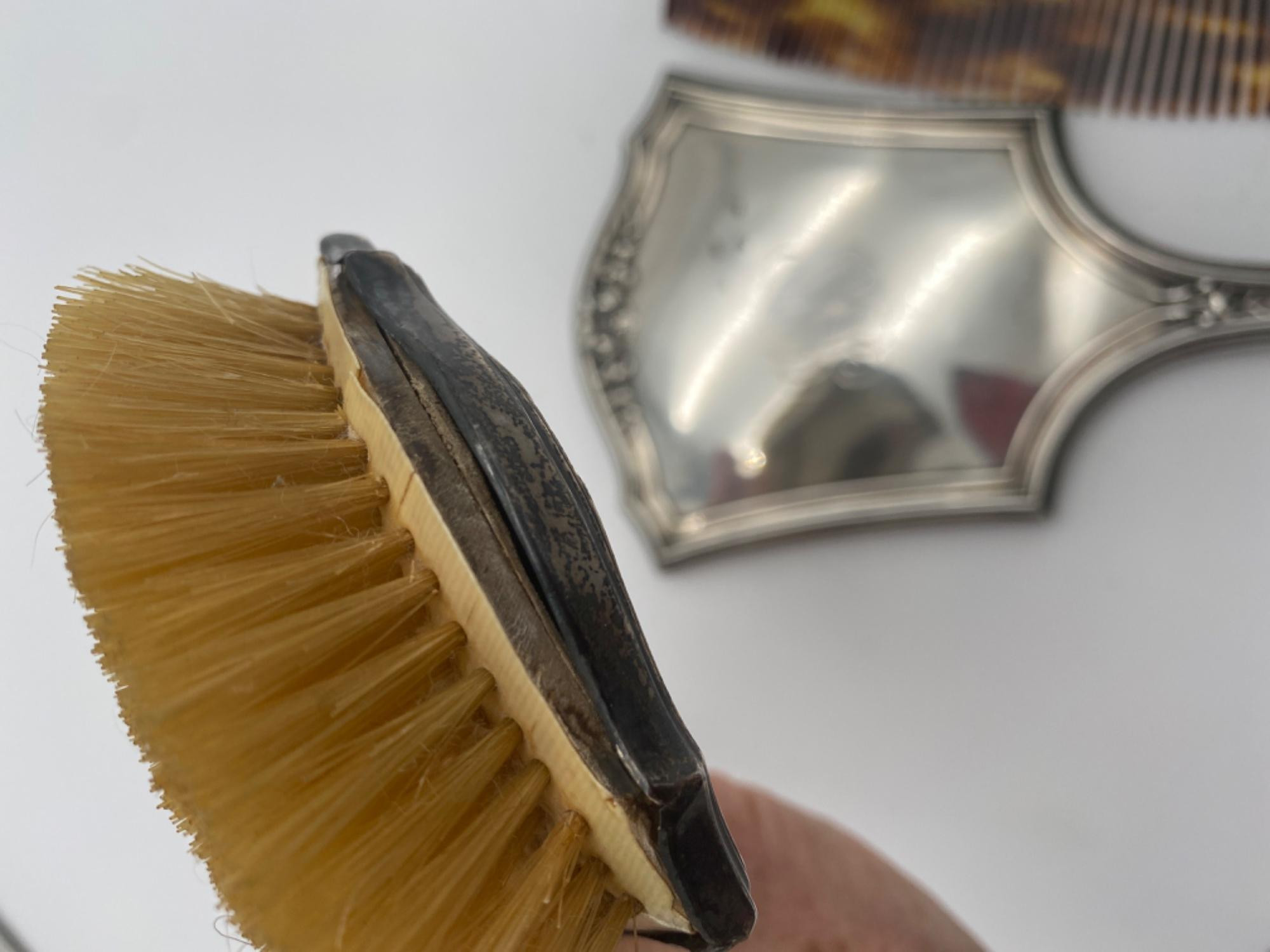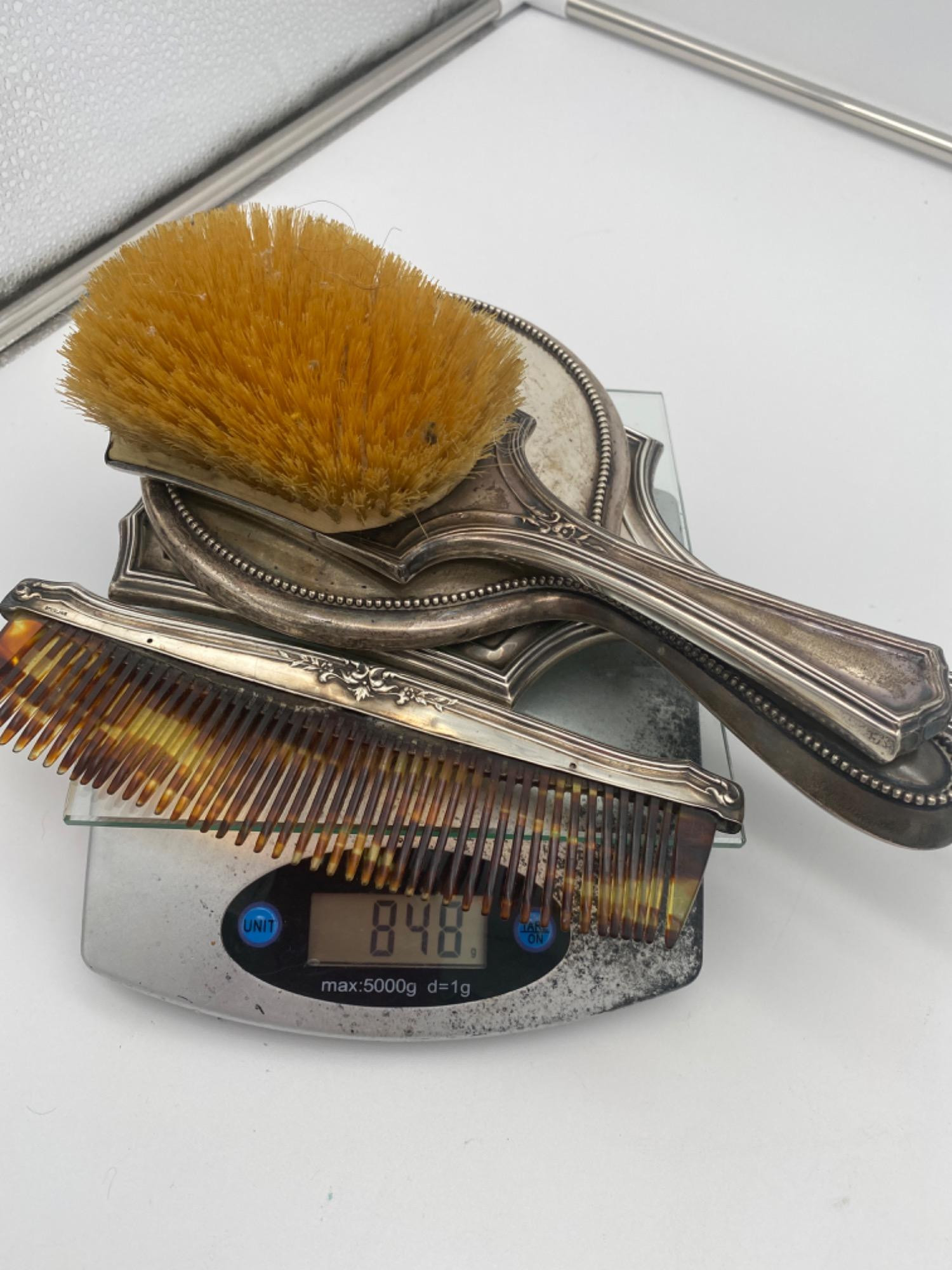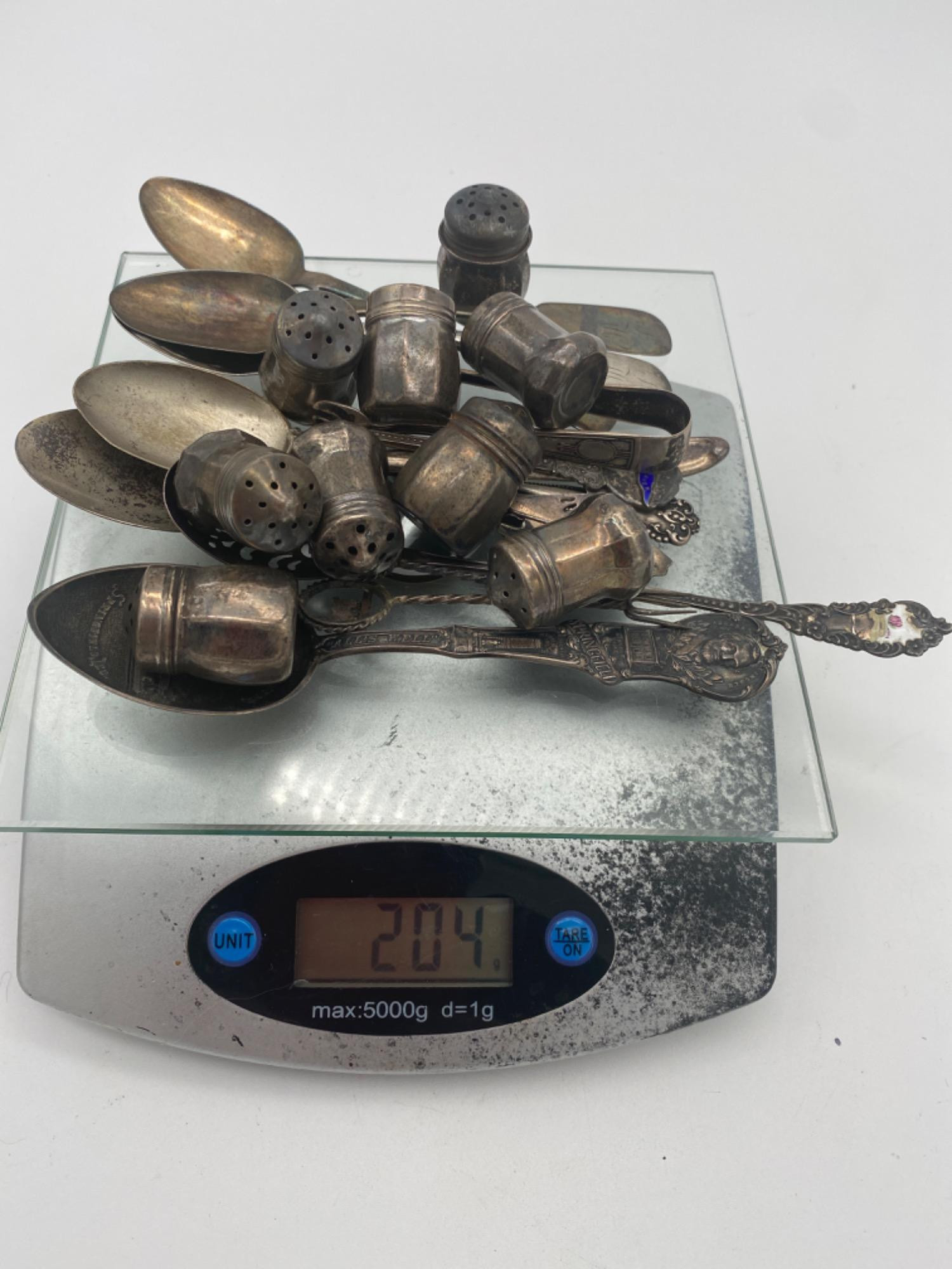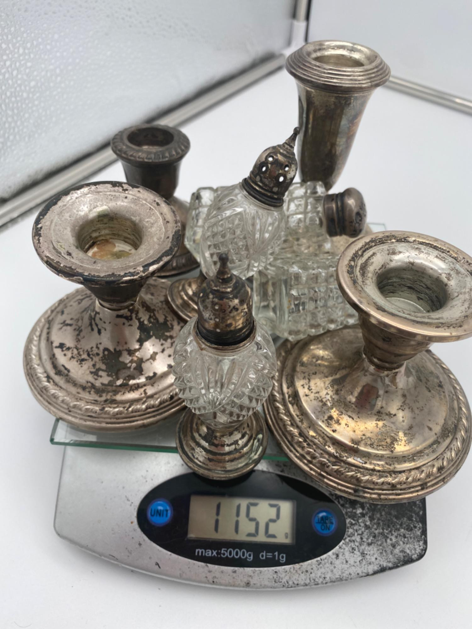 Collection of Sterling Silver Mirror & Brush Set, Spoons, & More. Collection of sterling silver items, including a mirror & brush set, candle holders, spoons, and more. Please note: most pieces show signs of damage and dents, and the comb is not original. See pictures for gram weights and further details on condition. A great lot for collectors or those looking to repurpose sterling silver.