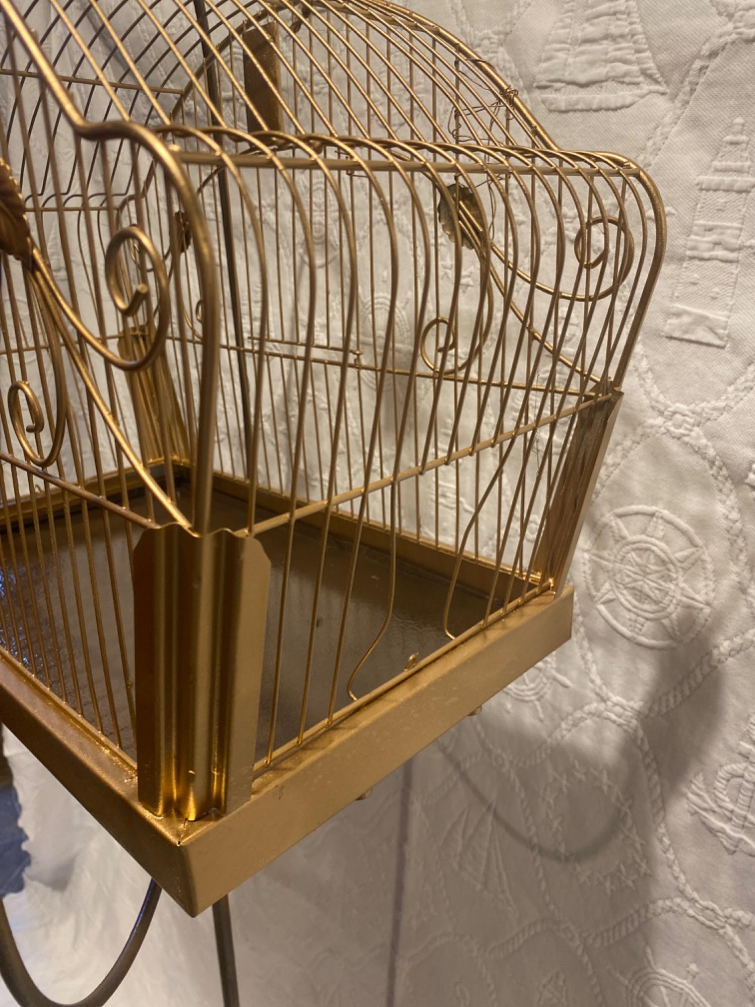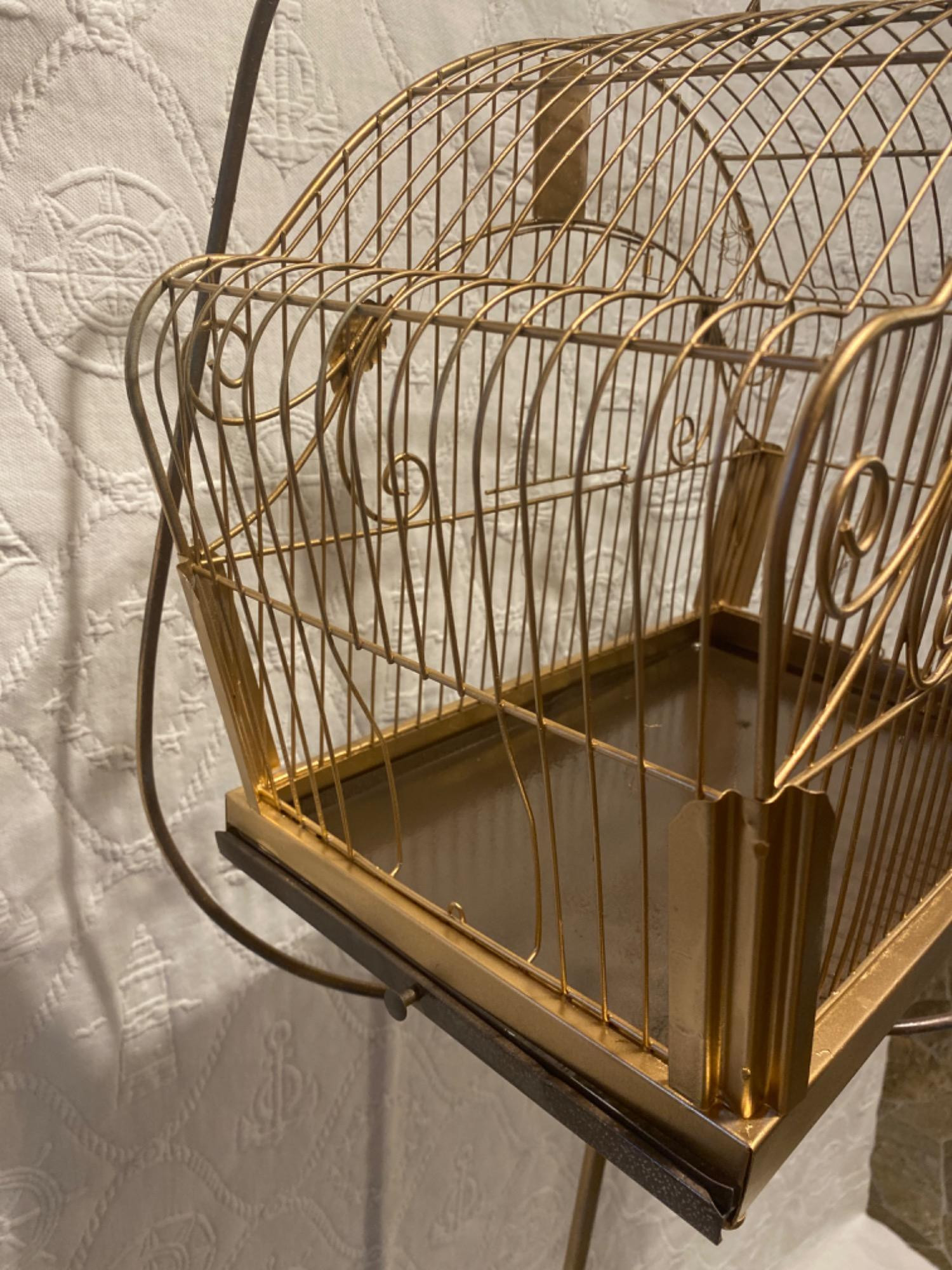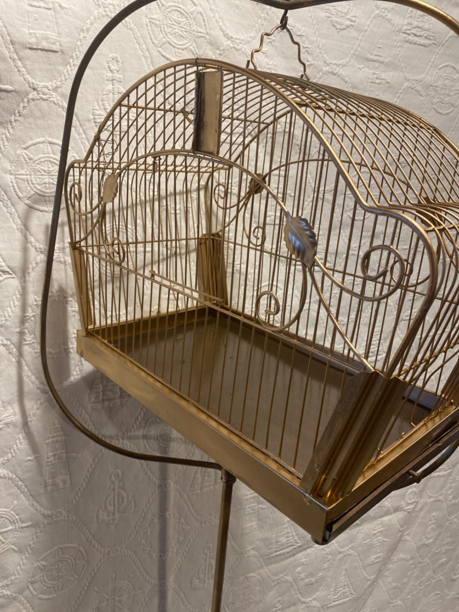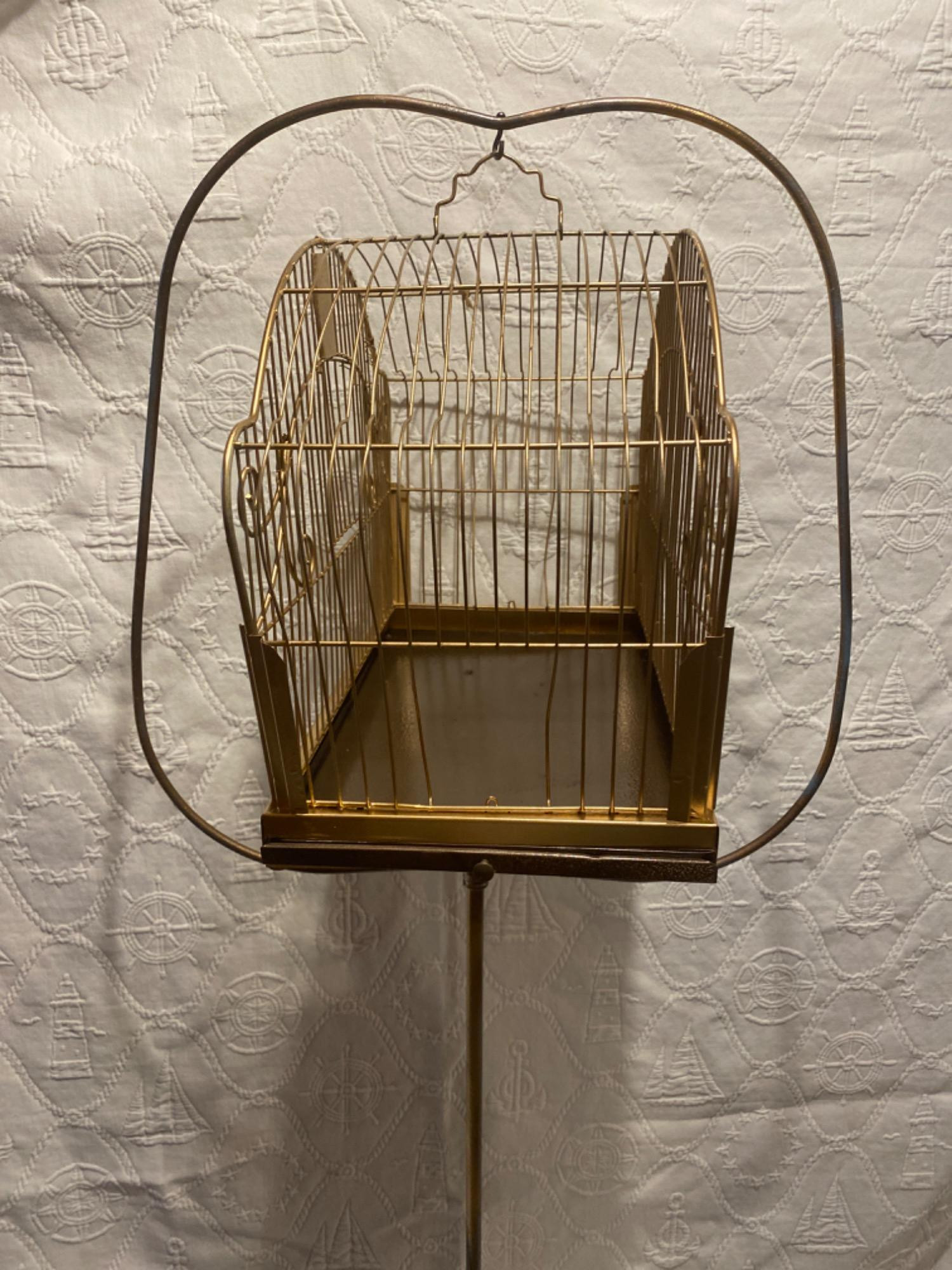 Vintage Gold Tone Bird Cage w/ Stand - Unique Shape & Design. Vintage gold-tone bird cage with stand, featuring a unique shape and design. The cage measures 17 x 13 x 9 inches, while the stand stands 61 inches tall. No names or markings are found on the cage or stand, making it a versatile addition to any collection or space.