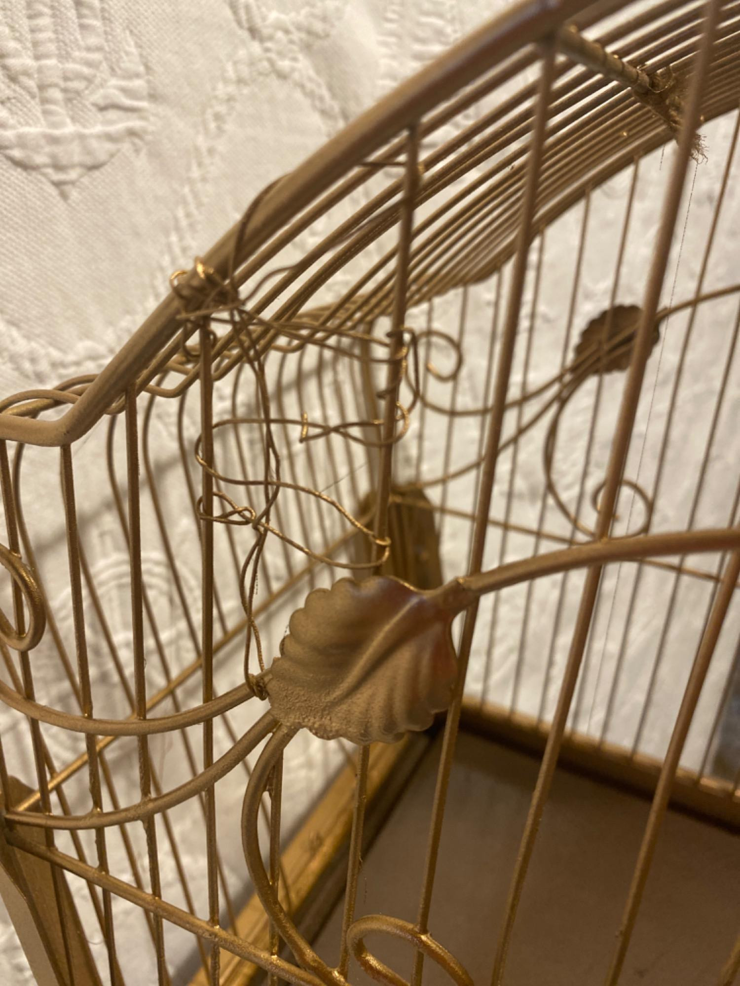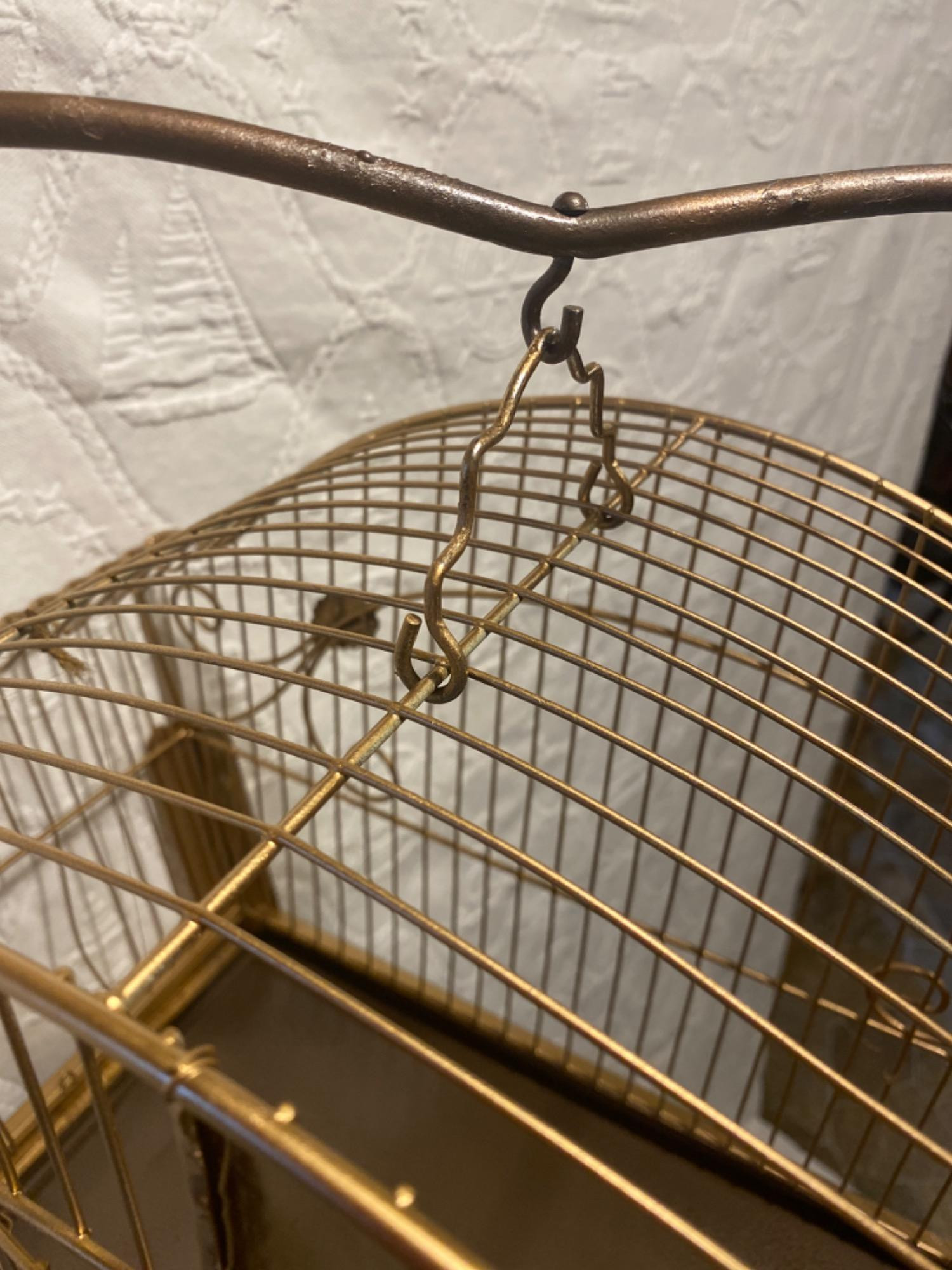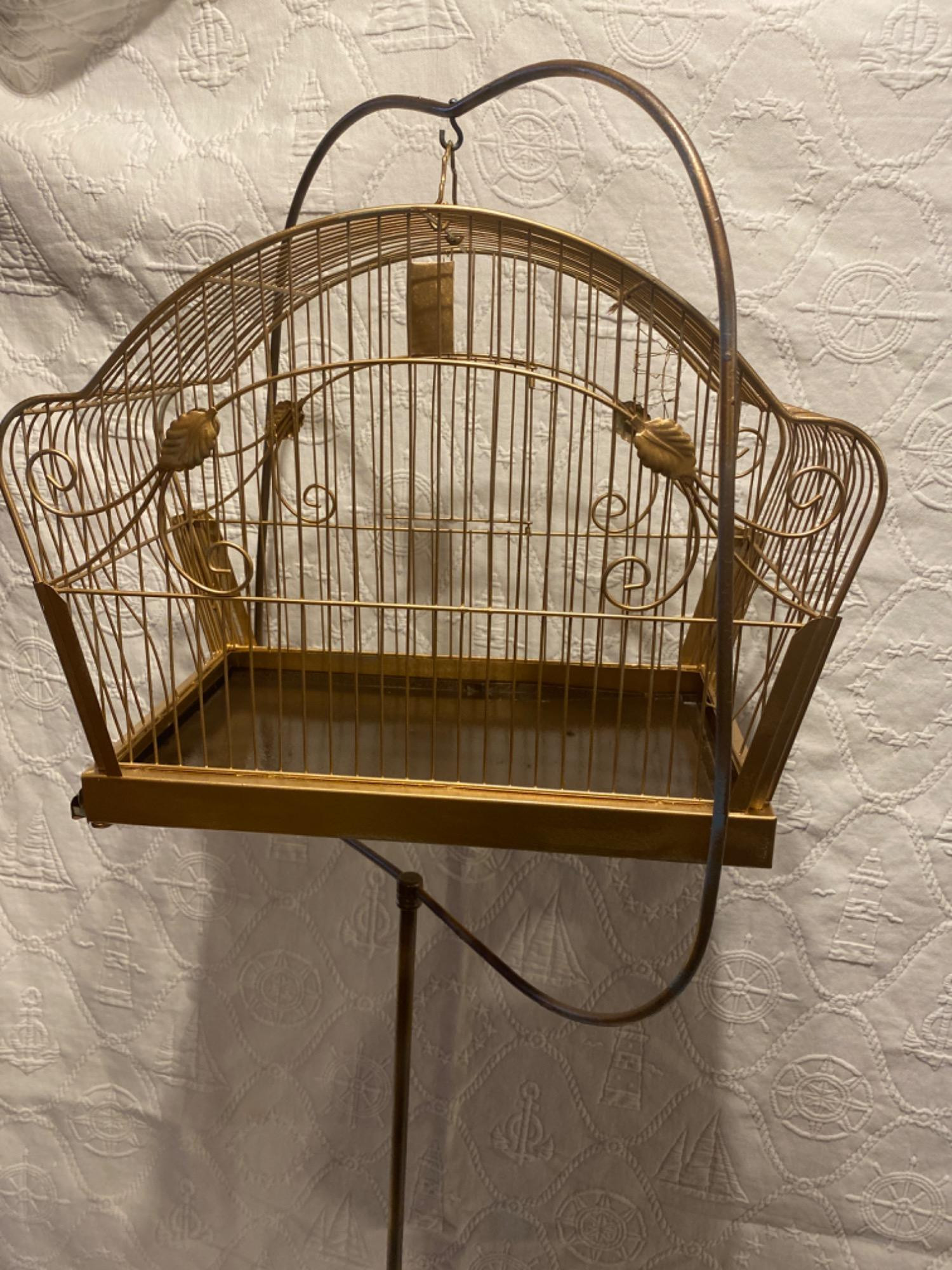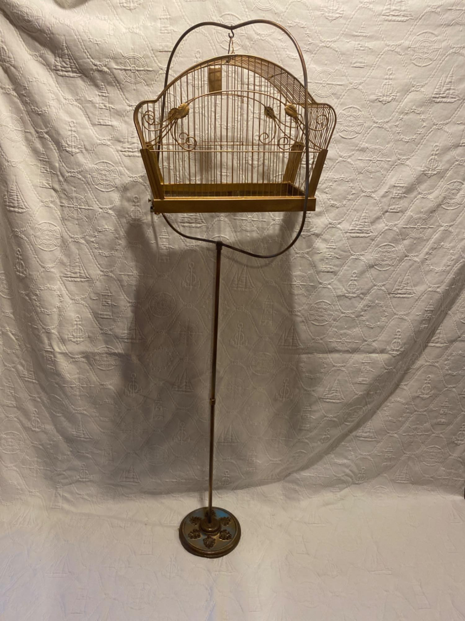 Vintage Gold Tone Bird Cage w/ Stand - Unique Shape & Design. Vintage gold-tone bird cage with stand, featuring a unique shape and design. The cage measures 17 x 13 x 9 inches, while the stand stands 61 inches tall. No names or markings are found on the cage or stand, making it a versatile addition to any collection or space.