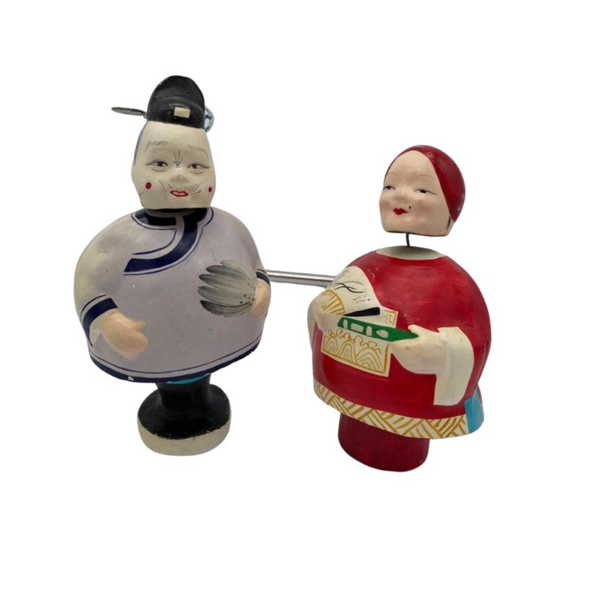 Rare Pair Vintage Chinese Nodding Dolls, Papier-Mâché Figurines, 1920s. This charming Chinese couple is always nodding in agreement, with the man standing approximately 8 inches tall and the lady around 7 inches tall. Minor paint loss on the lady’s dress and a small crack on the man’s head, but both are otherwise in great vintage condition, making them a unique and collectible set.