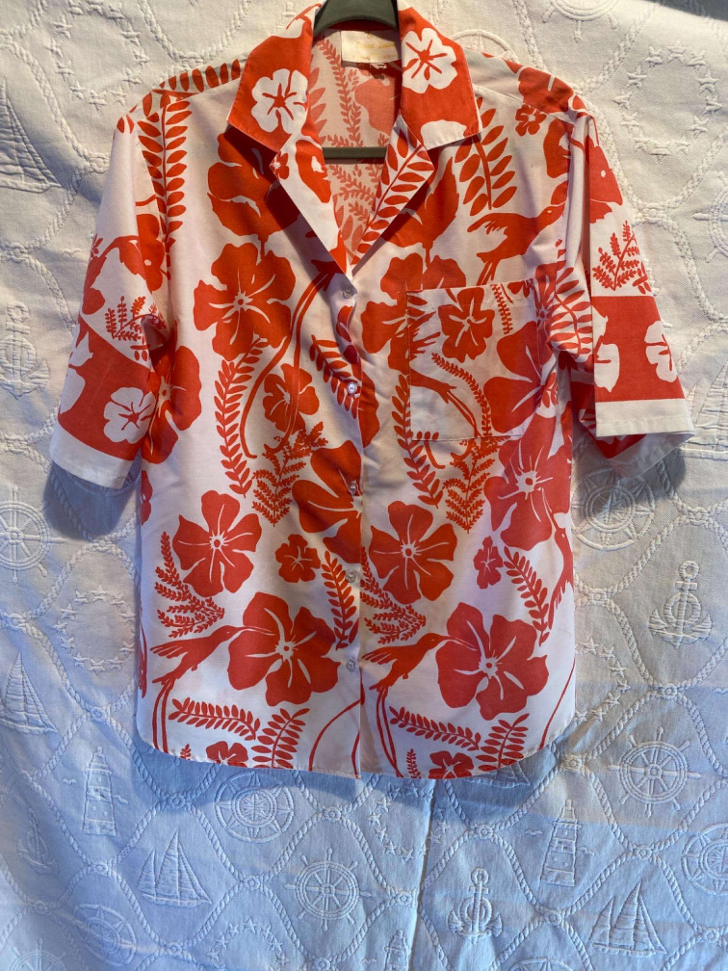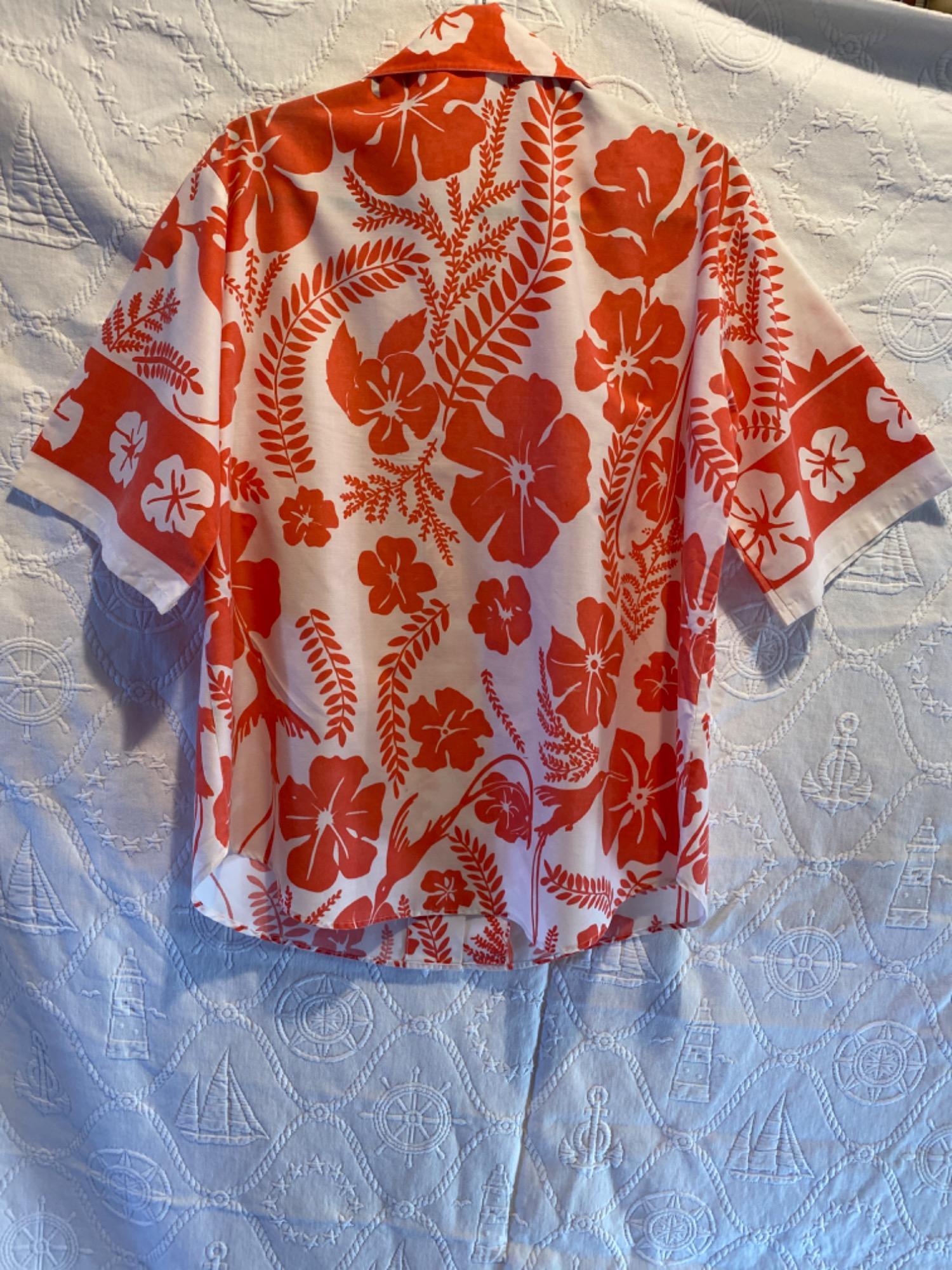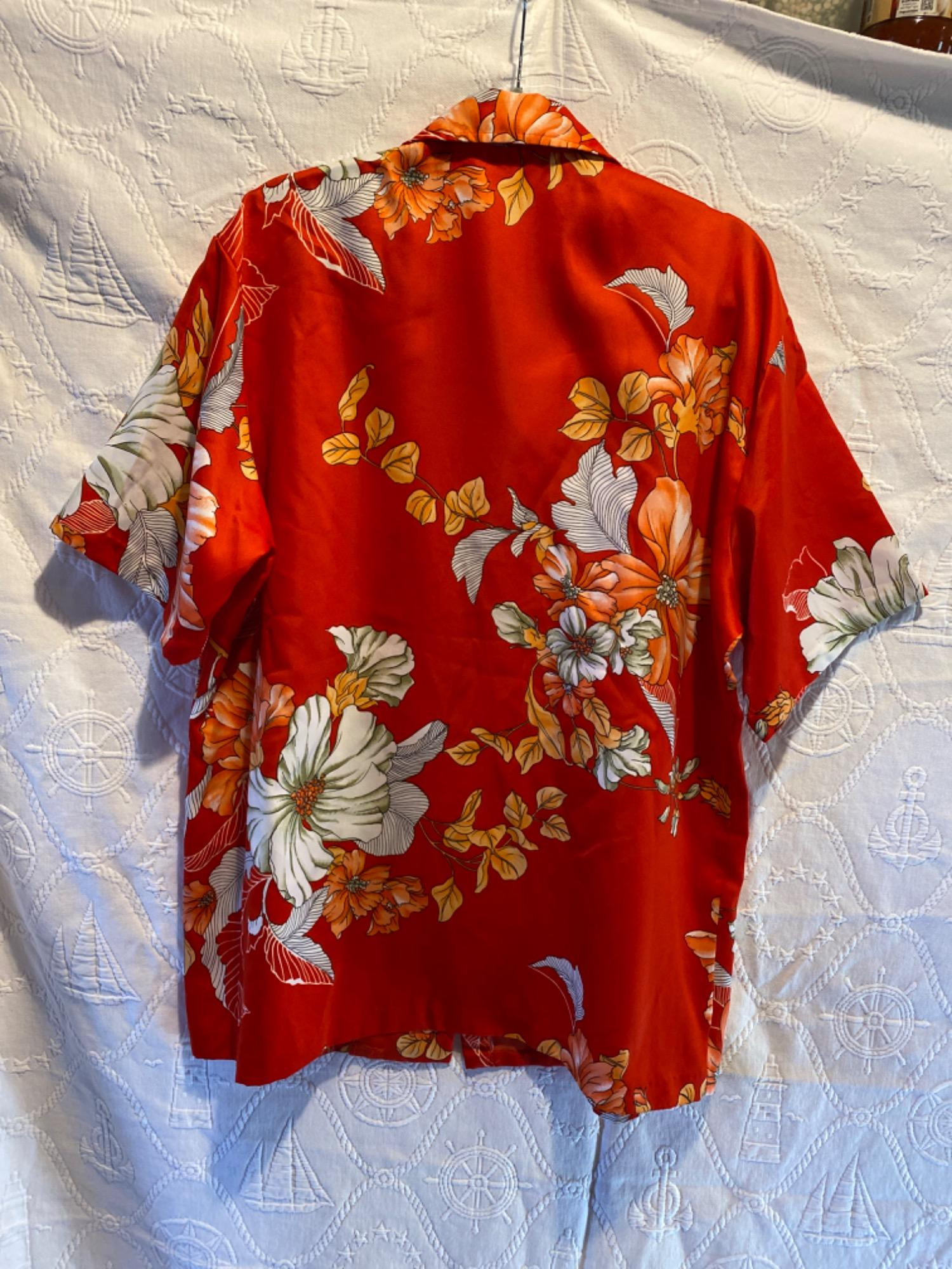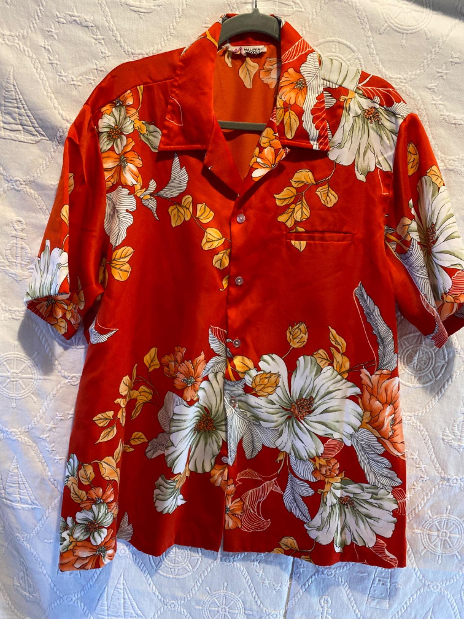 Vintage Hawaiian Shirt Trio: Pineapple Connection, Malihini Hawaii + Vintage Hawaiian shirt trio, including Pineapple Connection, Malihini Hawaii, and another unique design. The set features a button-down collared casual shirt with palm trees from Pineapple Connection, a short-sleeve button-front shirt from Malihini Hawaii, and a third vibrant design. Two shirts are marked as size large, and the red one appears to be a large as well.