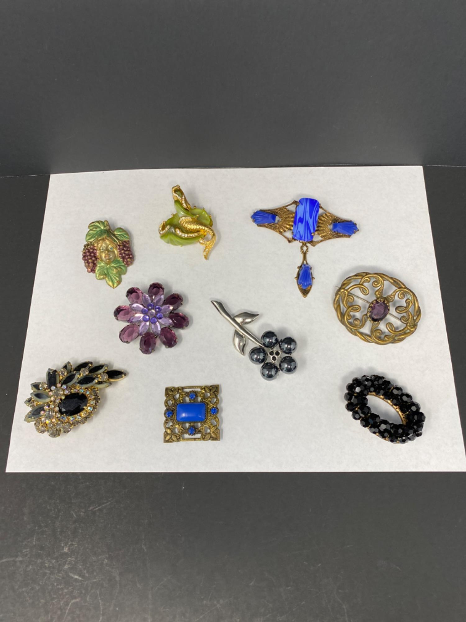 Lot # 15 - 9 Colorful Vintage Brooches: Rhinestones, Glass, & Mixed Materials