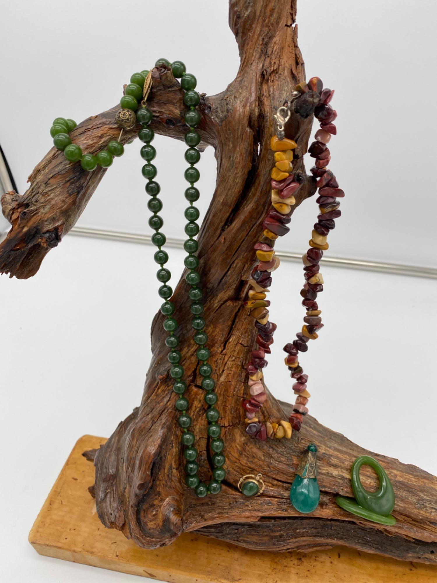 Mookaite & Green Bead Necklace Set w/ Pendants & Bracelet. Mookaite Necklace: 17 Inches (Unclasped) Green Bead Necklace: 19 Inches (Unclasped), Individually Knotted Green Bead Bracelet: Approximately 3 1/2 Inches (Requires Restringing) Smallest Pendant: 1 Inch Two Oval Pieces & One Pendant: 1 1/2 Inches Each