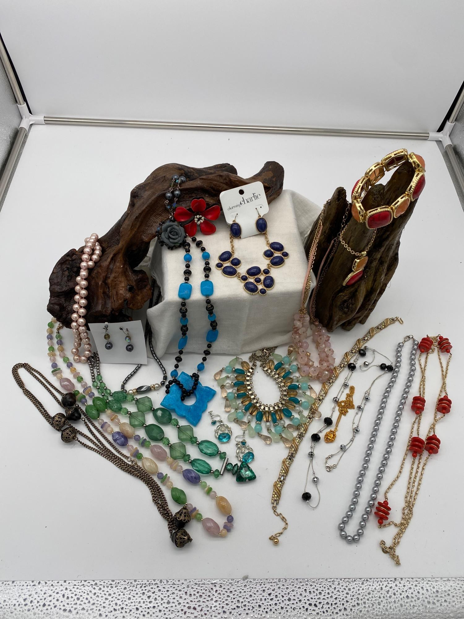 Just plain fun and bursting with color! A faux jewelry extravaganza featuring necklaces, earrings, bracelets, and more. Perfect for accessorizing, crafting, or simply enjoying a vibrant collection of playful pieces.