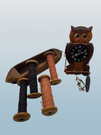 Vintage Tezuka Owl Cuckoo Clock w/ Bobbins & Shuttle. The owl clock stands 10 1/2 inches tall, with moving eyes, though the chain cannot be pulled down. The shuttle measures 26 inches long, and the bobbins, at 7 inches long, are too large to fit inside. A charming and eclectic combination for collectors or display.