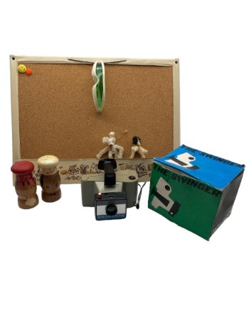 Fun Finds from the Past! A nostalgic collection of toys and collectibles from the '50s, '60s, and '70s. Includes Salty and Peppy shakers in great shape, two adorable chenille pipe cleaner animals with googly eyes, an untested Polaroid Swinger camera with its original box, exceedingly cool FG-marked sunglasses (some yellowing of the white plastic), and a 20 x 15 cork board for displaying your favorite memories. A treasure trove of retro charm!