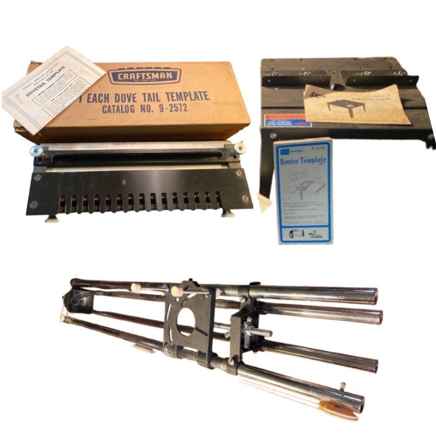 4 router accessories including a new-in-box Craftsman router template, Craftsman dovetail template, SKIL router and jigsaw table, and a router slide (46 inches long, with one chipped wheel). A great set to enhance your woodworking projects!