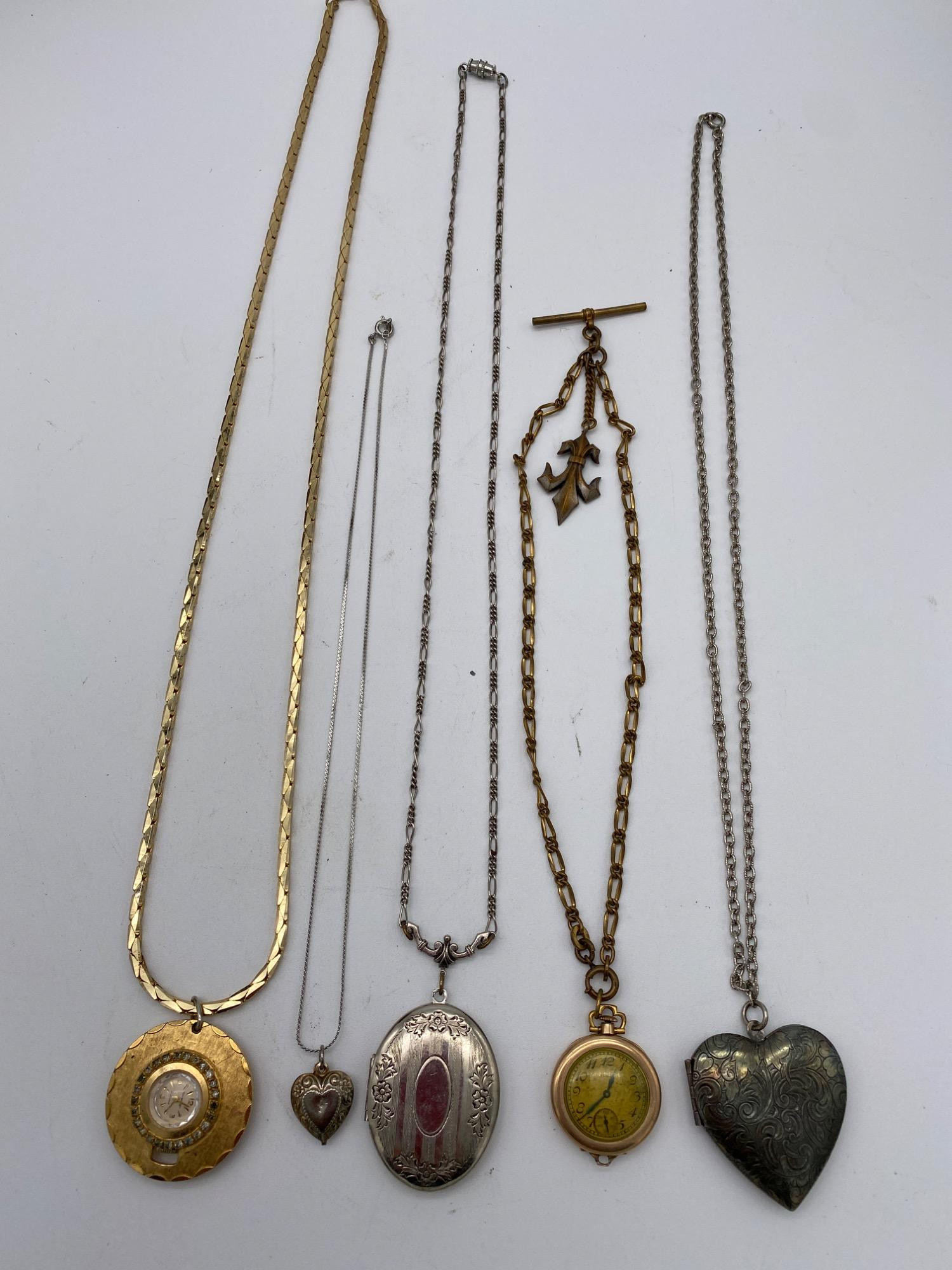 Elgin and Sovereign watches paired with two locket necklaces and other vintage pendant necklace. The Elgin watch measures 1 1/4 inches wide, and the Sovereign is a 17-jewel watch. Neither watch is currently working