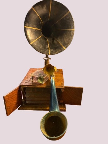 Vintage Victrola parts including a large black metal horn (14 1/2 inches across), a blue metal horn (17 inches long), a Victrola case (12 x 11 inches), and a working plastic music box. A unique lot for collectors or restoration projects!