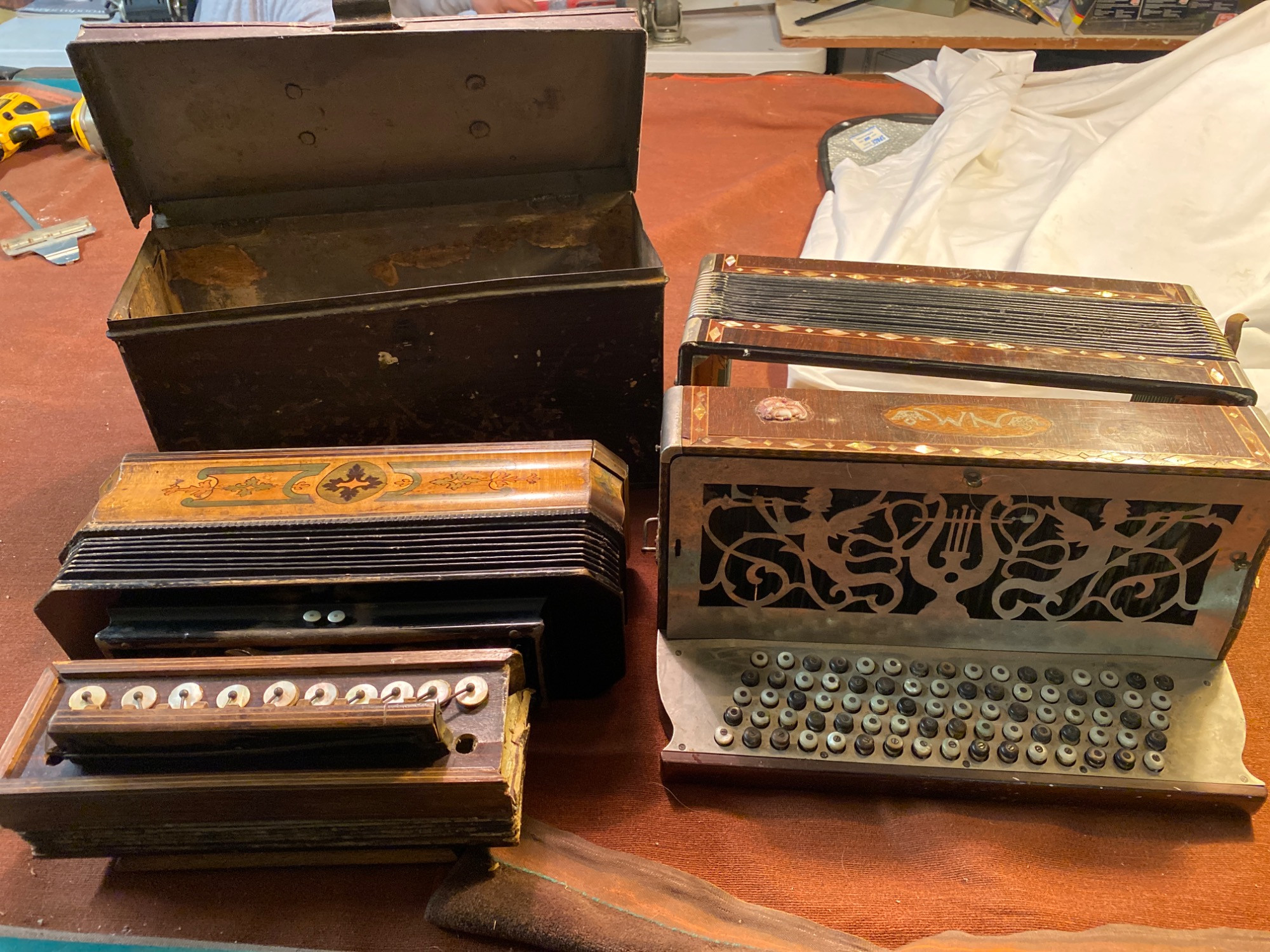 Offered as-is, a collection of three antique button accordions/concertinas. These vintage instruments present a unique opportunity for collectors and may require restoration or repairs.