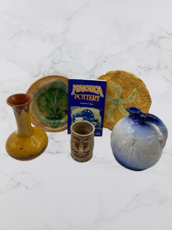 Lot # 101 - Majolica Ceramic Plates, Whimsical Face Mug, & Rare Rockingham Jug