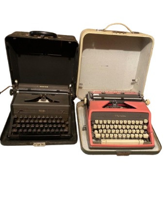 A classic pair of typewriters: a sleek black Royal and a charming coral Olympia from Western Germany. Both come with cases, making this a stylish and functional vintage set!