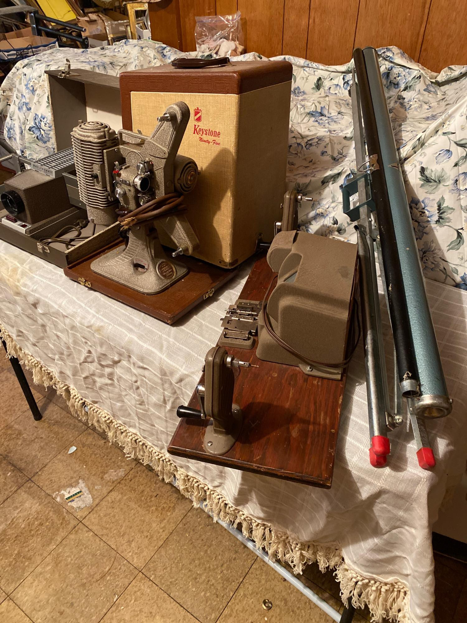 Popcorn & Projection: A Home Movie Night Time Capsule! Step back in time with this vintage collection: Bell & Howell Slide Projector Keystone 95 Projector Vintage Projecto Editor w/ Splicer Tower Portable Movie Projection Screen w/ Tripod 13 Travel-Themed Home Movies. All items are untested but perfect for display or restoration. Relive the golden era of home cinema!