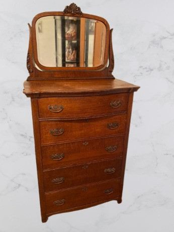 Five-Drawer Highboy Dresser w/ Beveled Mirror. Functional and elegant! All drawers glide smoothly—ready to store your treasures in style. Bidding on this lot is an agreement that: (1.) You will have 2 capable, able-bodied persons to lift and load at a minimum. (2.) You will bring a hand truck and/or any other tools needed to remove this item. If these steps are not followed your item will be forfeited and no refund given.