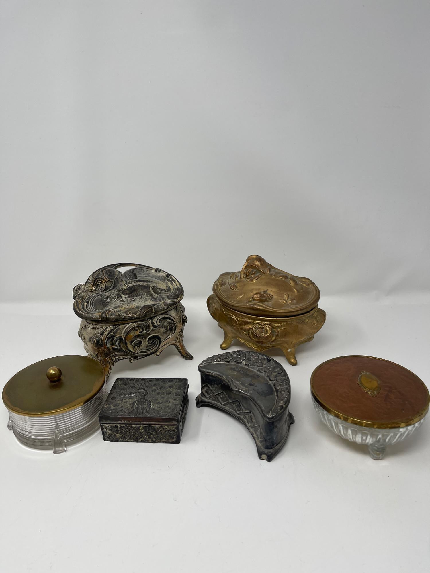 A charming collection of 2 rose-pattern trinket boxes, a crescent moon trinket box, an Art Deco glass vanity powder dish with a cover, and a square trinket box. Larger boxes measure approximately 5 inches tall by 6 inches wide. Smaller boxes range from 3 to 4 inches wide. Perfect for adding a touch of elegance to your vanity or gifting to a collector!