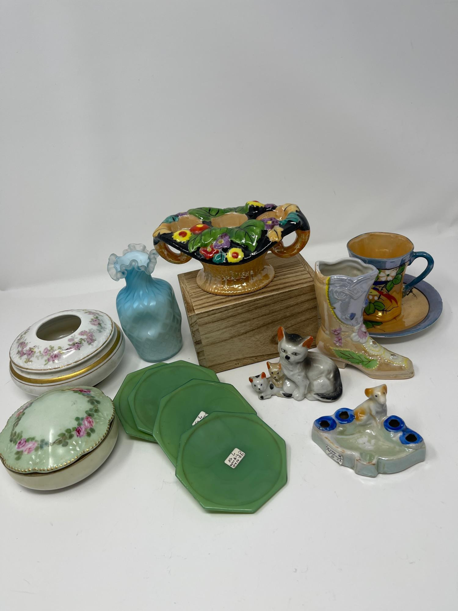 Discover Trinkets and Such (3”-5”) including a blue diamond vase, lusterware tea cup, floral candle holder, hand-painted trinket boxes, porcelain cat figurine, puppy dog ashtray, and more. A delightful collection of unique curios!