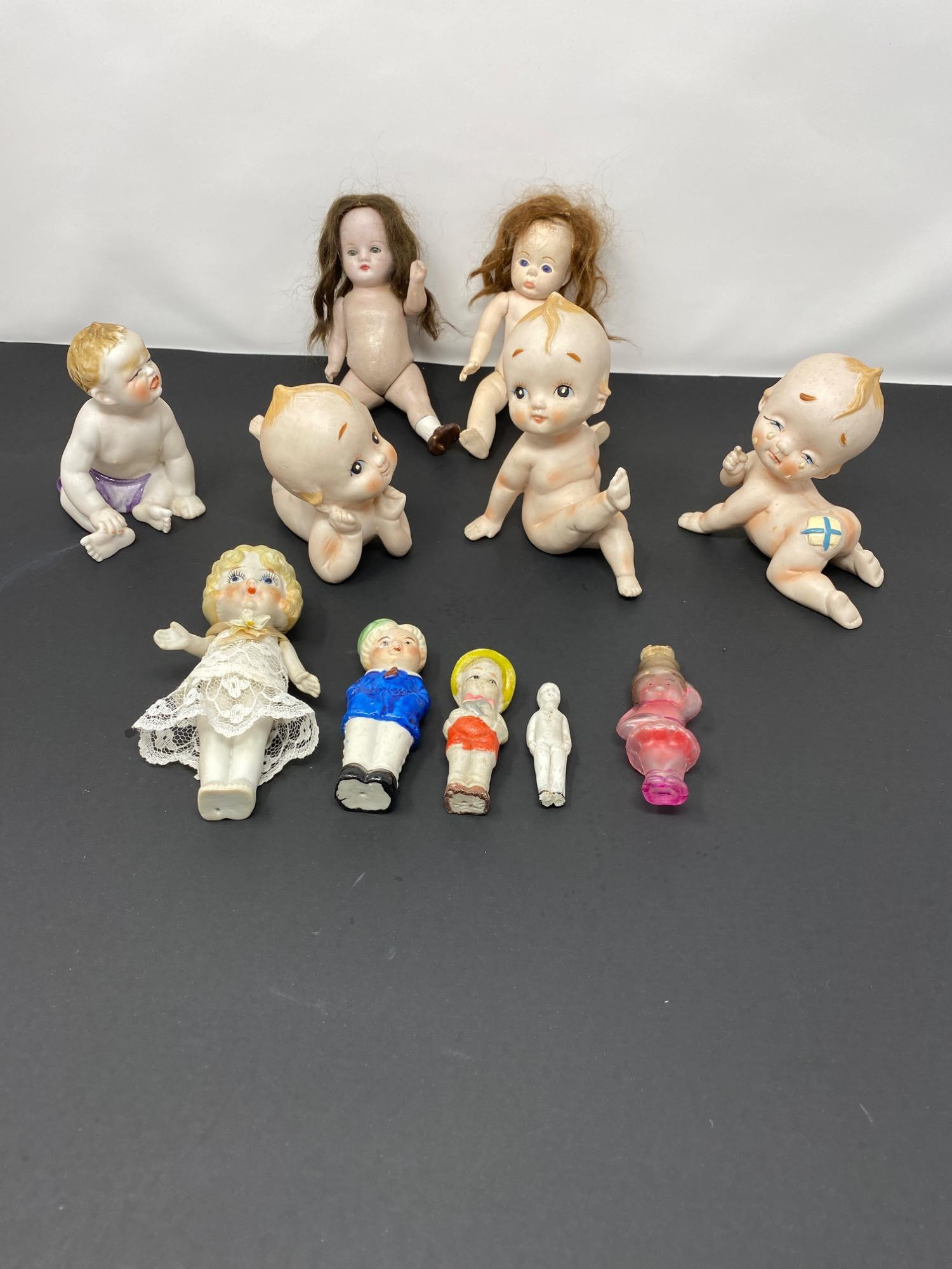 A delightful collection of antique dolls, including Frozen Charlottes (5” to 2”), Piano Babies (4”), and two charming Bebe’s (6”). Perfect for collectors or doll enthusiasts!