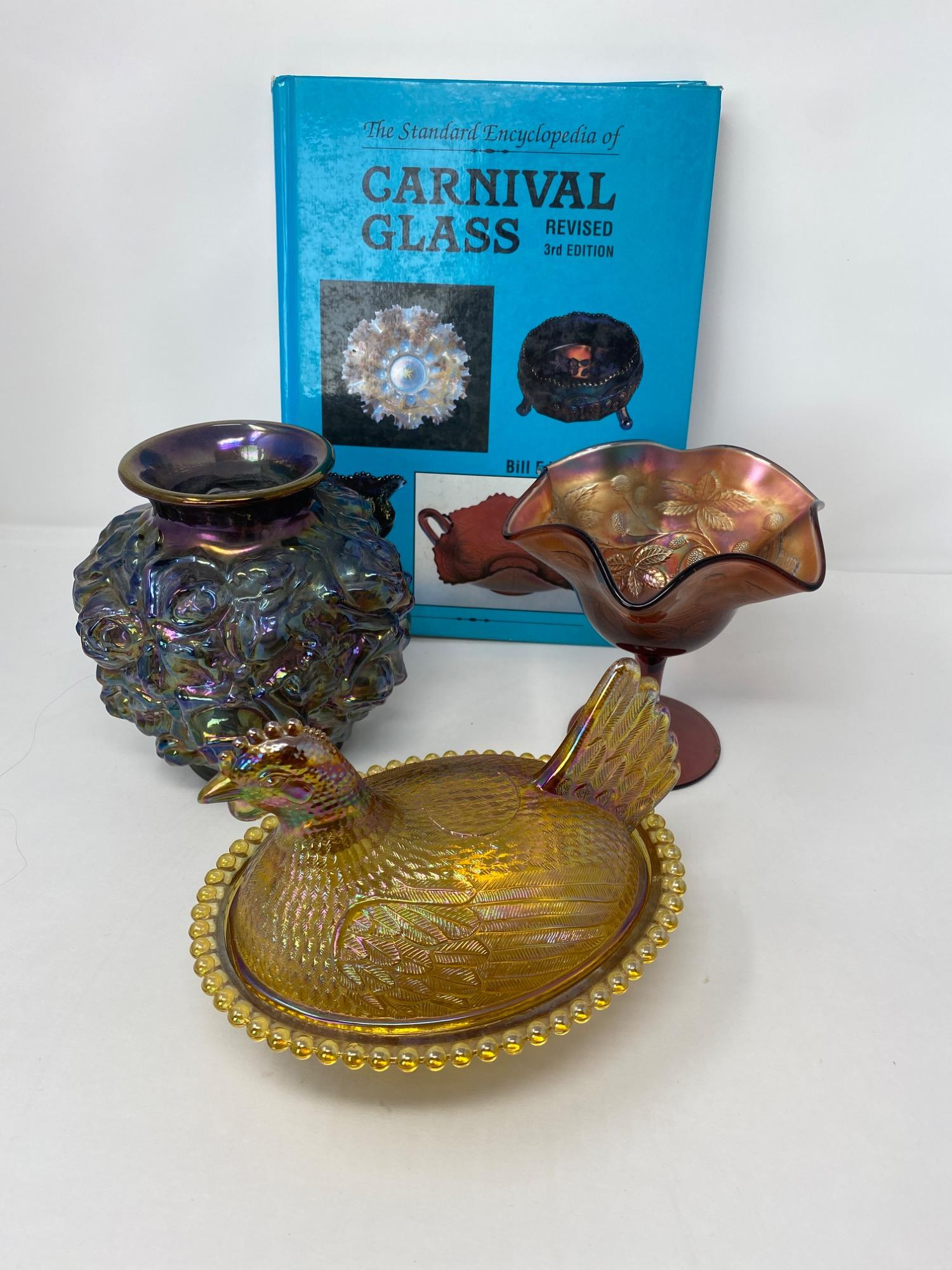 Lot # 134 - Carnival Glass Set: Smokey Vase, Hen on Nest, Candy Dish & Book