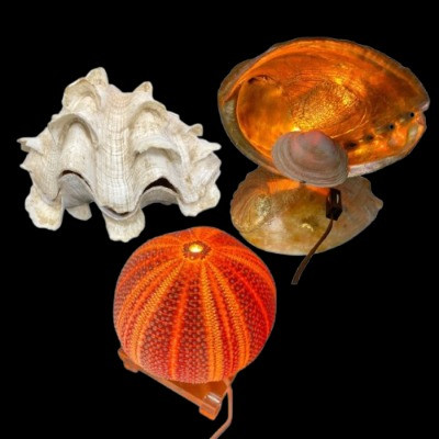 Dive into coastal charm with a French folk art 'Oursin' sea urchin lamp, an abalone shell accent lamp (8 1/2” tall x 8” wide), and a giant clam music box (9” x 5”). Unique ocean-inspired artistry for any collector or seaside enthusiast!